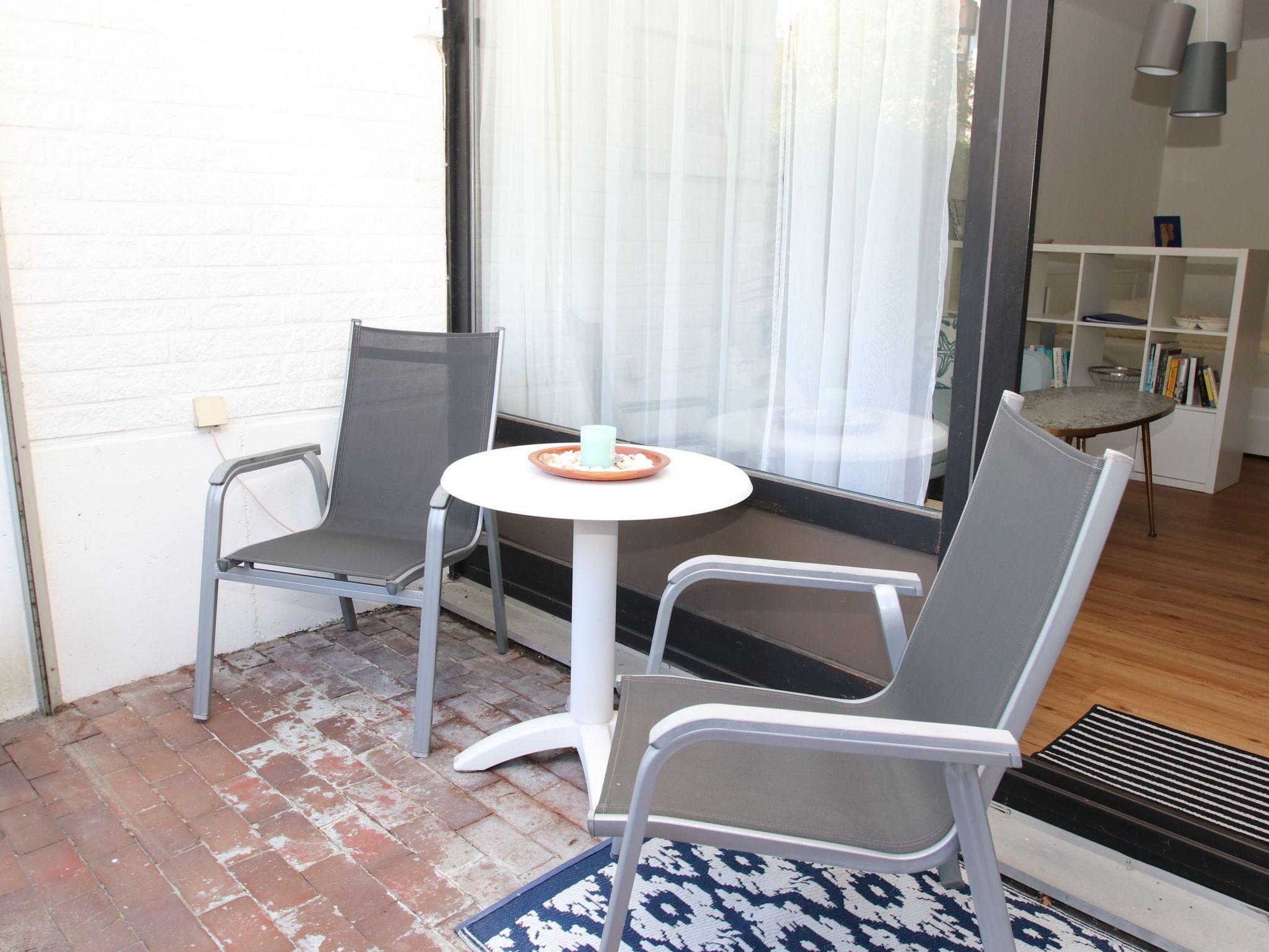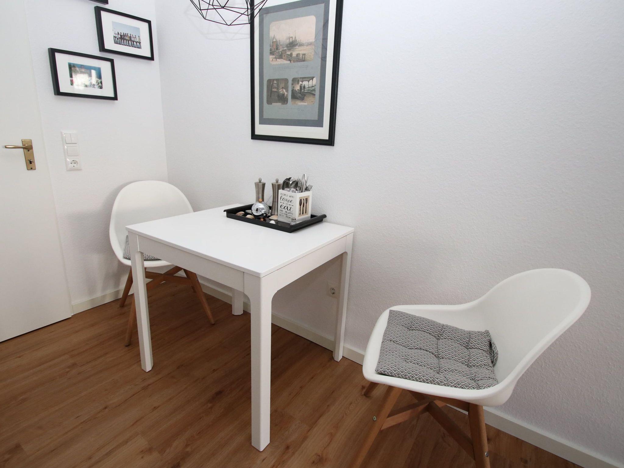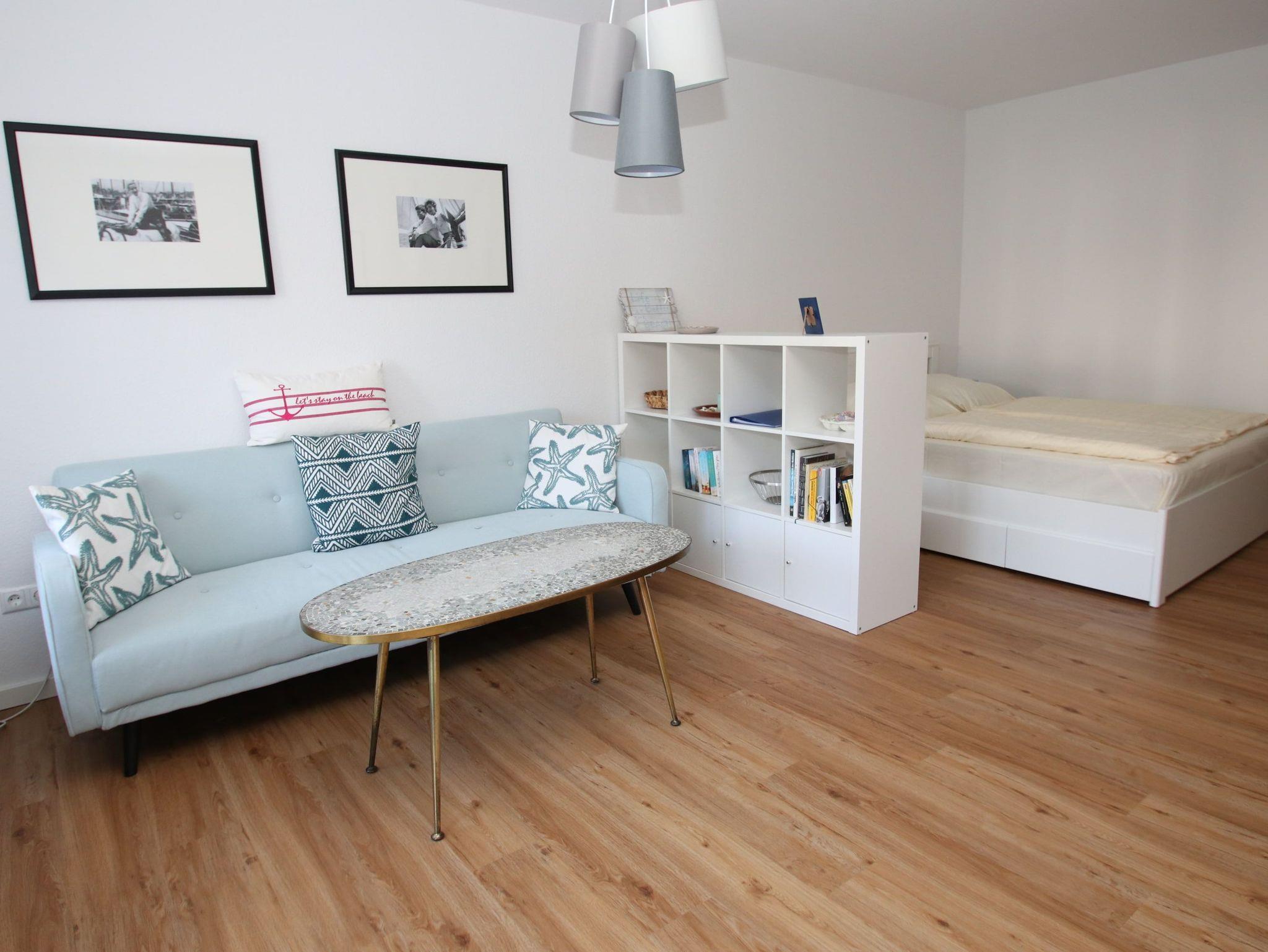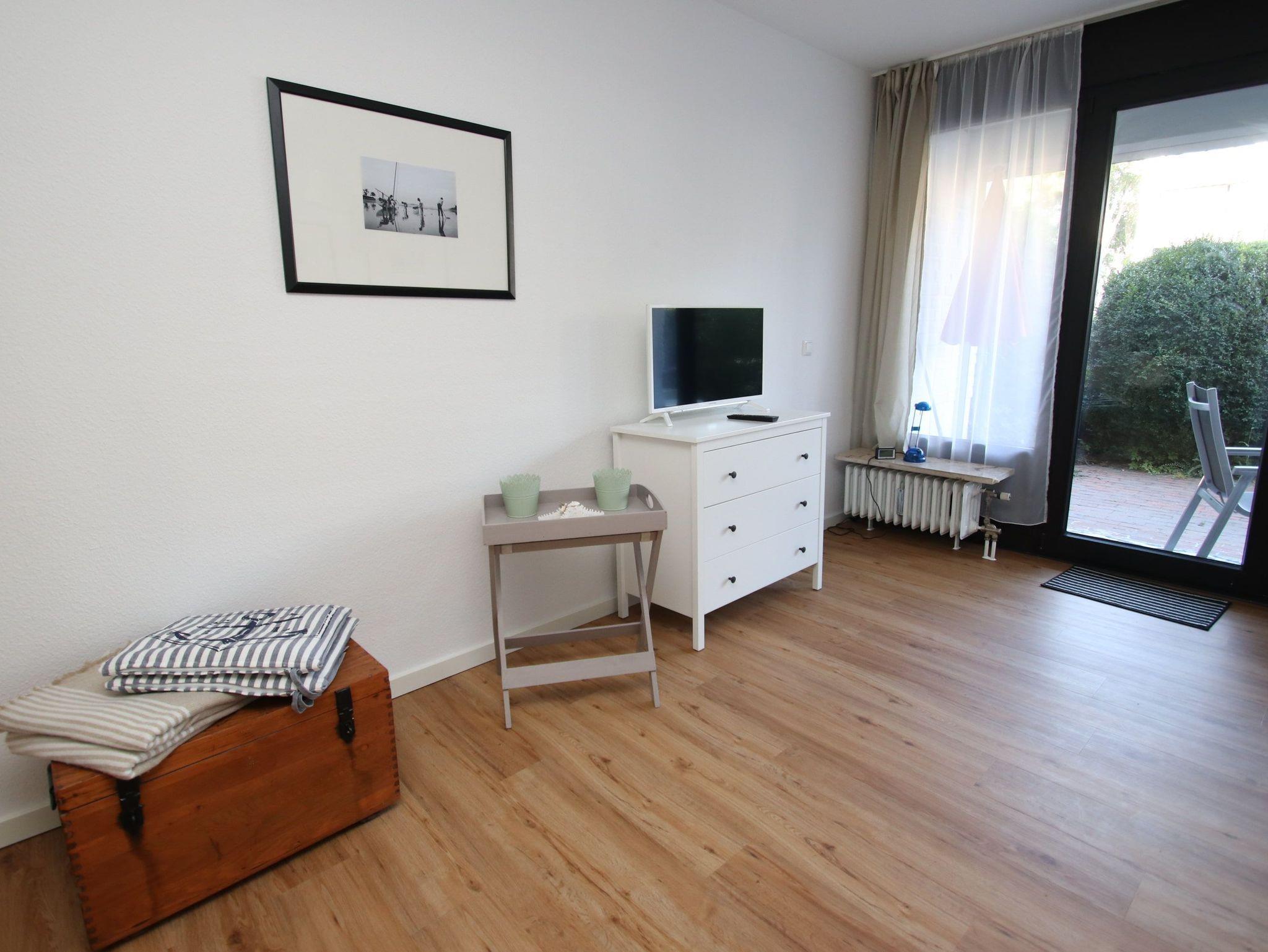 Dieses maritim eingerichtet Appartement liegt sehr Strandnah und lädt zum Wohlfühlen ein. Im Wohnraum befinden sich eine gemütliche Couch mit Tisch, eine Anrichte und ein komfortables Doppelbett (180 cm x 200 cm). Gegenüber der modernen [&] separaten Küche steht eine Essecke. Im Flurbereich, von dem das helle Bad abgeht, finden Sie einen Kleiderschrank vor. Die sonnige Terrasse mit Blick in die Grünanlage lädt zum Verweilen ein.