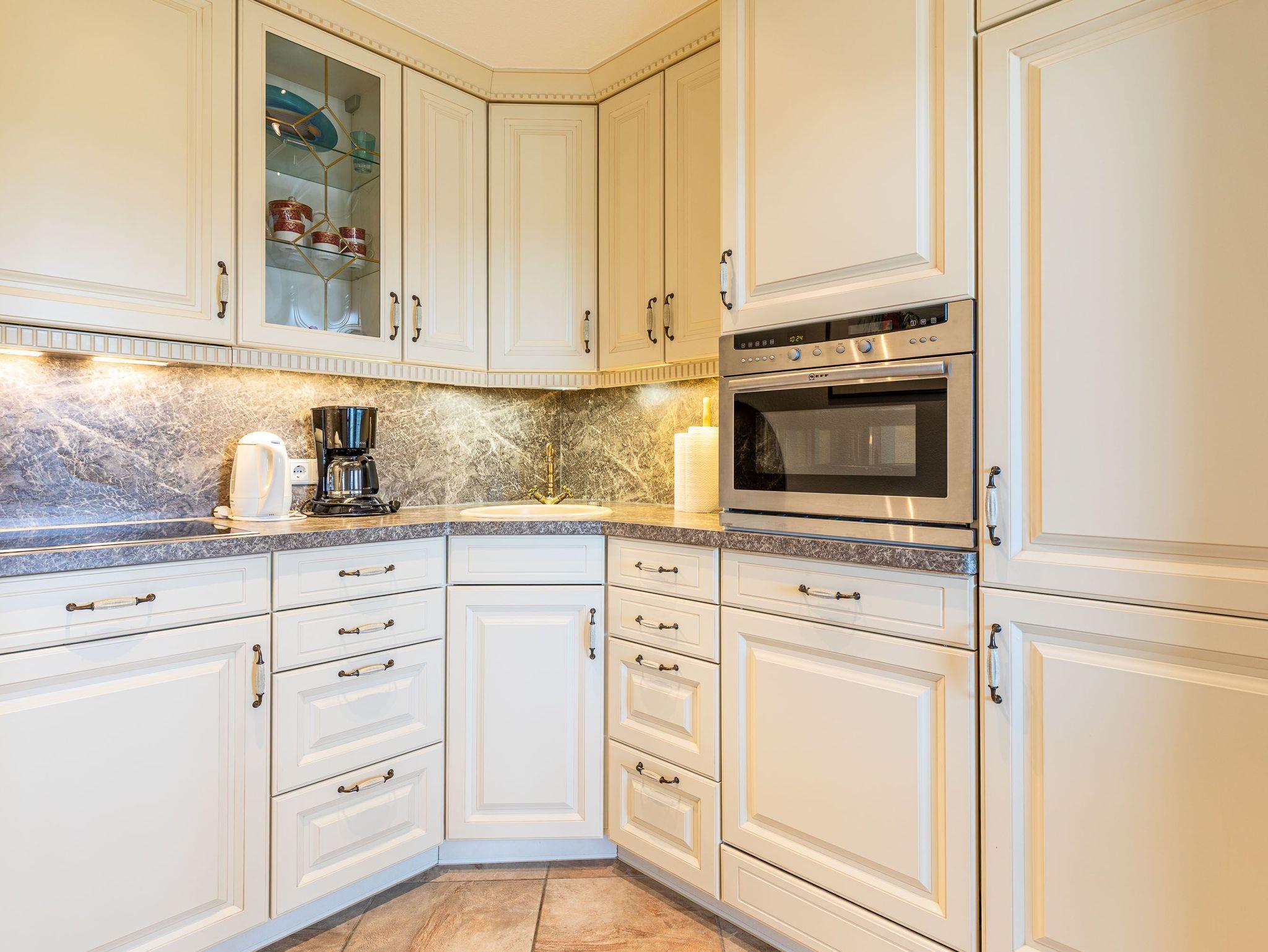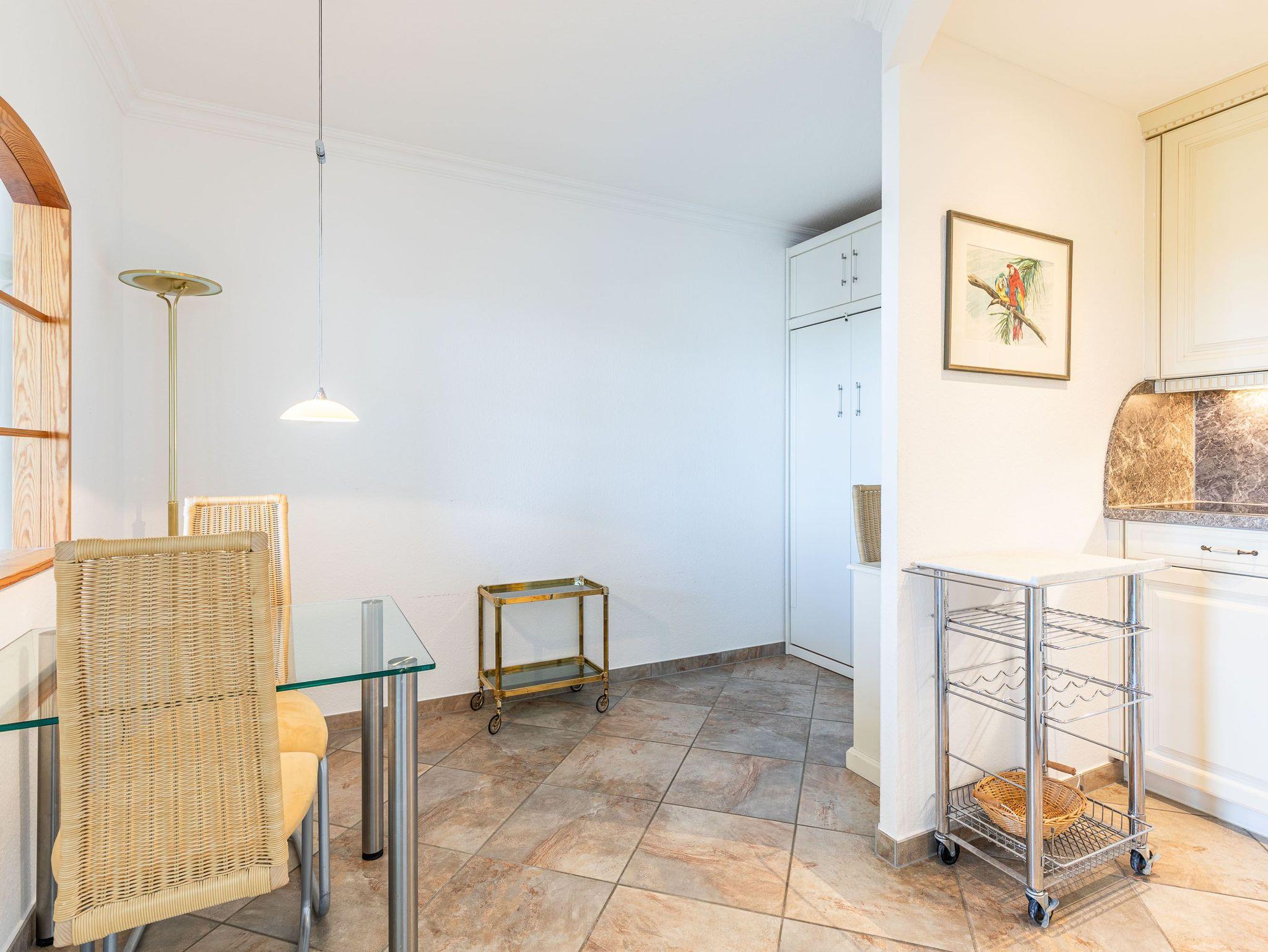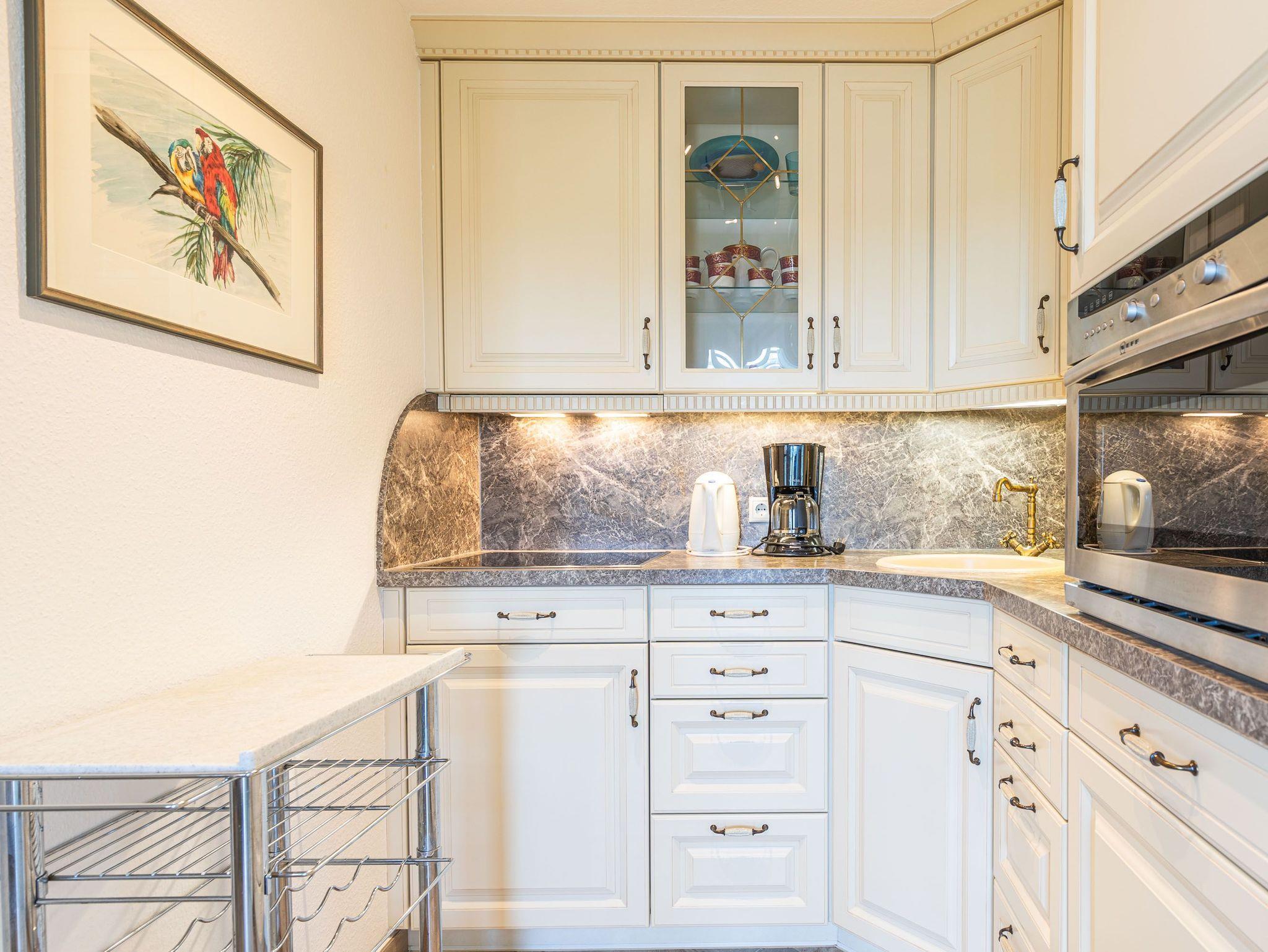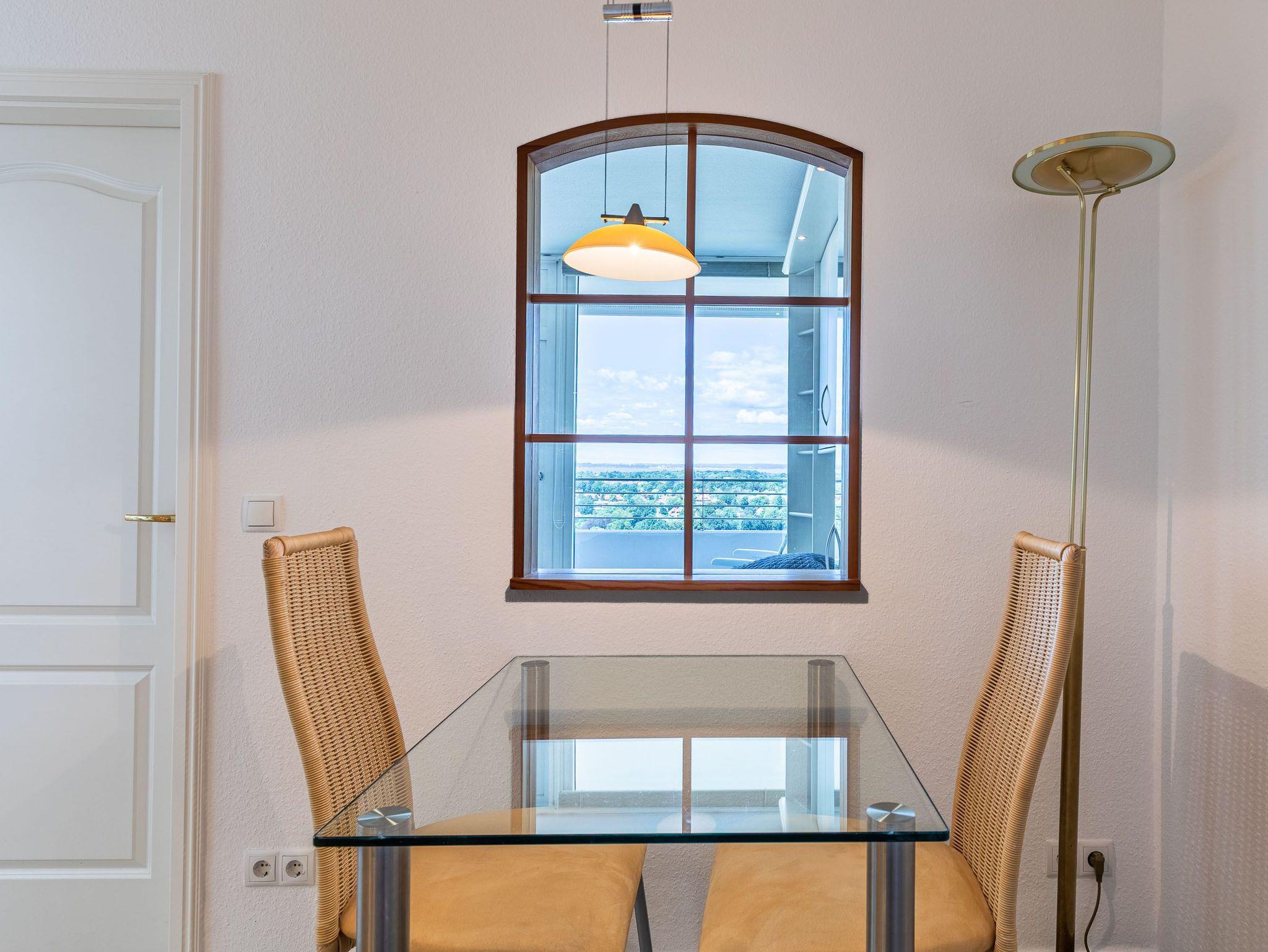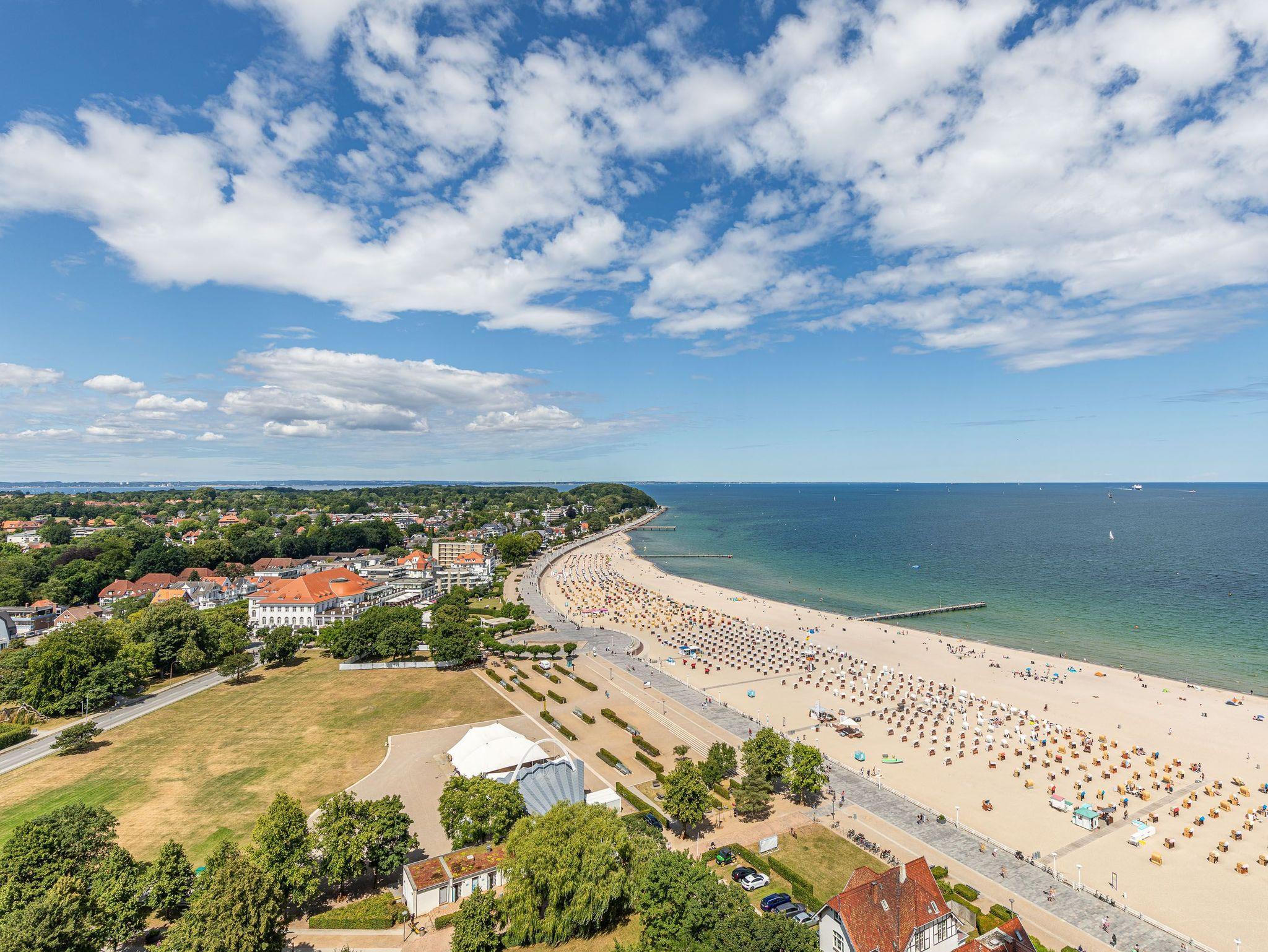 Exklusiv und neuwertig mit vielen Extras übertrifft dieses Appartement alle Erwartungen. Beim ersten Blick vom Flur ins Wohnzimmer werden Sie über die helle Eckcouch und den Glasvitrinenschrank mit eingebautem Elektrokamin staunen. Das separate Badezimmer ist in weiß gehalten sowie auch die vom Flur abgehende Küche mit Essecke und Stühlen. Im Schlafzimmer erwarten Sie ein komfortables Doppelbett (2x 90 cm x 200 cm), das in einem Einbauschrank mit Ablagen integriert ist und ein Kleiderschrank. Eine weitere Schlafmöglichkeit bietet ein Einzelschrankbett (90 cm x 200 cm), das sich neben der Einbauküche befindet. Das originelle Design ist eine gelungene Kombination aus modernem Stil und individuellem Charakter. Vom Wohn- und Schlafzimmer erreichen Sie den großen Balkon, um den herrlichen Ausblick auf den Strand und die Lübecker Bucht zu genießen.