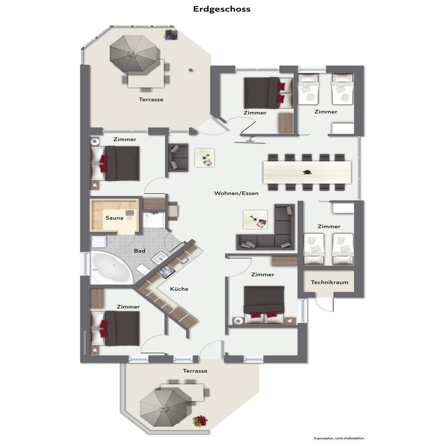 Das Ferienhaus bietet auf großzügigen 121 m² Platz für bis zu 12 Personen und eignet sich wunderbar für einen Familienurlaub oder Urlaub mit Freunden. Es verfügt über insgesamt 6 Schlafräume: