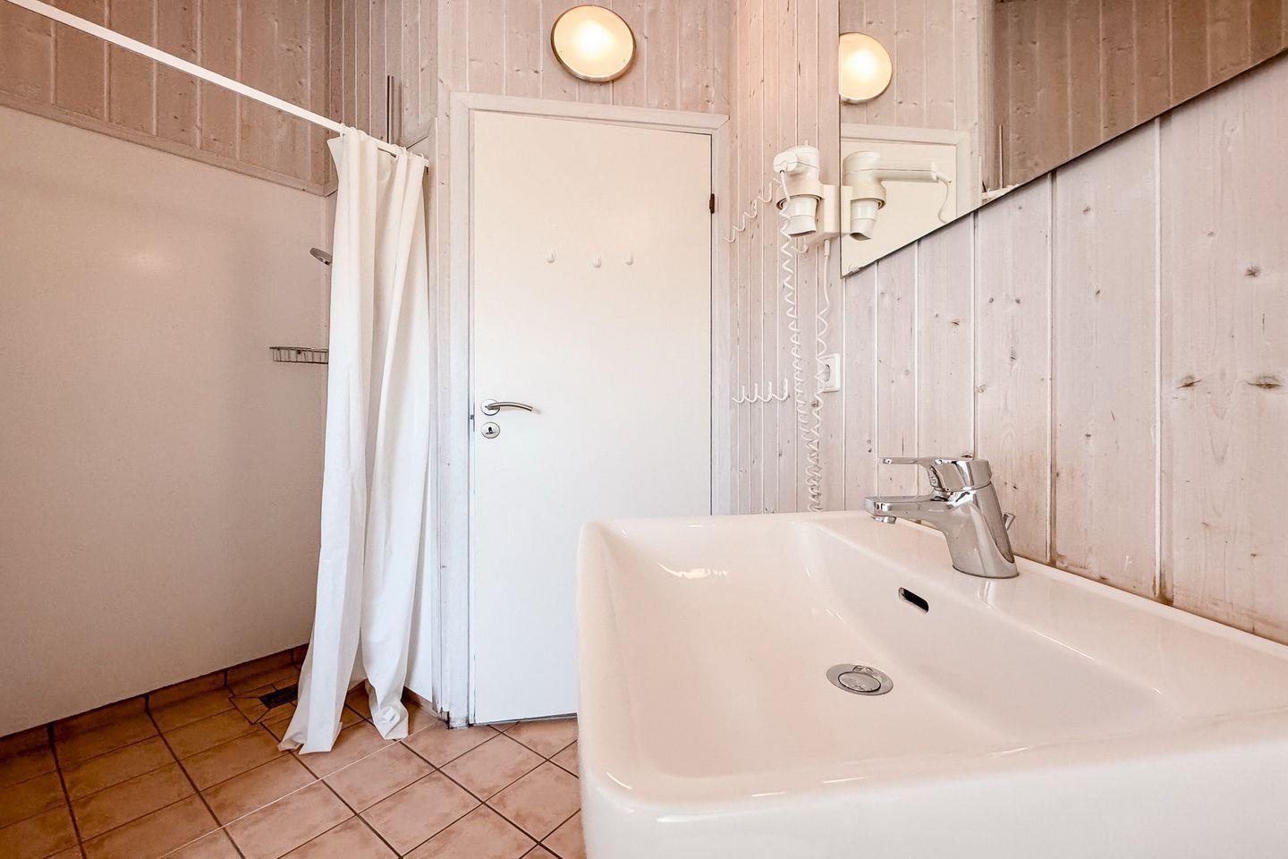 - Ein Waschtisch mit Waschbecken und eine bodentiefe Dusche