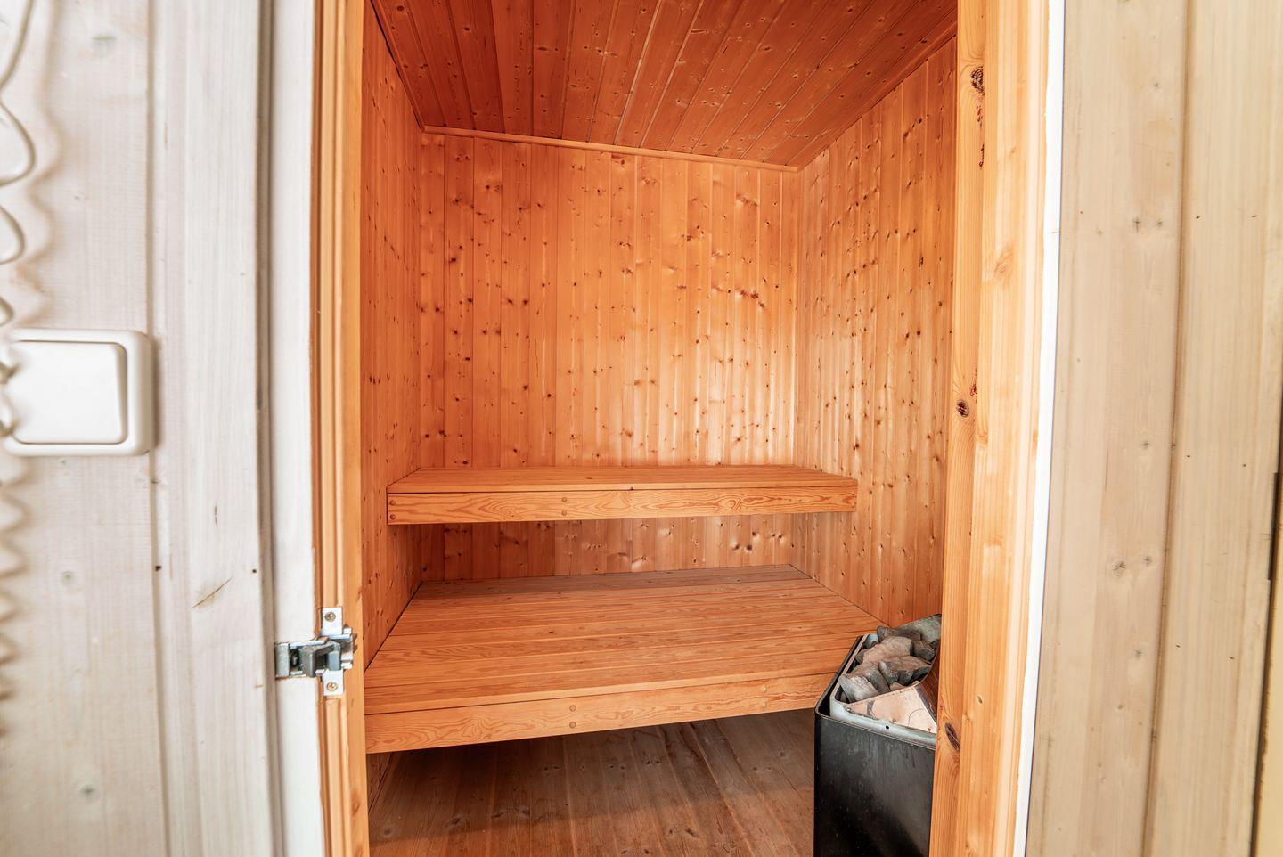 Das Badezimmer bietet eine Sauna, einen Whirlpool (für bis zu 2 Personen), eine bodengleiche Dusche, ein WC und ein Waschbecken.