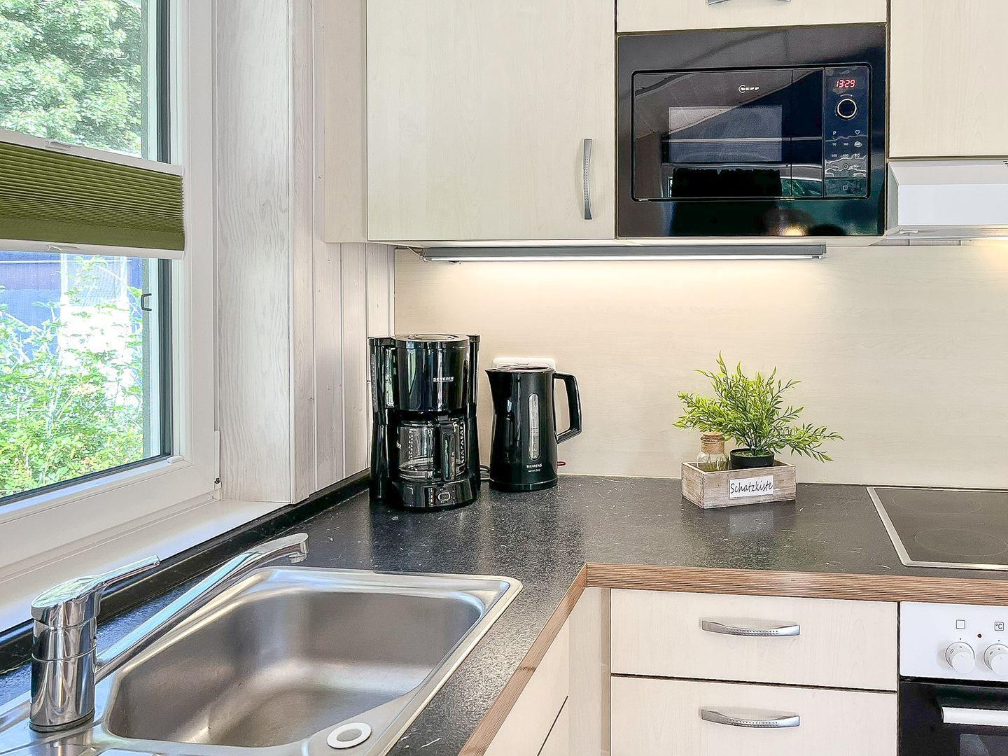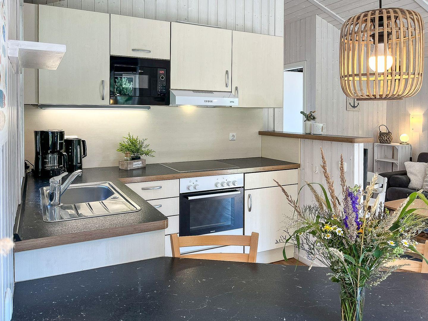 Die angrenzende Küchenzeile ist komplett ausgestattet und macht Selbstverpflegung ganz einfach: