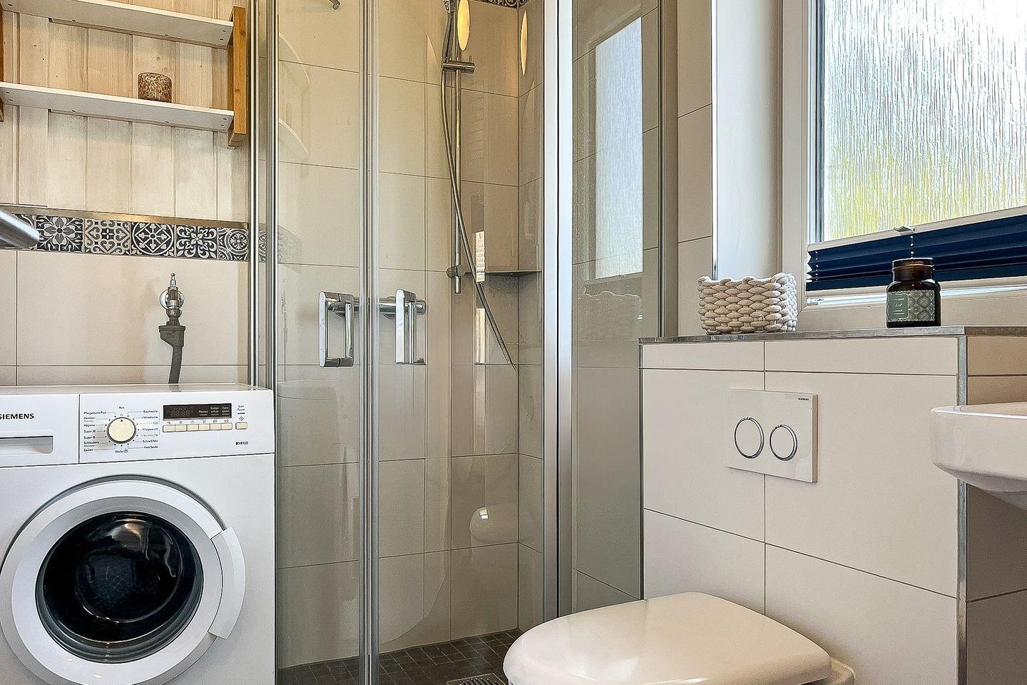 Im Badezimmer findest Du eine bodengleiche Dusche, ein WC, ein Waschbecken sowie einen Haartrockner. Die Waschmaschine steht Dir zur Eigennutzung zur Verfügung.