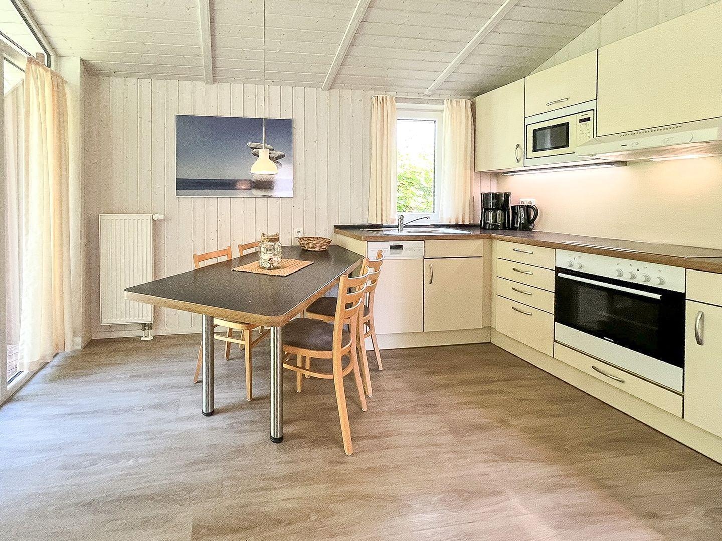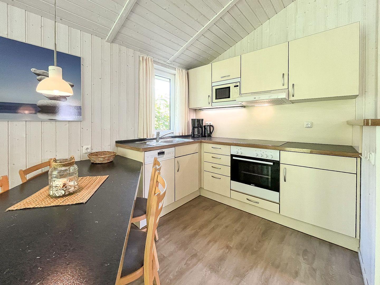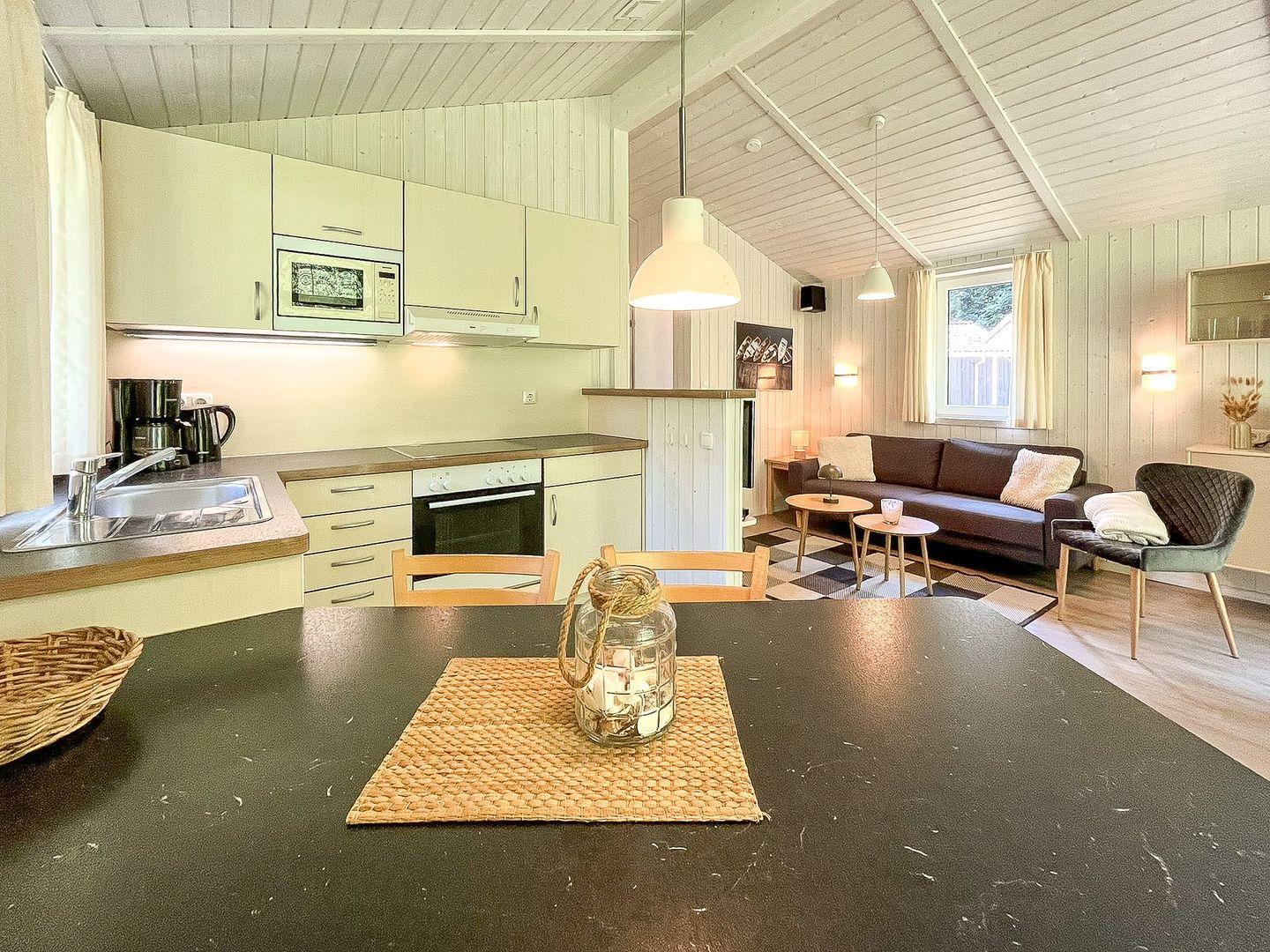 Die gut ausgestattete Küchenzeile ist offen in den Wohnraum integriert und bietet Dir alles für die Selbstverpflegung: