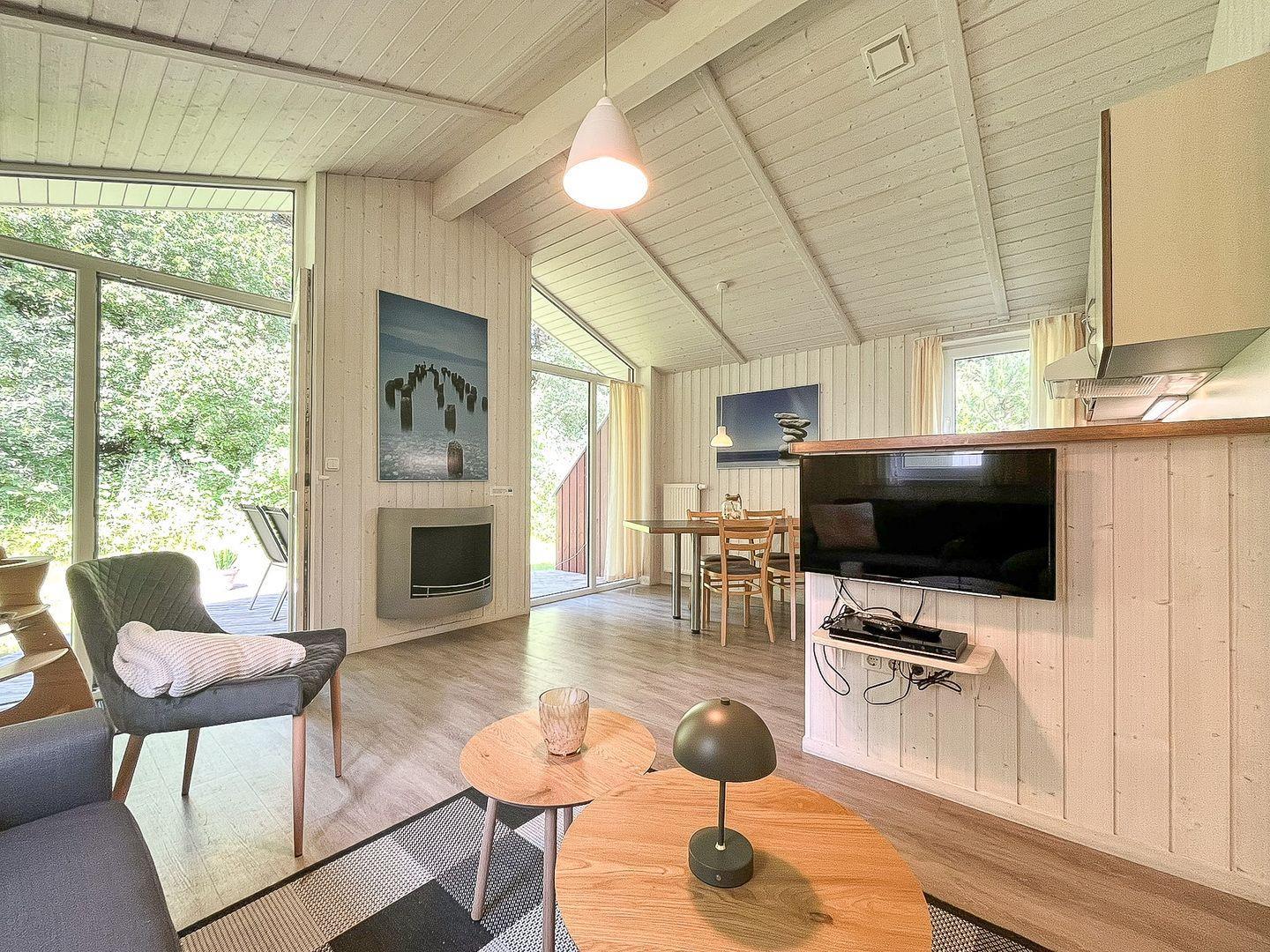 Der offene Wohn- und Essbereich ist freundlich und modern eingerichtet. Ein bequemes Sofa, ein Sessel sowie ein Flachbild-TV (Satellitenempfang), DVD-Player, CD-Player und Radio sorgen für Unterhaltung. Große Fenster lassen viel Licht herein und schaffen eine einladende Atmosphäre.