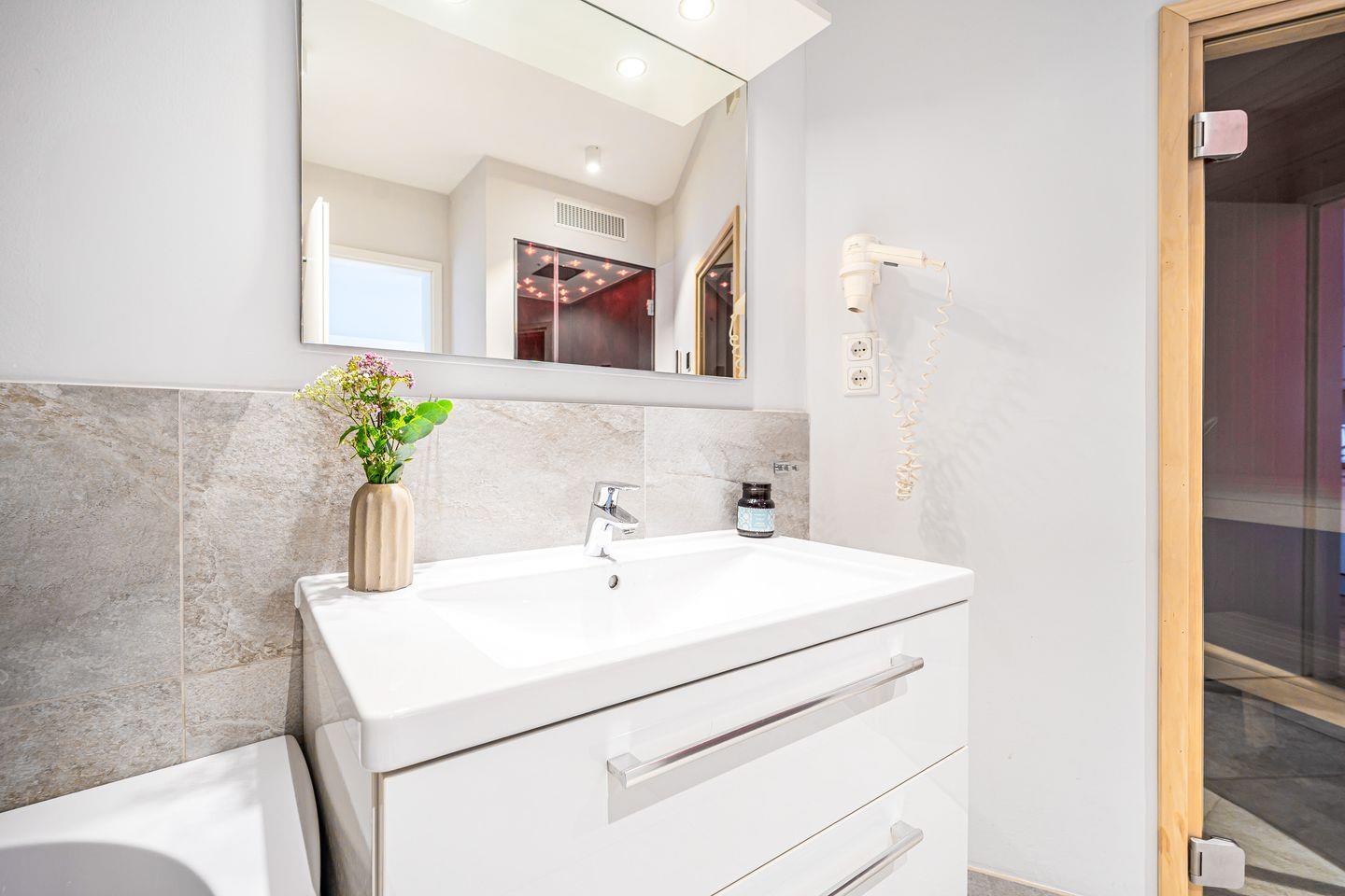 Ein Highlight ist Dein ganz persönlicher Wellnessbereich im Badezimmer: Sauna, moderne Badewanne mit wohltuender Whirlpool-Funktion und ein Dampfbad mit integrierter Regendusche sorgen für pure Entspannung.