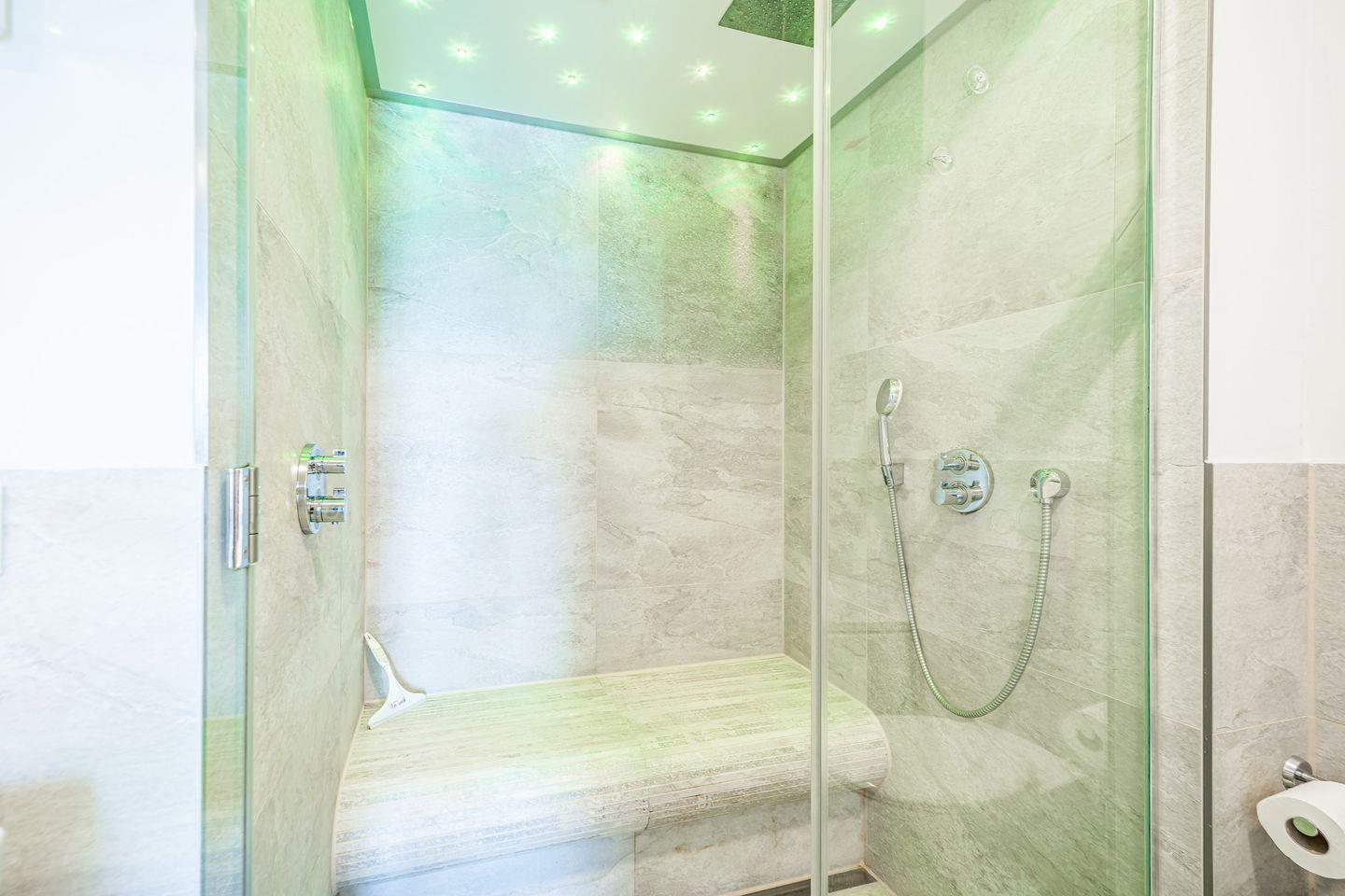 Im Badezimmer am Schlafzimmer findest Du eine Whirlpoolbadewanne, ein Dampfbad mit integrierter Doppelregendusche, WC und Föhn.