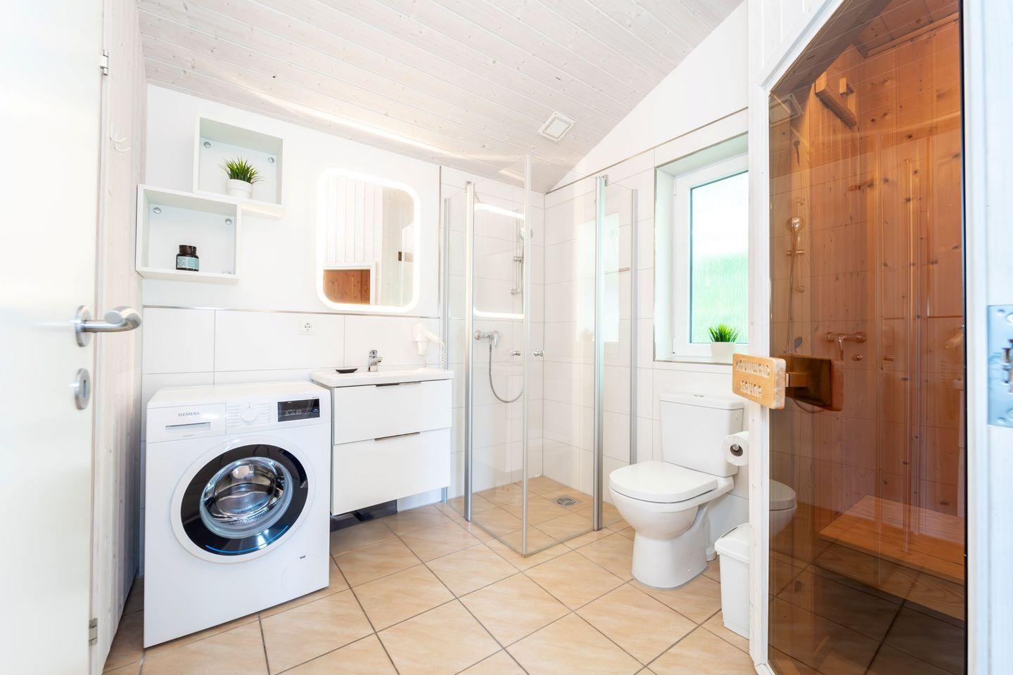 Im Badezimmer erwarten Dich eine bodengleiche Dusche, WC, Waschbecken sowie ein Haartrockner. Auch die Waschmaschine ist hier untergebracht.