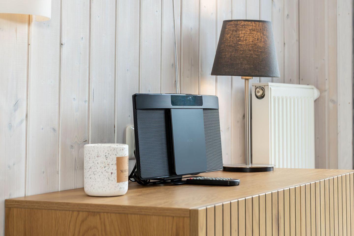 Der offene Wohn- und Essbereich ist mit Sofa, Sessel und Esstisch eingerichtet. Unterhaltung bieten ein TV mit Satellitenanschluss, eine HiFi-Anlage sowie ein Radio. Für gemütliche Abende sorgt der Bioethanolofen.