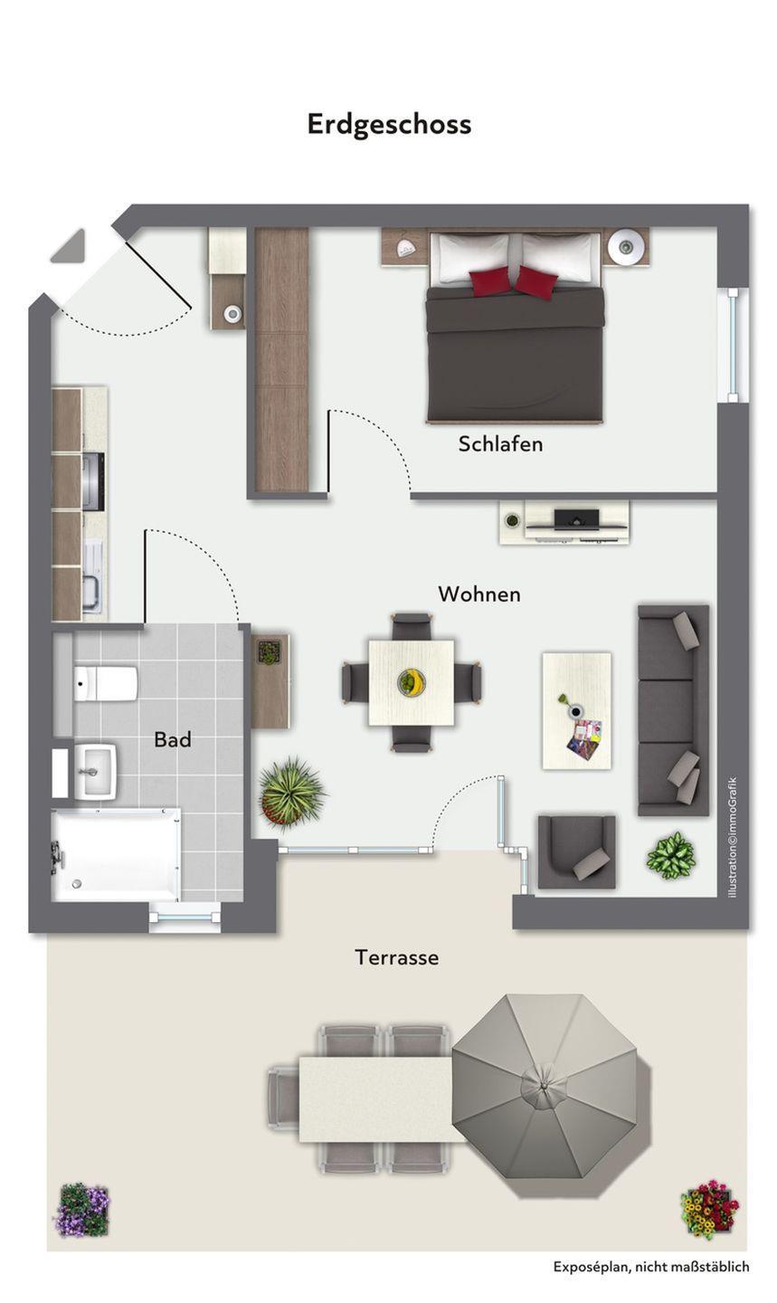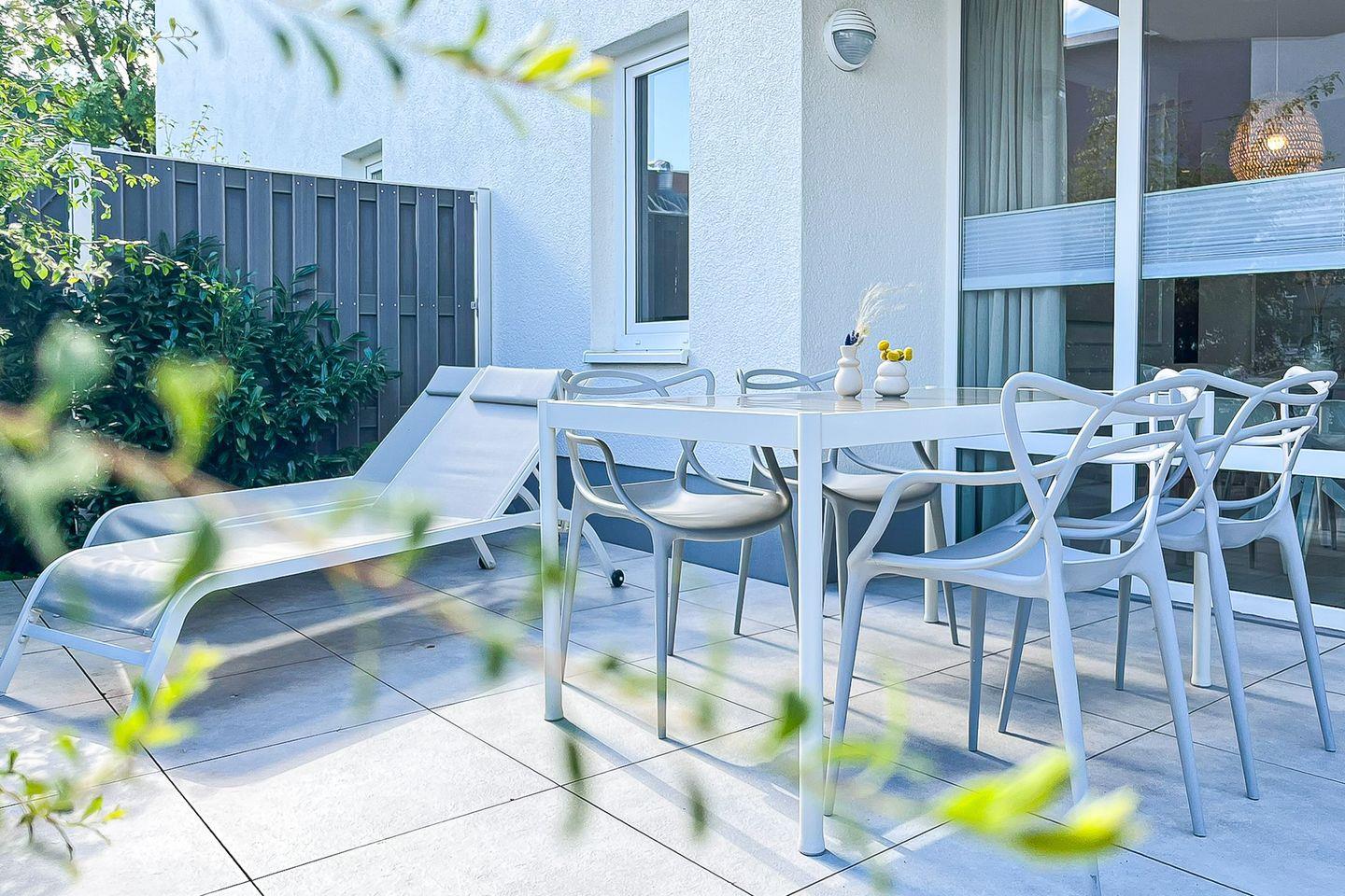 Bodentiefe Fenster verleihen dem Raum eine einladende, freundliche Atmosphäre. Von hier aus gelangen Sie auf die möblierte Terrasse mit Gartenmöbeln, die viel Platz für gemeinsame Mahlzeiten oder erholsame Stunden im Freien bietet.