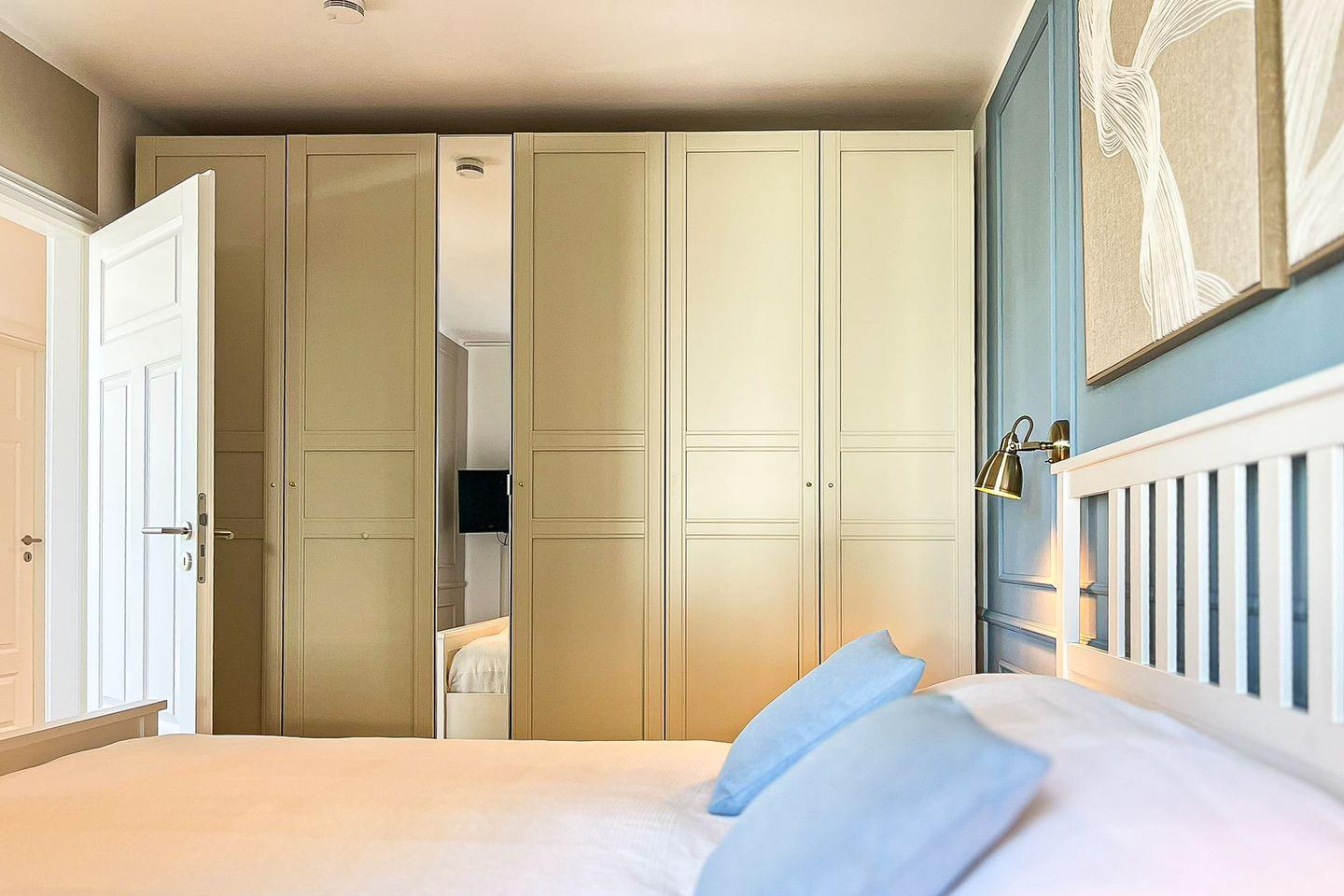 Das Schlafzimmer bietet ein komfortables Doppelbett (2 x 90 x 200 cm) und stilvolles Interieur. Ein geräumiger Kleiderschrank sorgt für genügend Stauraum für Ihre Urlaubsgarderobe.