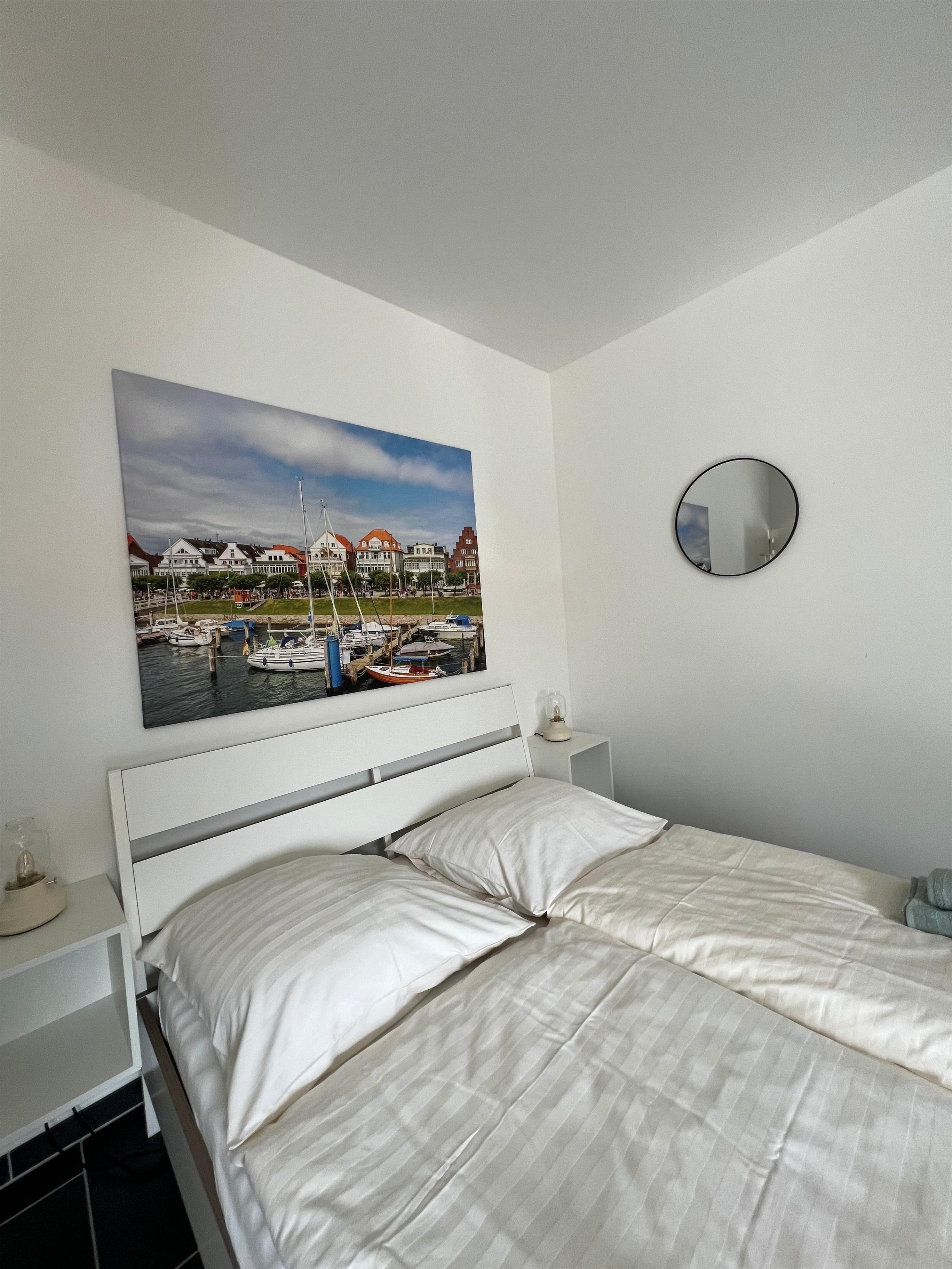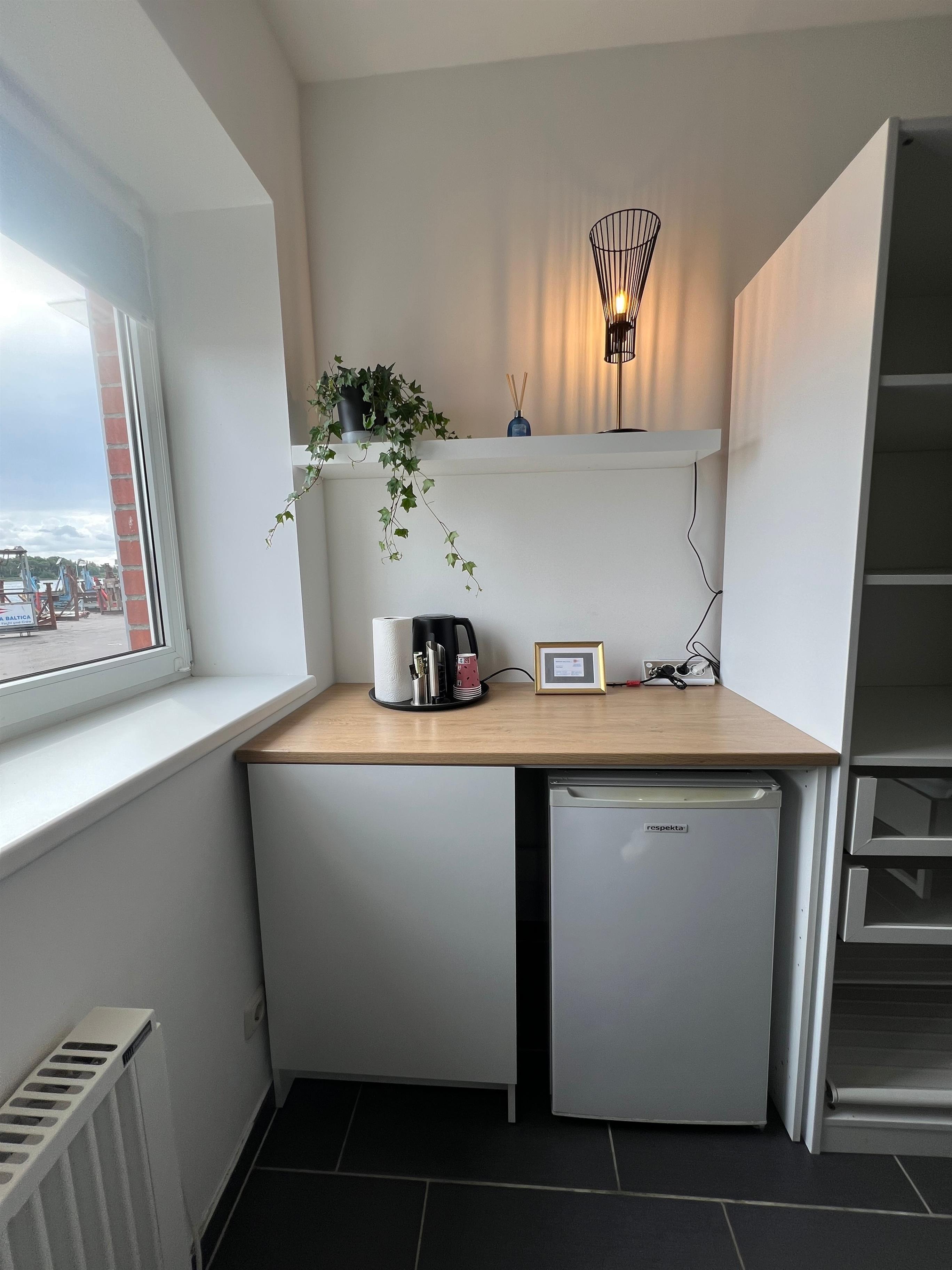 Die Zimmer sind mit einem geräumigen Kleiderschrank inklusive ausziehbarem Schuhregal und großen Schubladen eingerichtet . Die Sitzecke bietet einen individuell beleuchteten Rückzugsort mit Aussicht auf den Hafen. Der Essplatz ist als Tresen gestaltet und bietet Ausblicke auf die Trave. Ein schönes Doppelbett mit hochwertiger Matratze (zwei Härtegrade) komplettiert die Einrichtung. Im Zimmer befinden sich Kühlschrank und Wasserkocher. Eine Grundausstattung Geschirr kann ausgeliehen werden. Handtücher, Bettwäsche, Strom und Wasser sind im Preis