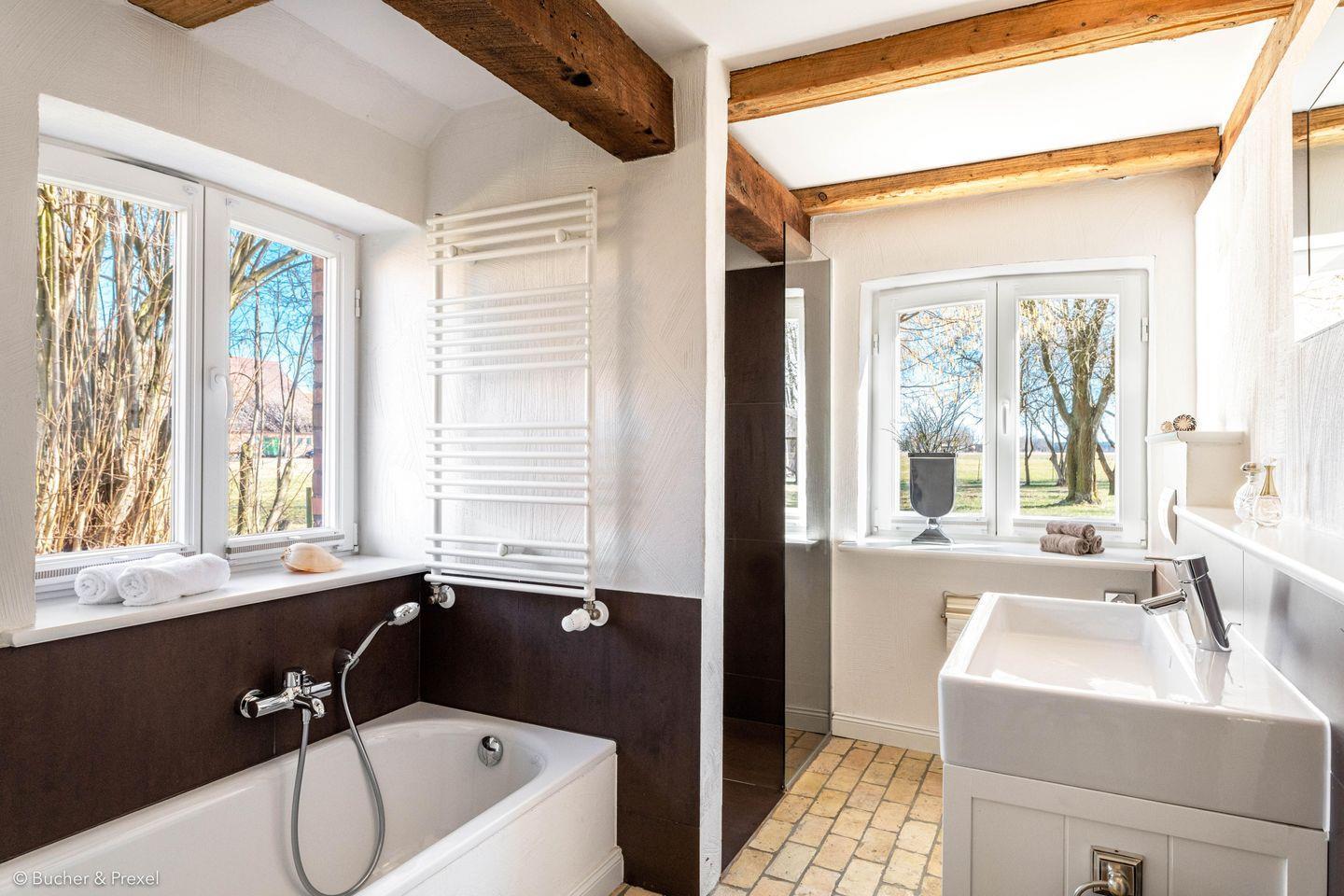 Das in erdnahen Tönen gestaltete Badezimmer mit Dusche und Badewanne verfügt über eine Handtuchheizung und ausreichend Ablagemöglichkeiten für deine persönlichen Kosmetikprodukte. Handtücher und einen Haartrockner bekommst du von uns gestellt. Das Apartment bietet außerdem ein zusätzliche kleine Gästetoilette.