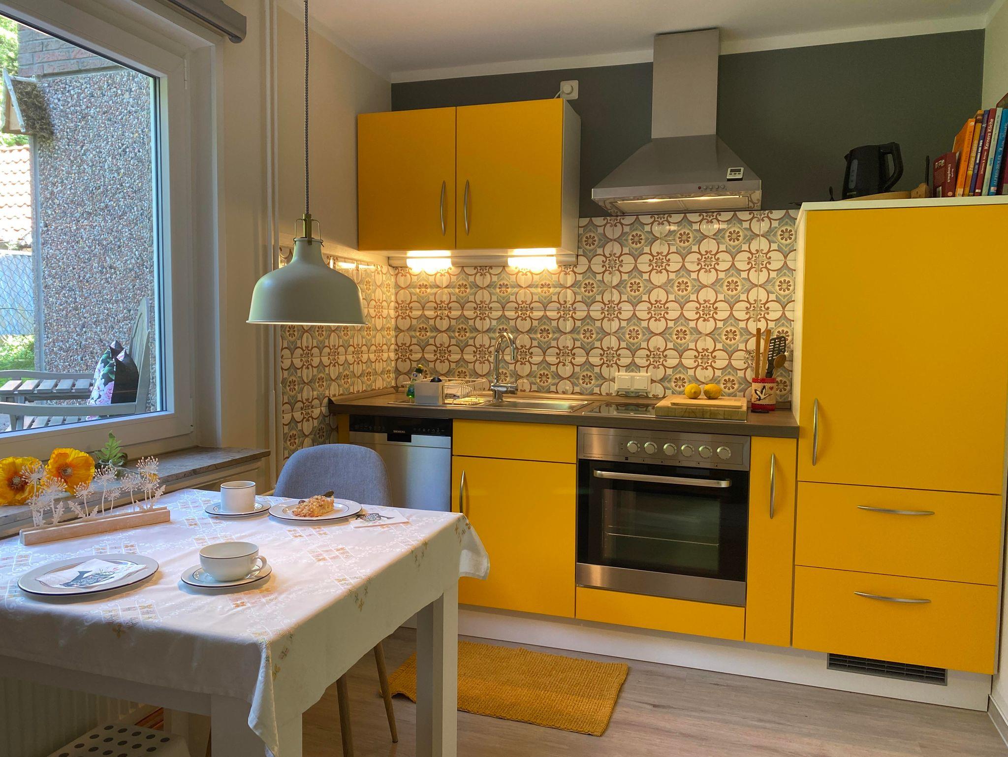Die Küche ist ausgestattet mit Kühlgefrierschrank, Backofen, Cerankochfeld, Geschirrspüler, Dunstabzugshaube, Mikrowelle, Kaffeemaschine, Toaster und Wasserkocher.