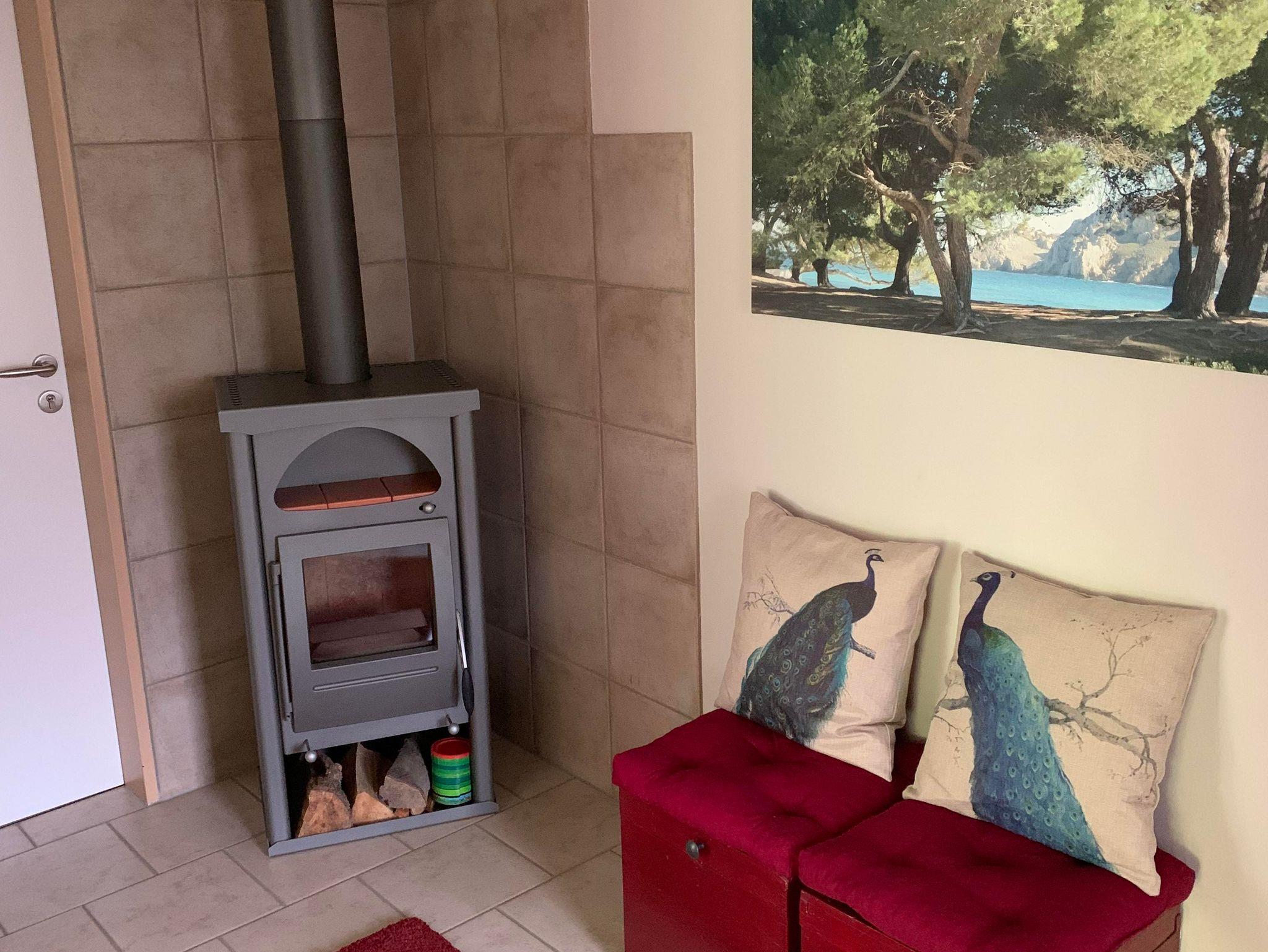 Für einen kuscheligen Lesenachmittag finden Sie ausreichend Lesestoff. Ein Kaminofen sorgt für eine heimelige Atmosphäre, wenn es mal kein Draußenwetter ist.