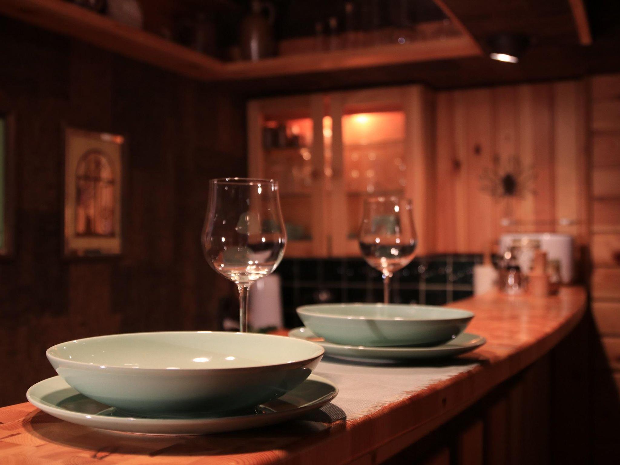 Die gesamte Einrichtung ist aus Naturmaterialien und allergikerfreundlich, zudem sehr gemütlich. Die Küche ist voll ausgestattet: Herd, Mikrowelle, Wasserkocher, Elektro Fritteuse, Kühlschrank. An einer Theke kann man sich bei einem Glas Wein auf das Essen freuen.