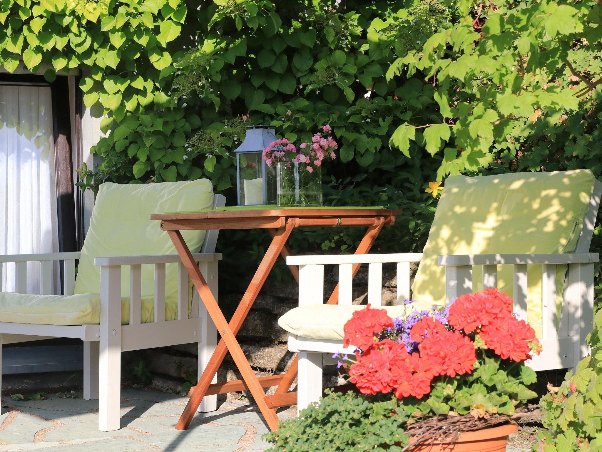 Die Terrasse ist mit Gartenmöbeln und Liegen und Grill ausgestattet. Sie steht den Gästen ebenso wie der Garten mit Panoramablick zur Alleinnutzung zur Verfügung. Ihr Auto können die Gäste unter einem Carport abstellen, die Fahrräder ebenso.