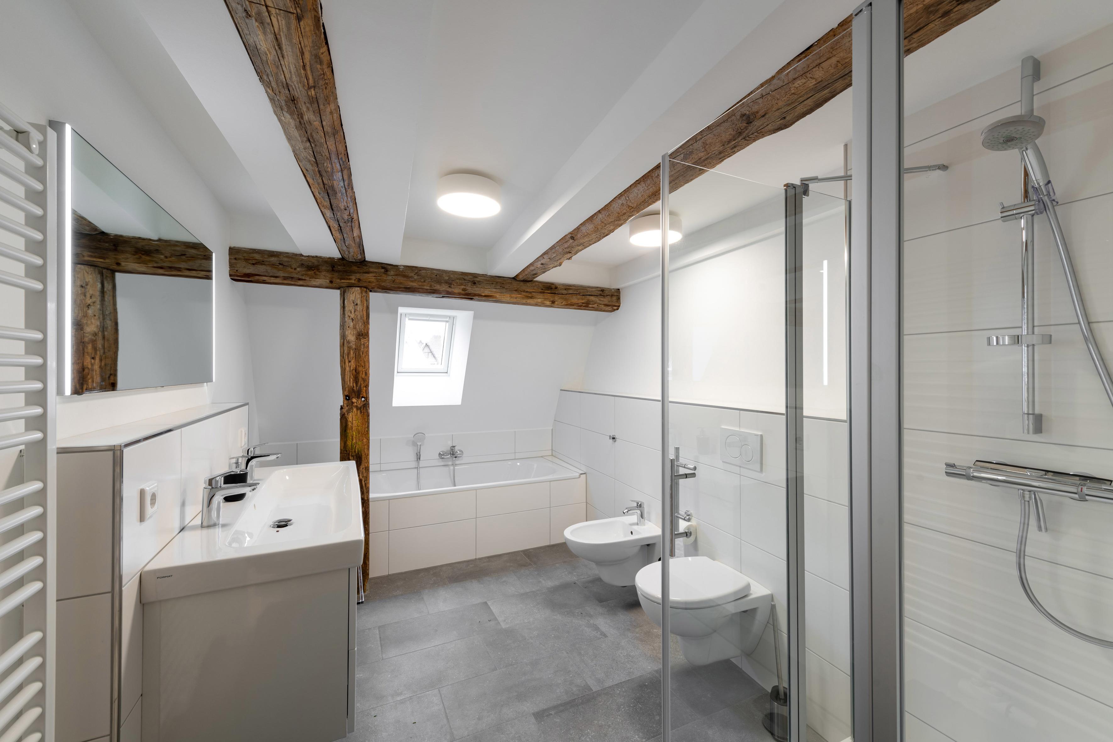 Geräumige Badezimmer mit Fenster und viel Tageslicht, Dusche, Wanne, Bidet, 2 Waschbecken, beheizbarem Spiegel, Fön, Vergrößerungsspiegel, Handtücher, Kosmetiktücher