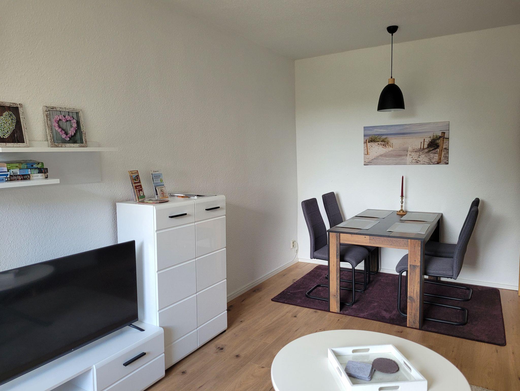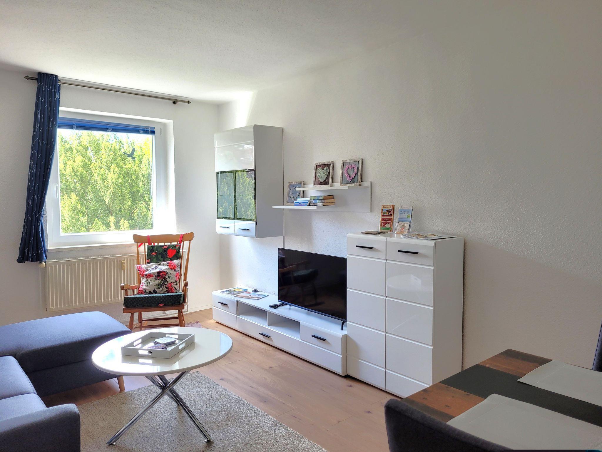 Die renovierte 46m große 2-Raum-Wohnung befindet sich im 1. OG (Treppe) und bietet Platz für 3 Personen mit maximal 2 Hunden. Die hundefreundliche Ferienwohnung verfügt über ein Schlafzimmer mit Doppelbett (1,60m breit) und großem Kleiderschrank. Das moderne Wohnzimmer verfügt über einen Smart-TV (Satellitenanschluß und IInternet), ein gemütliches Ecksofa (Aufbettung 3. Person) und einen großzügigen Esstisch für 4 Personen. Sollte statt der Schlafcouch lieber ein Zustellbett gewünscht sein, wird dieses kostenfrei zur Verfügung gestellt.