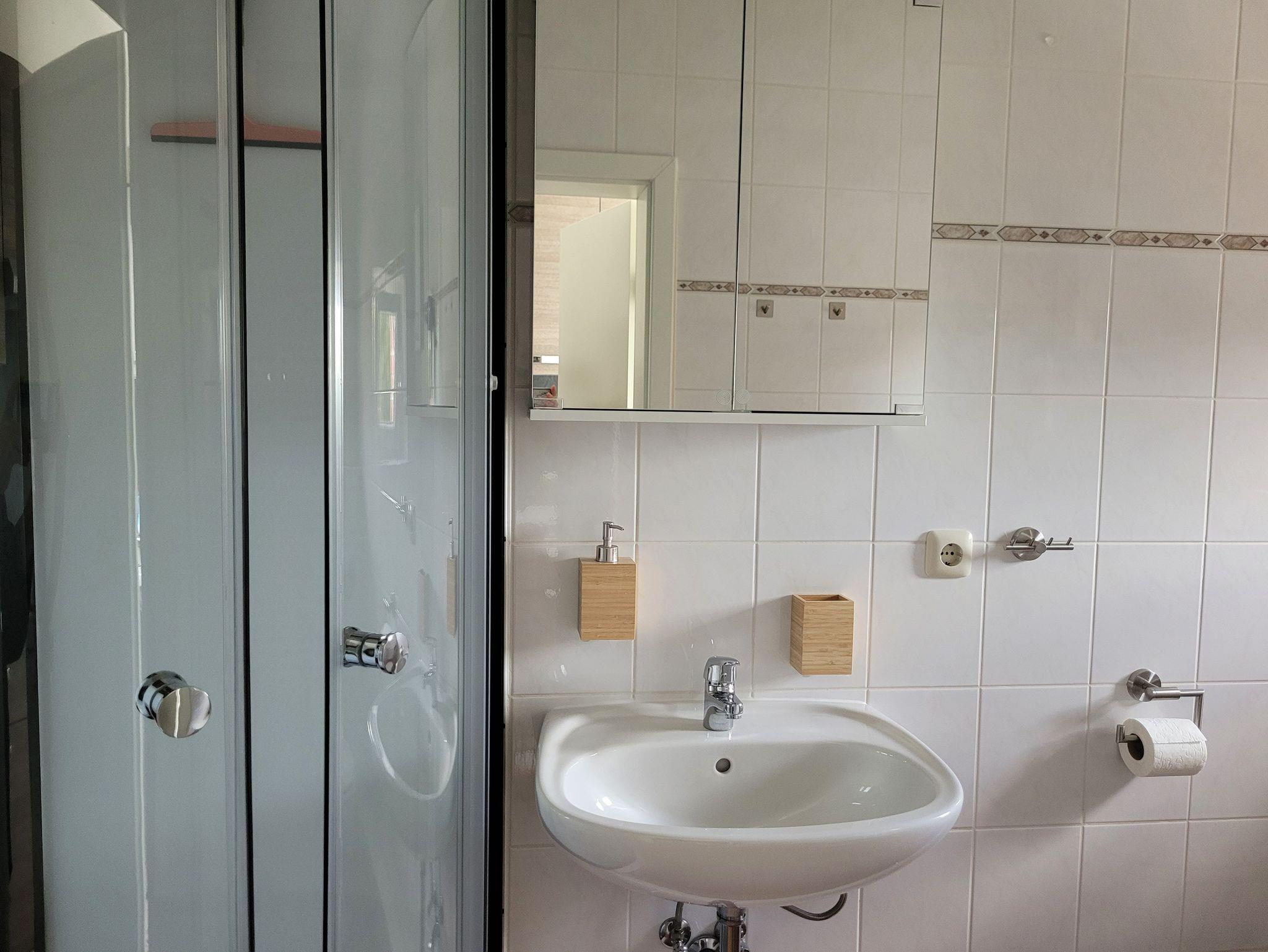 Das Bad bietet den Gästen ein Waschbecken, eine Duschkabine und ein WC. Handtücher und Bettwäsche können hinzugebucht werden. Seife und Toilettenpapier werden in Erstausstattung bereitgestellt.