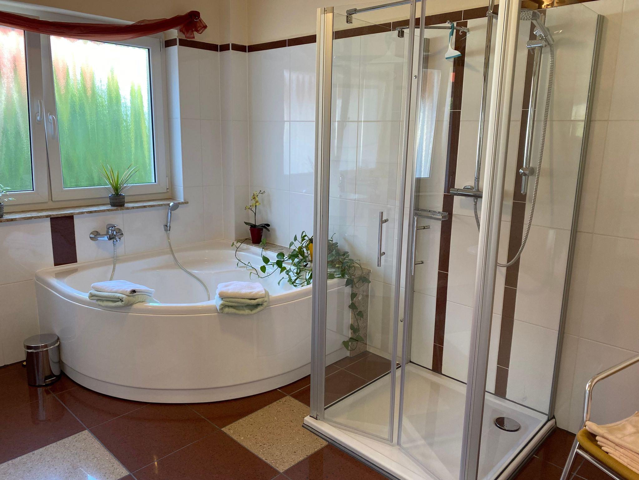 Unsere Ferienwohnung ist 90 qm groß und liegt im Erdgeschoss eines Ferienhauses. Sie verfügt über ein großes Wohnzimmer, ein Schlafzimmer mit Doppelbett (trennbar zu Einzelbetten), ein Schlafzimmer mit zwei Einzelbetten, Küche und ein großes Bad mit Doppelwaschtisch, Dusche, Eckbadewanne und WC. Die Aufbettung für die 5. Person erfolgt auf einer ausklappbaren Schlafcouch im Wohnzimmer. Im Wohnzimmer steht Ihnen ein Kamin zur Verfügung.