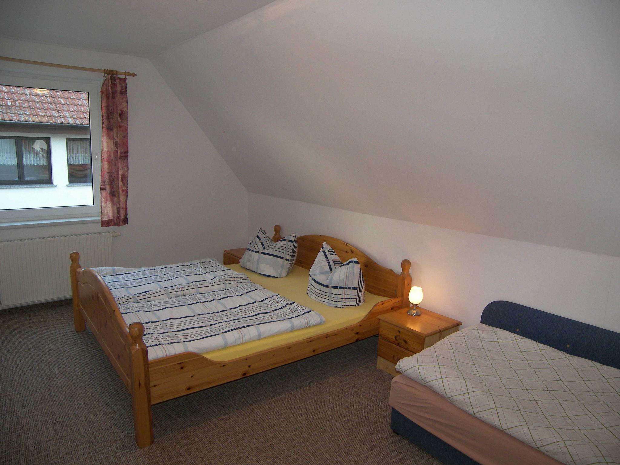 Das Schlafzimmer ist mit einem Doppelbett (180 x 200) und einem Einzelbett sowie mit einem geräumigen Kleiderschrank ausgestattet. Das Bad mit Fenster verfügt über Dusche/WC.