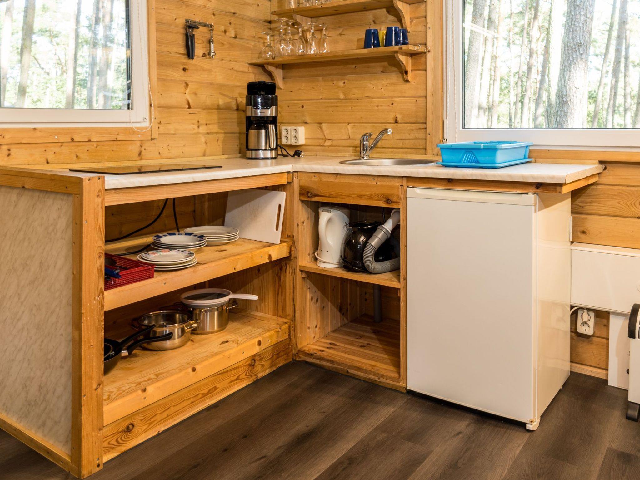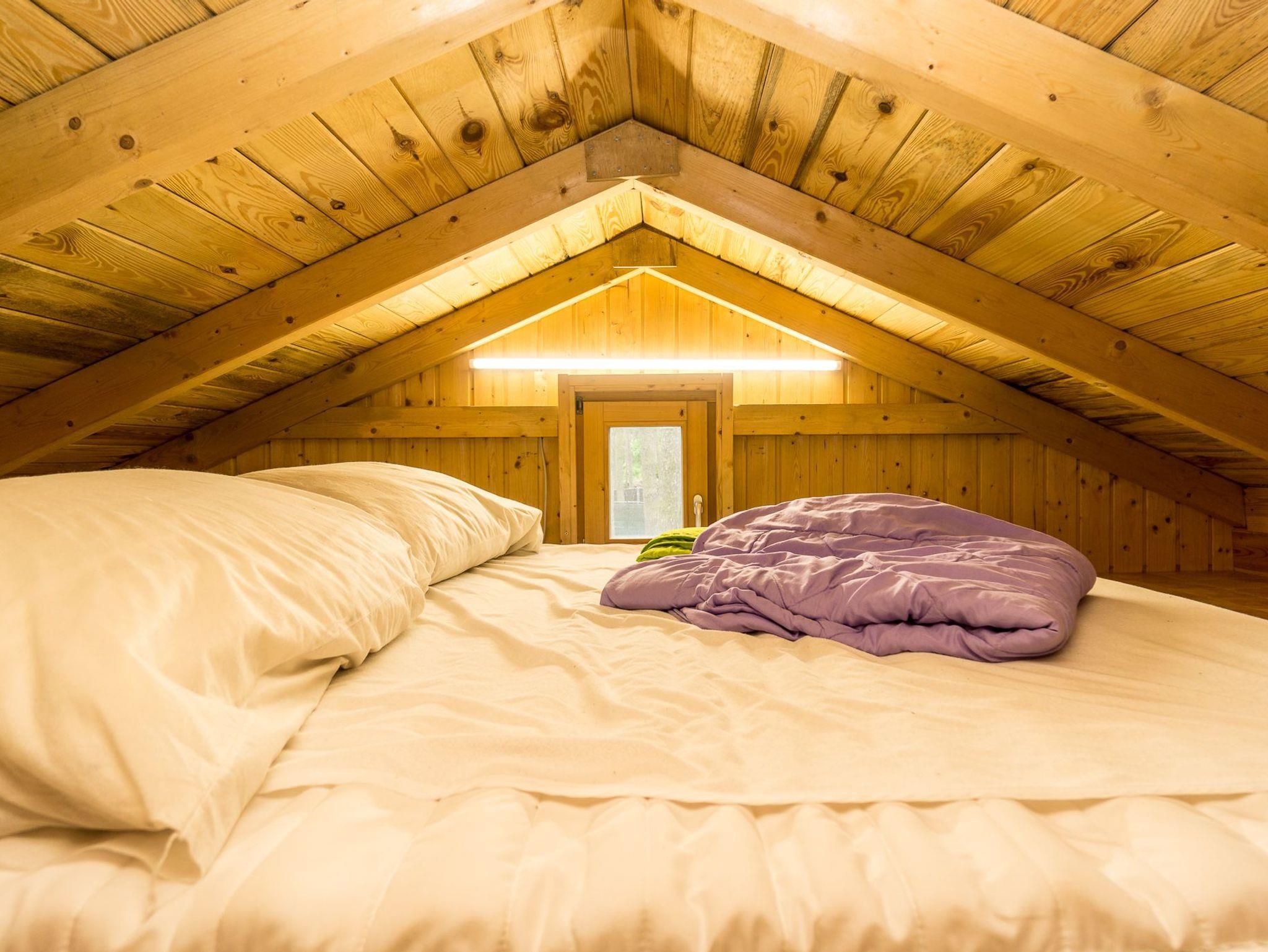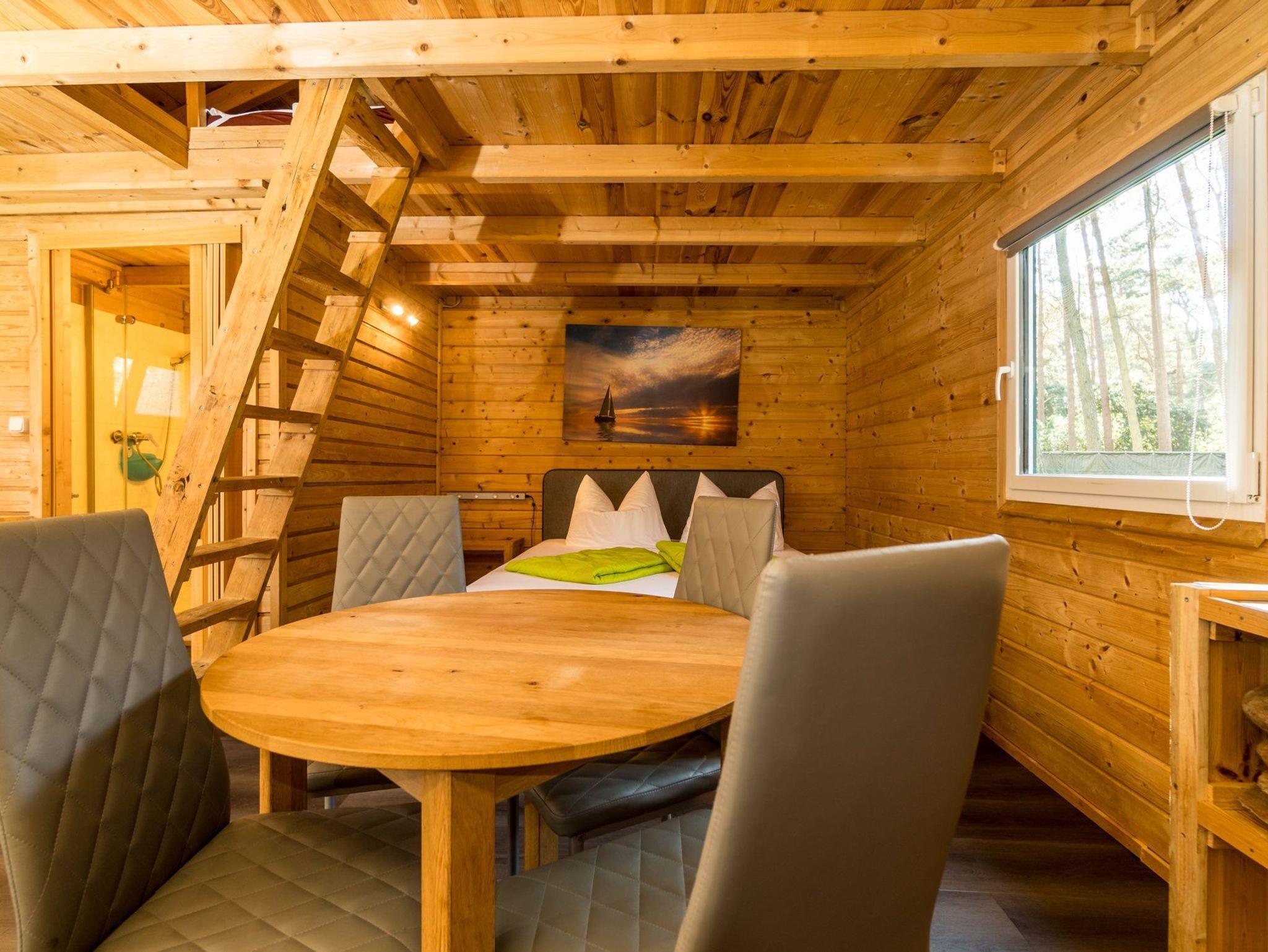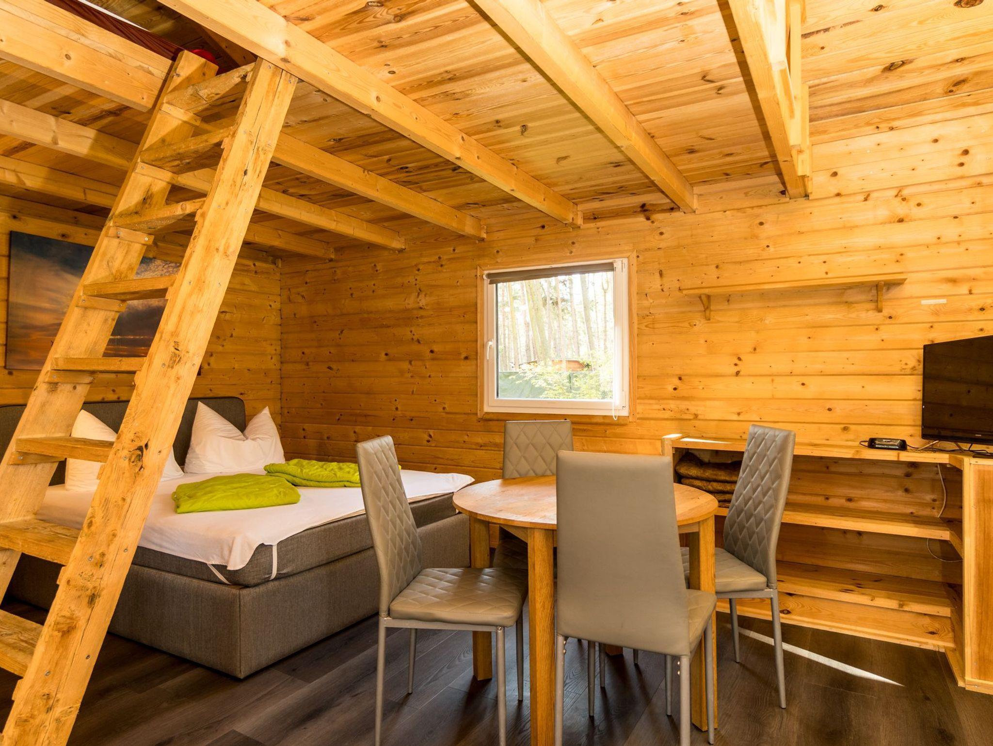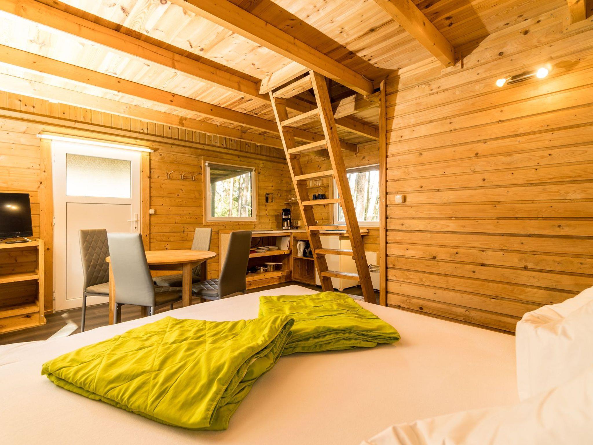 Der Bungalow verfügt über zwei Etagen. Die obere Etage ist ein Schlafboden mit dicker Matraze (160x200cm) für zwei Personen und über eine Leiter zu erreichen. Die untere Etage besteht aus einem großen Raum mit TV-Ecke, einer Flachstrecken für ihre Garderobe, einer Schlafnische mit Boxspring-Doppelbett (160x200cm) und der Küchenzeile. Separat befindet sich ein Bad mit Toilette und einer Dusche.