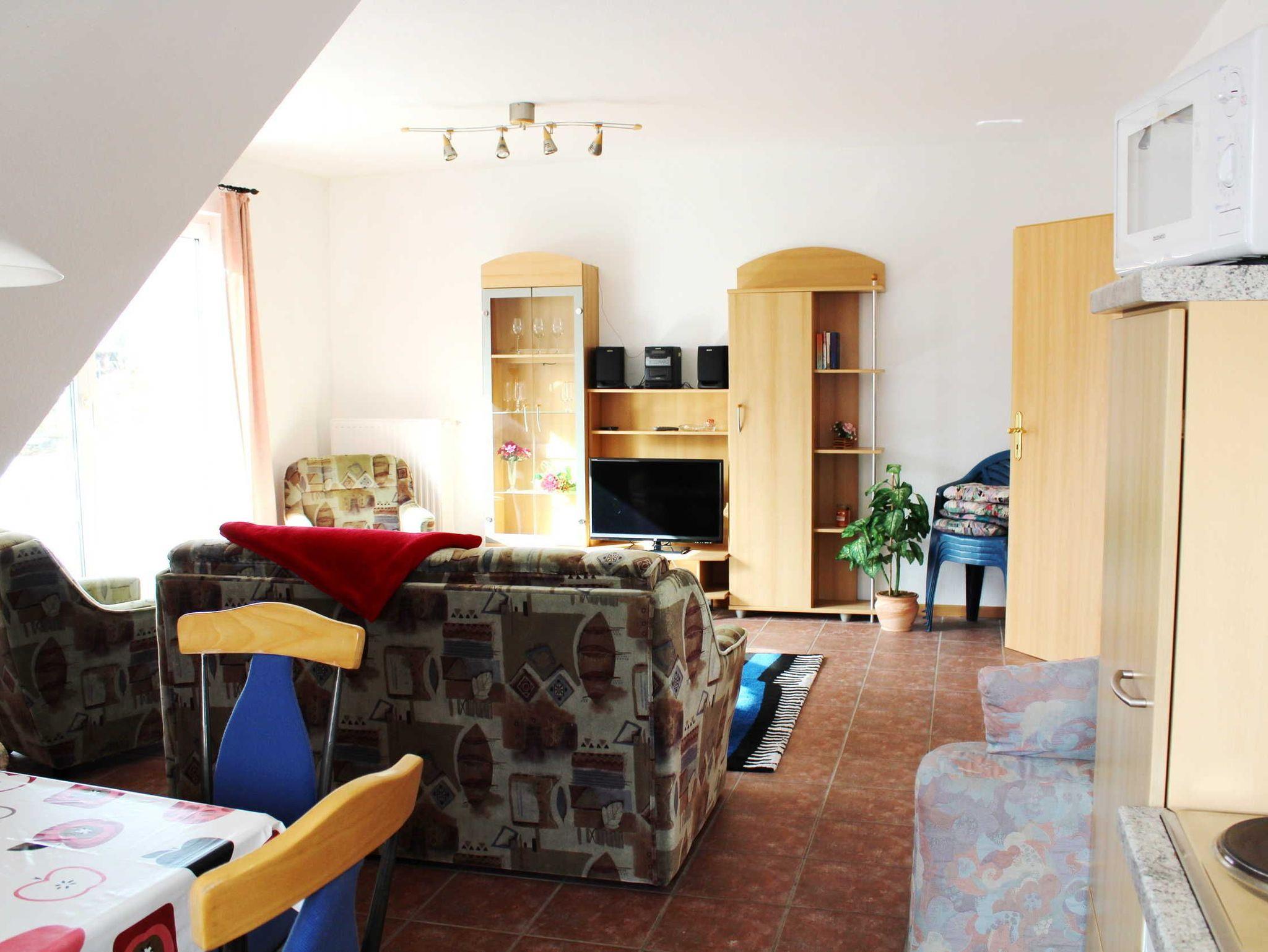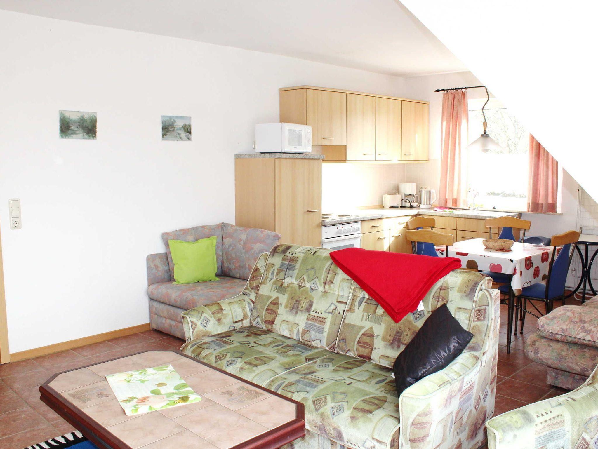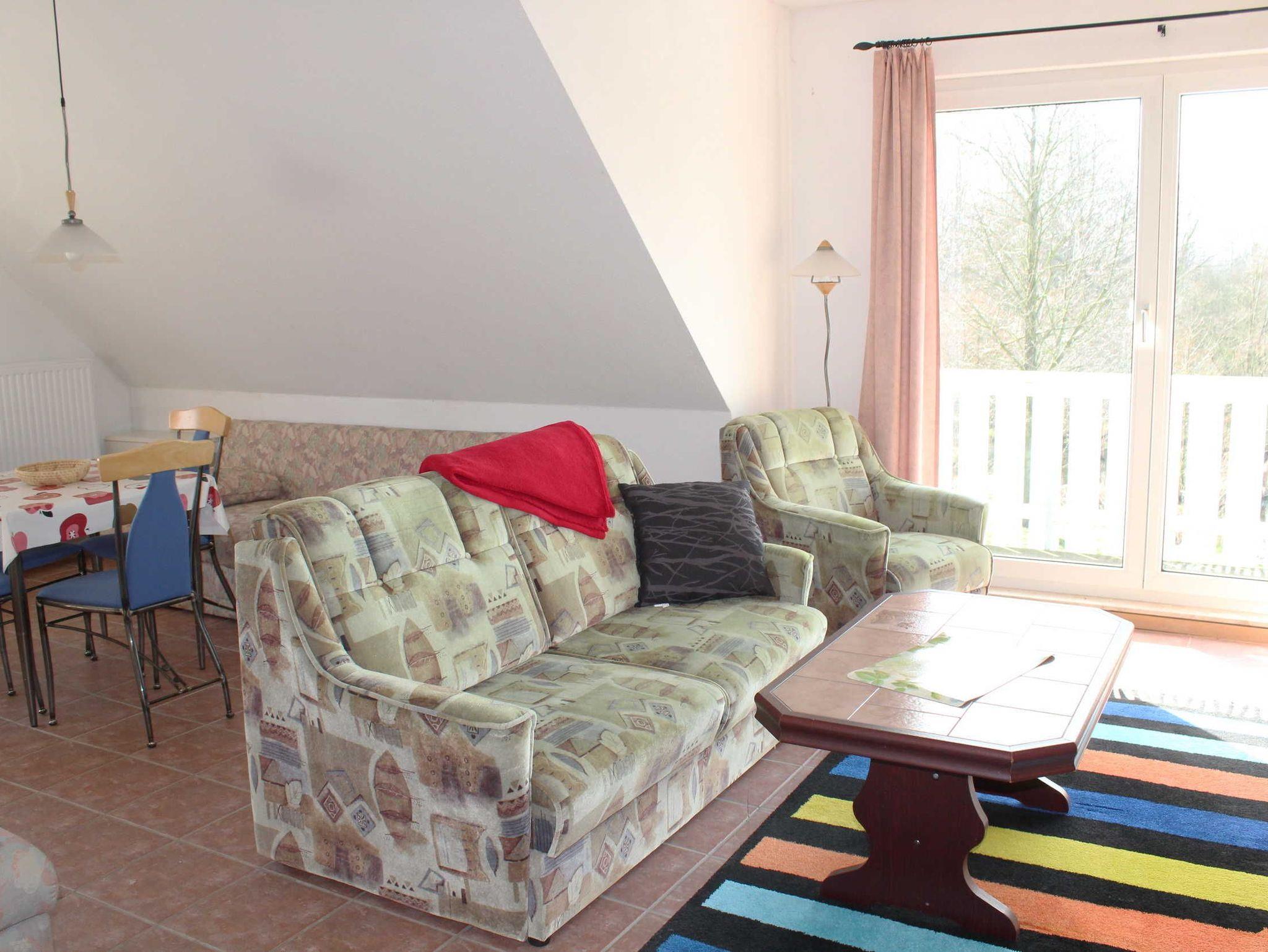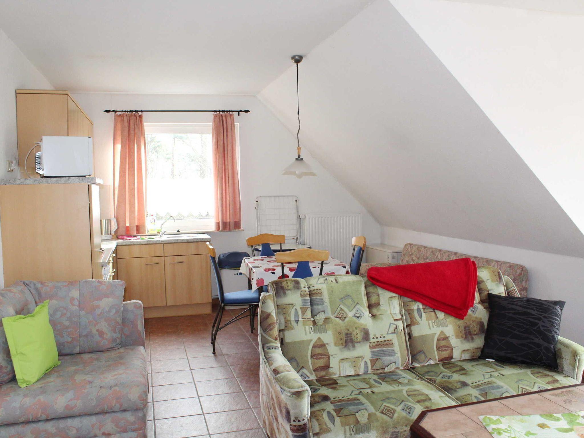 Die Ferienwohnung befindet sich in Haus 3 in der oberen Etage auf der linken Seite, ist modern ausgestattet und besteht aus einem Wohn/Schlafraum mit Rundcouch(ausziehbar) und Einzelliege, Stereoanlage, TV und Sitzgruppe, einem Schlafzimmer mit Doppelbett, einer komplett ausgestatteten Küche mit Mikrowelle und einem Bad mit WC und Badewanne. Bettwäsche kann für 8,- Euro pro Person dazu gebucht werden. Haustiere sind erlaubt (10,00 Euro/pro Tag). Endreinigung einmalig 35,00 Euro, Heizung, Wasser und Strom sind inklusive. Anreise ab 14.00 Uhr, Abreise bis 10.00 Uhr.