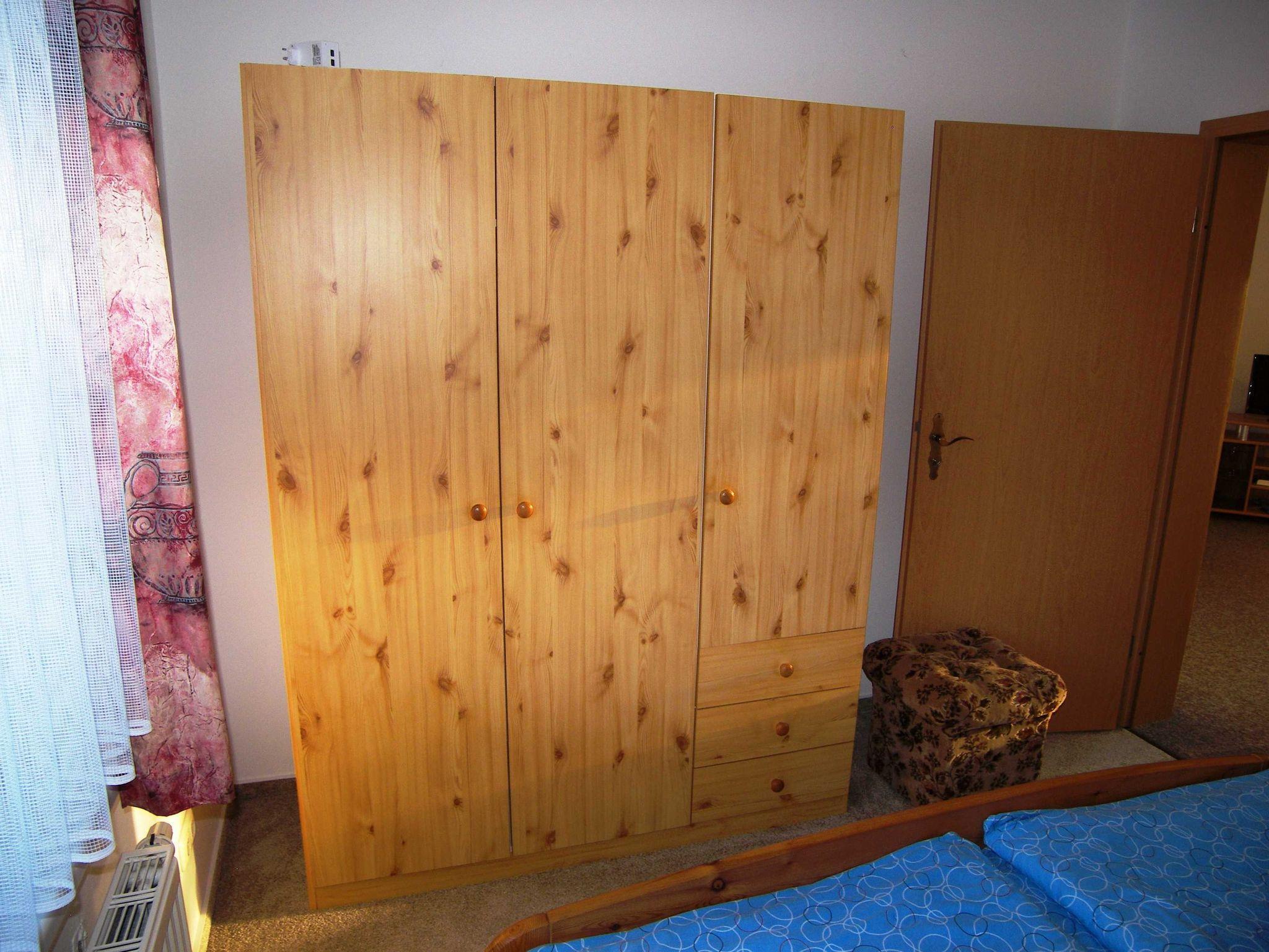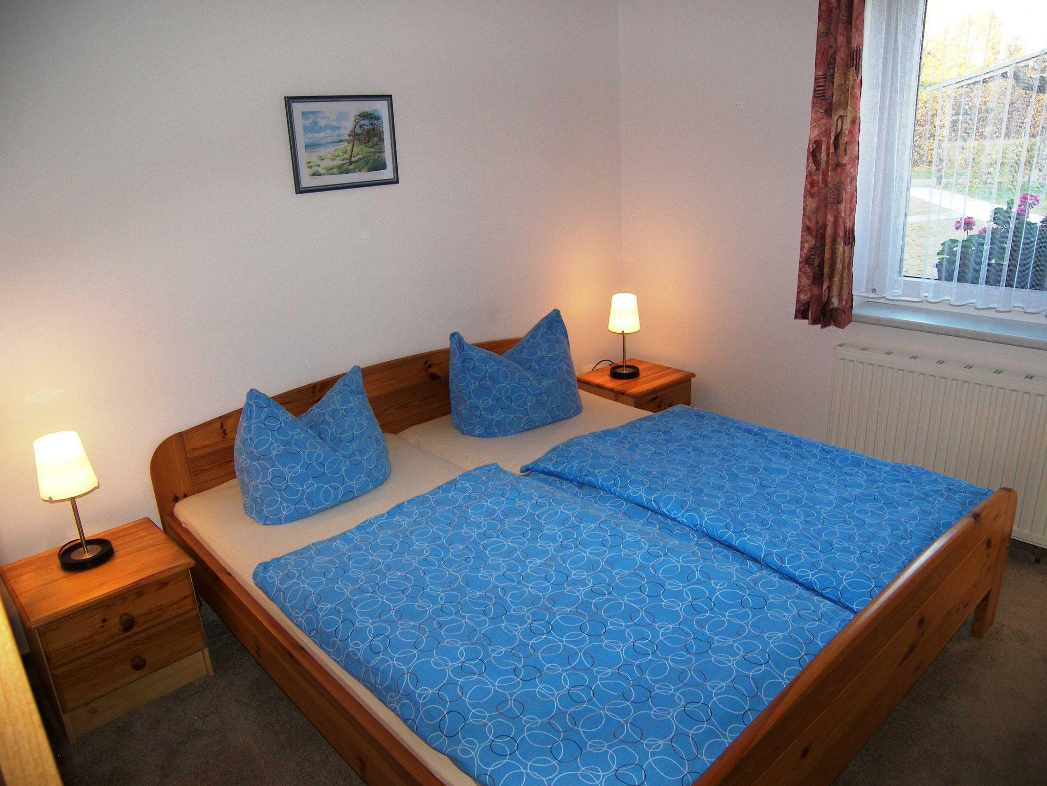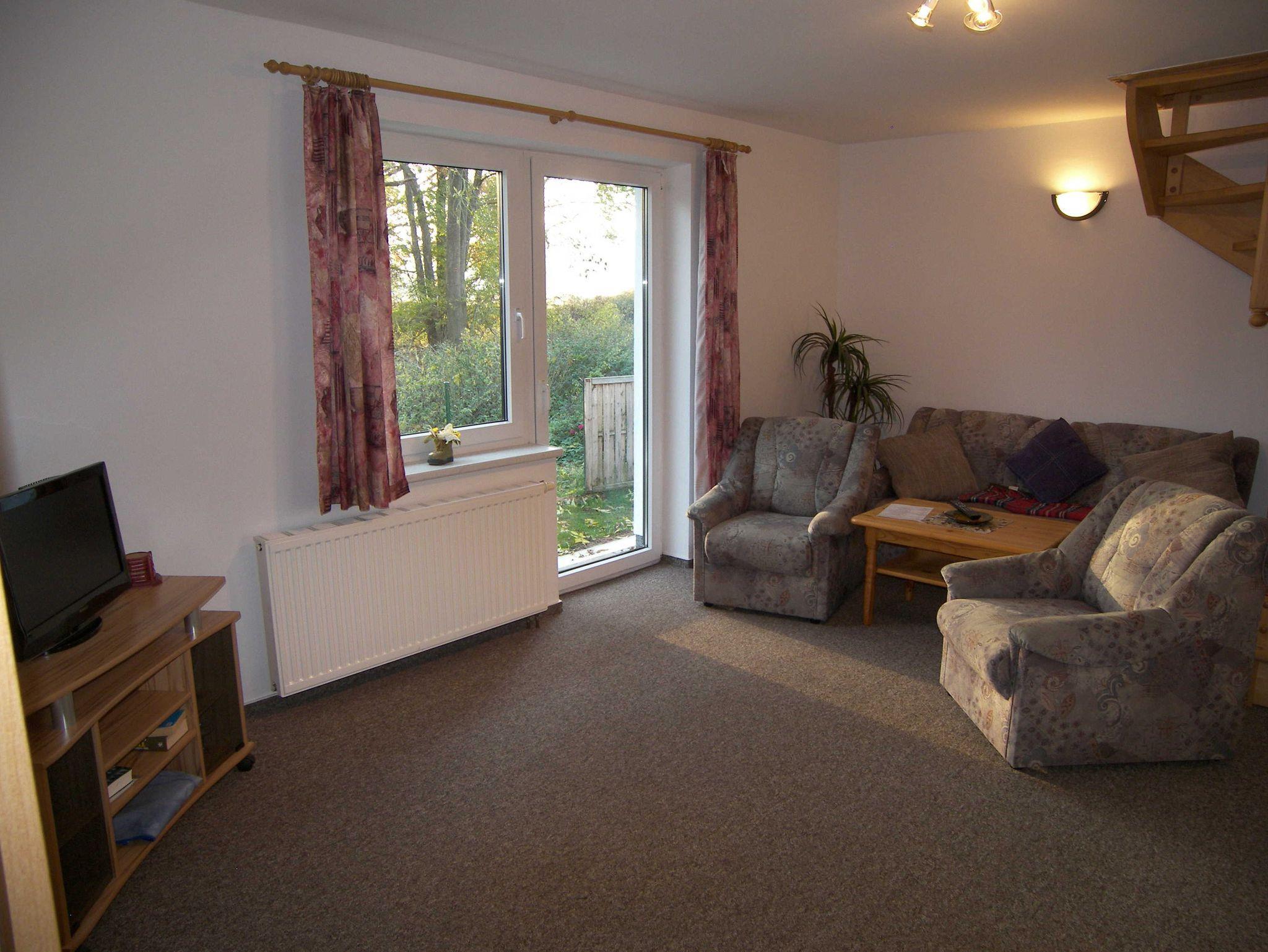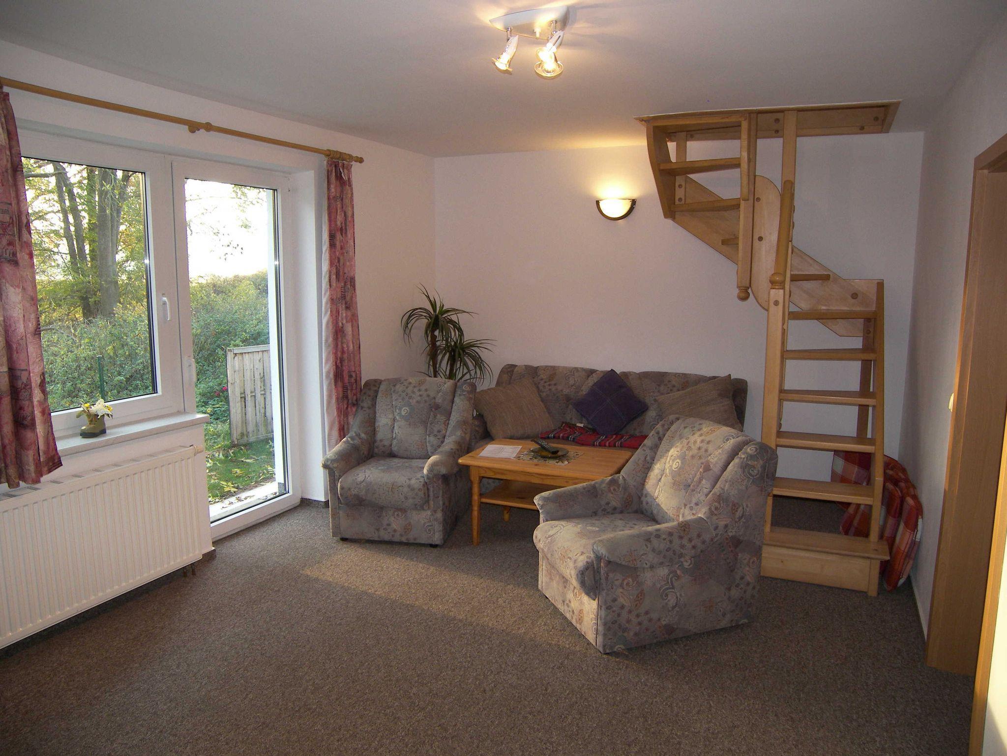 Das Wohnzimmer verfügt über eine Couch-Sitzgruppe, TV und Radio. Vom Wohnzimmer aus gelangt man auf die Terrasse zur Südlage. Das erste Schlafzimmer im EG ist mit einem Doppelbett (180 x 200) und einem geräumigen Kleiderschrank ausgestattet. Das zweite Schlafzimmer befindet sich im OG, das über eine kleine Treppe im Wohnzimmer zu erreichen ist, darin steht ein Einzelbett und eine Einzelliege zur Verfügung. Das Bad mit Fenster verfügt über Dusche/WC.