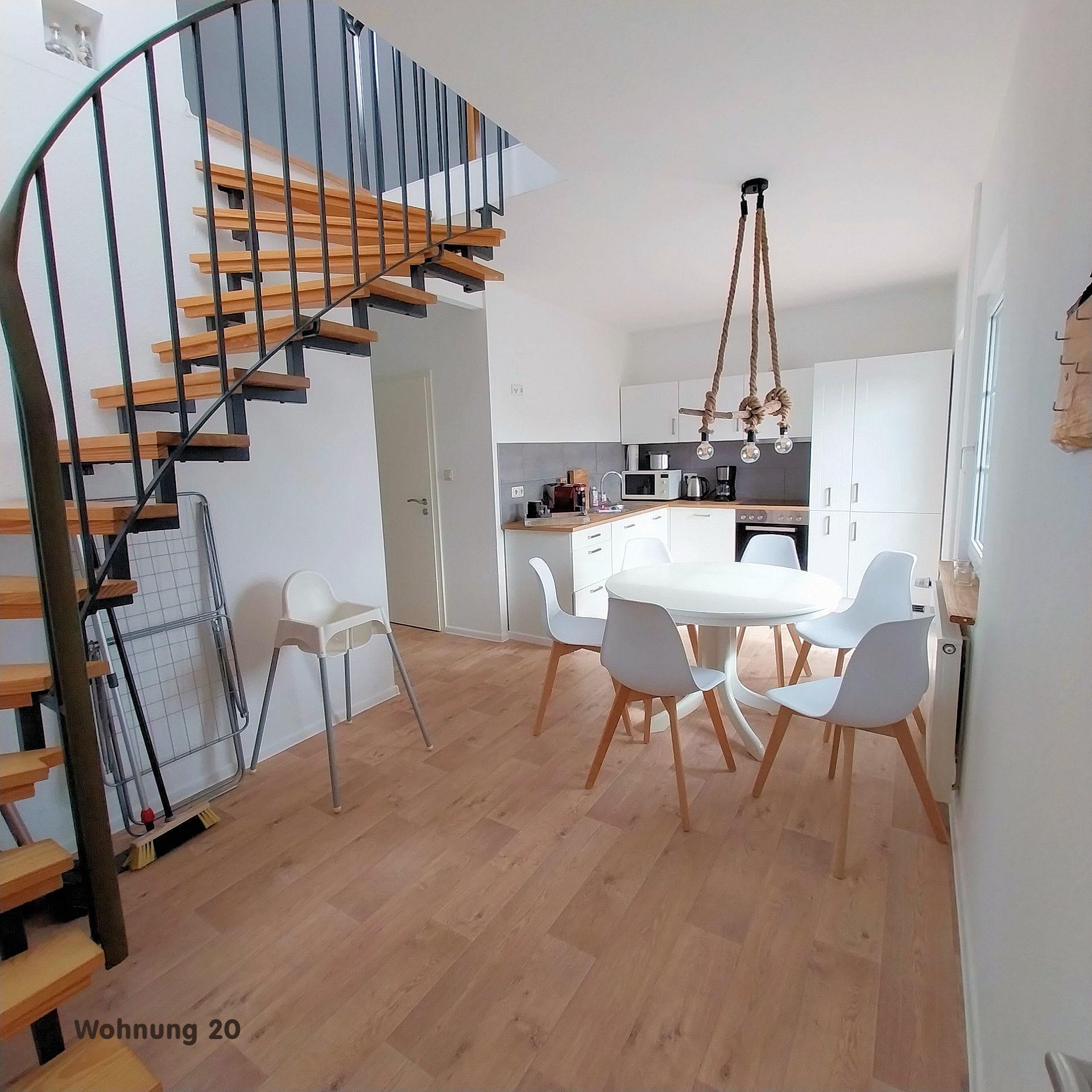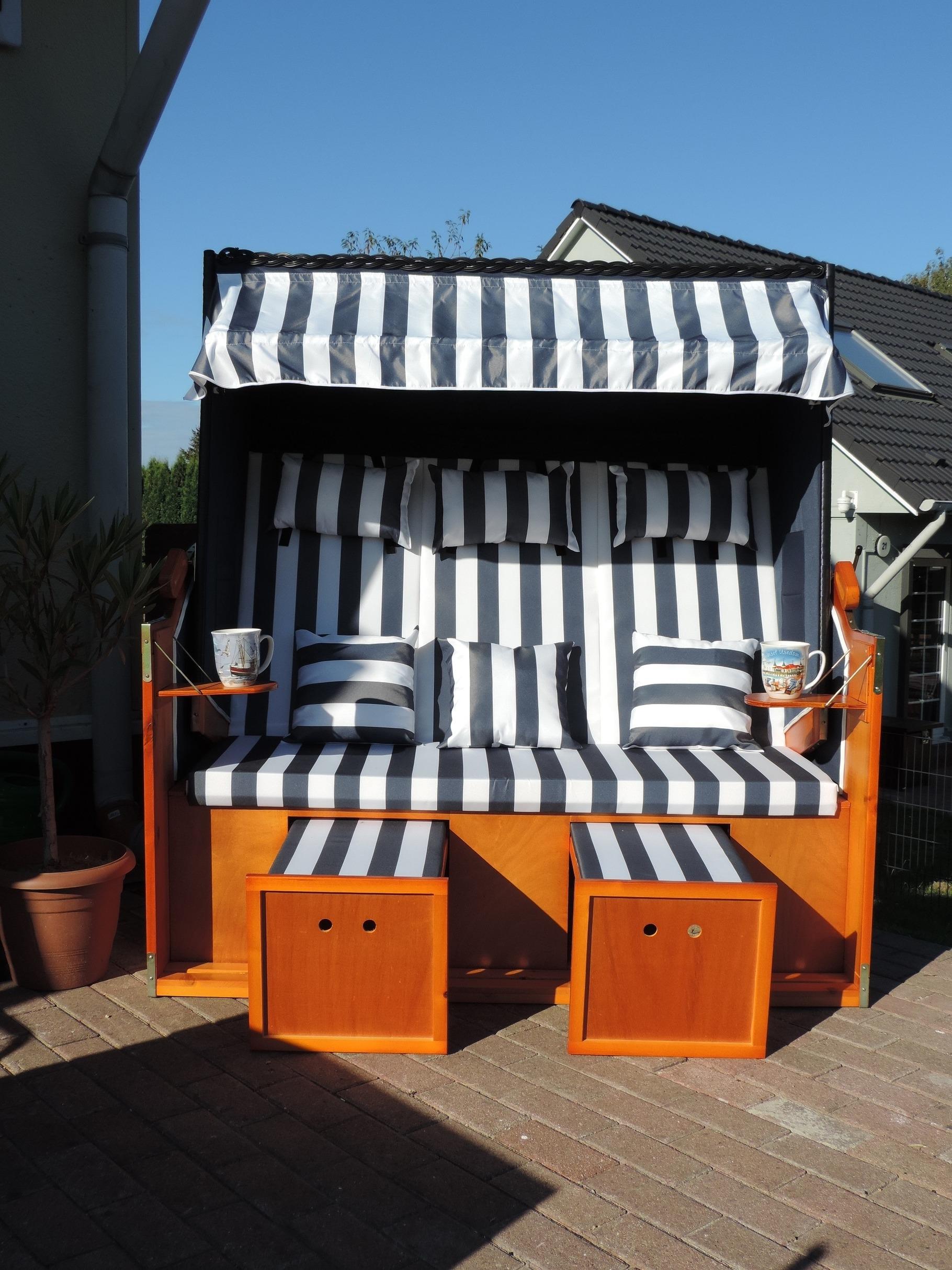 Die Fewo verfügt über 2 Schlafzimmer mit Doppel-, Kinder-, und Etagenbett, ein eigenes Bad mit Dusche, eine voll ausgestattete Küche (Kühl-, Gefrierkombination, Herd mit Backofen, Geschirrspüler, Wasserkocher, Kaffeemaschine Toaster) mit Essbereich, Wohnbereich mit Schlafcouch und einen Flachbild-Satelliten-TV und eine Terrasse mit Strandkorb, Terrassenmöbel, Sonnenschirm und Grill
