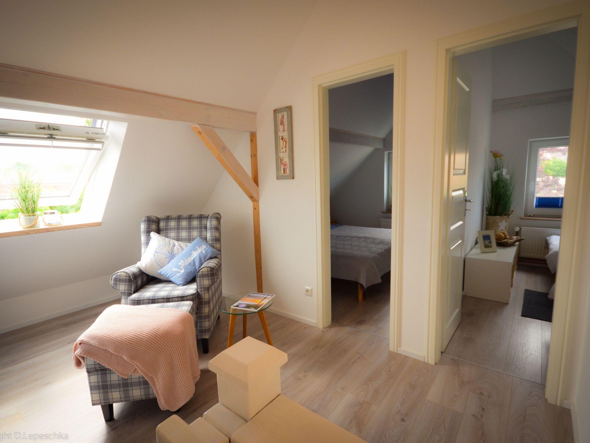 In addition to a separate WC, there is a bedroom with a double bed and a bedroom with two single beds on the upper floor (two more people can sleep on a pull-out sofa bed on the ground floor). You will also find a large built-in wardrobe and a cosy wing chair in the upstairs hallway, which invites you to relax.