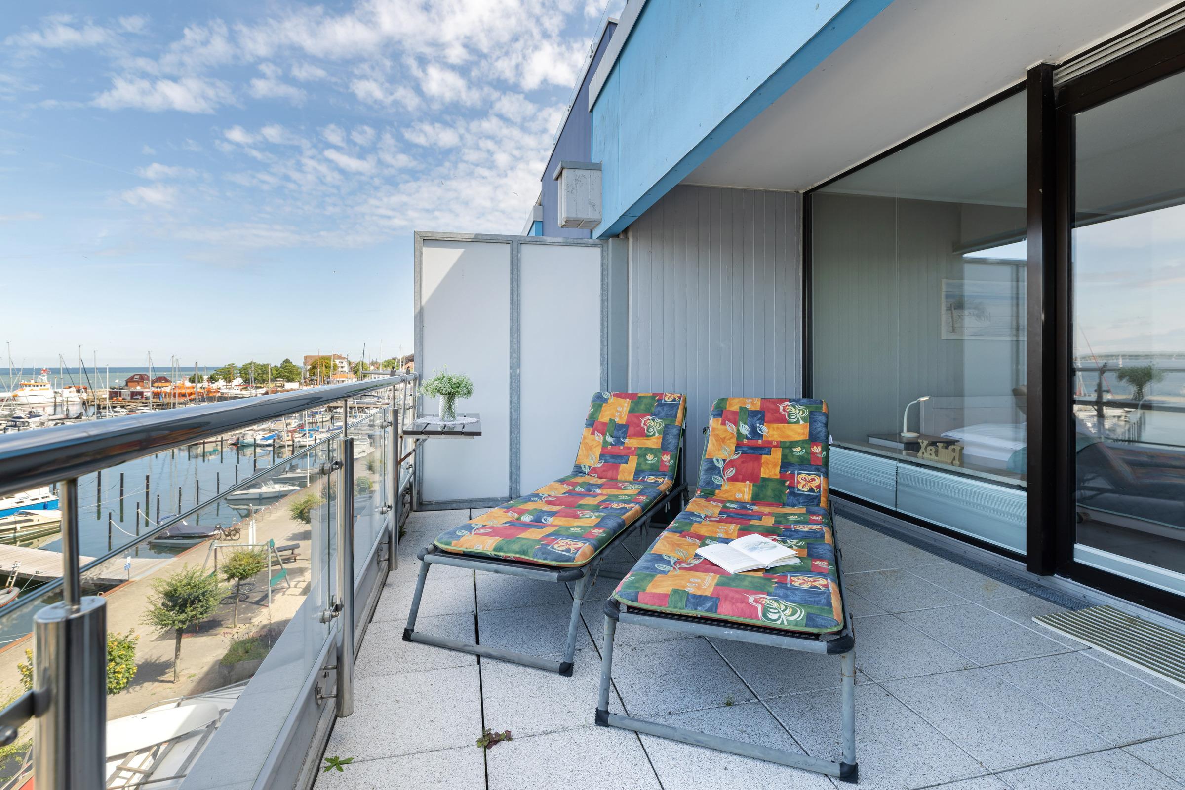 Moderne, ca. 60m² große 2-Zimmer-Ferienwohnung für bis zu 4 Personen direkt am Yachthafen von Laboe mit Balkon und herrlichem Blick auf die Kieler Förde. Die Wohnung erreichen Sie bequem mit dem Aufzug (100x100 cm).