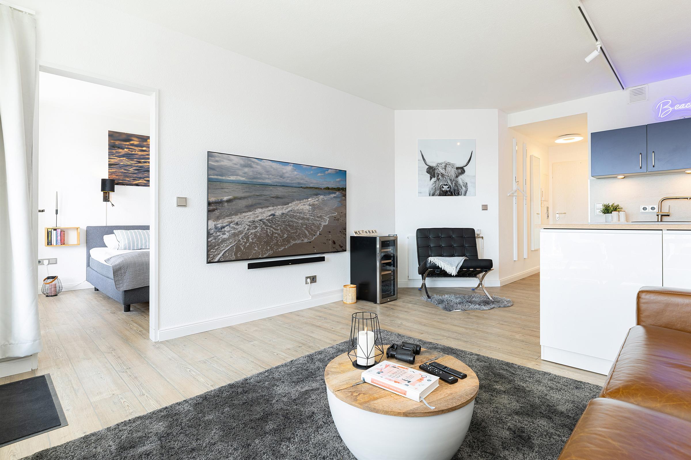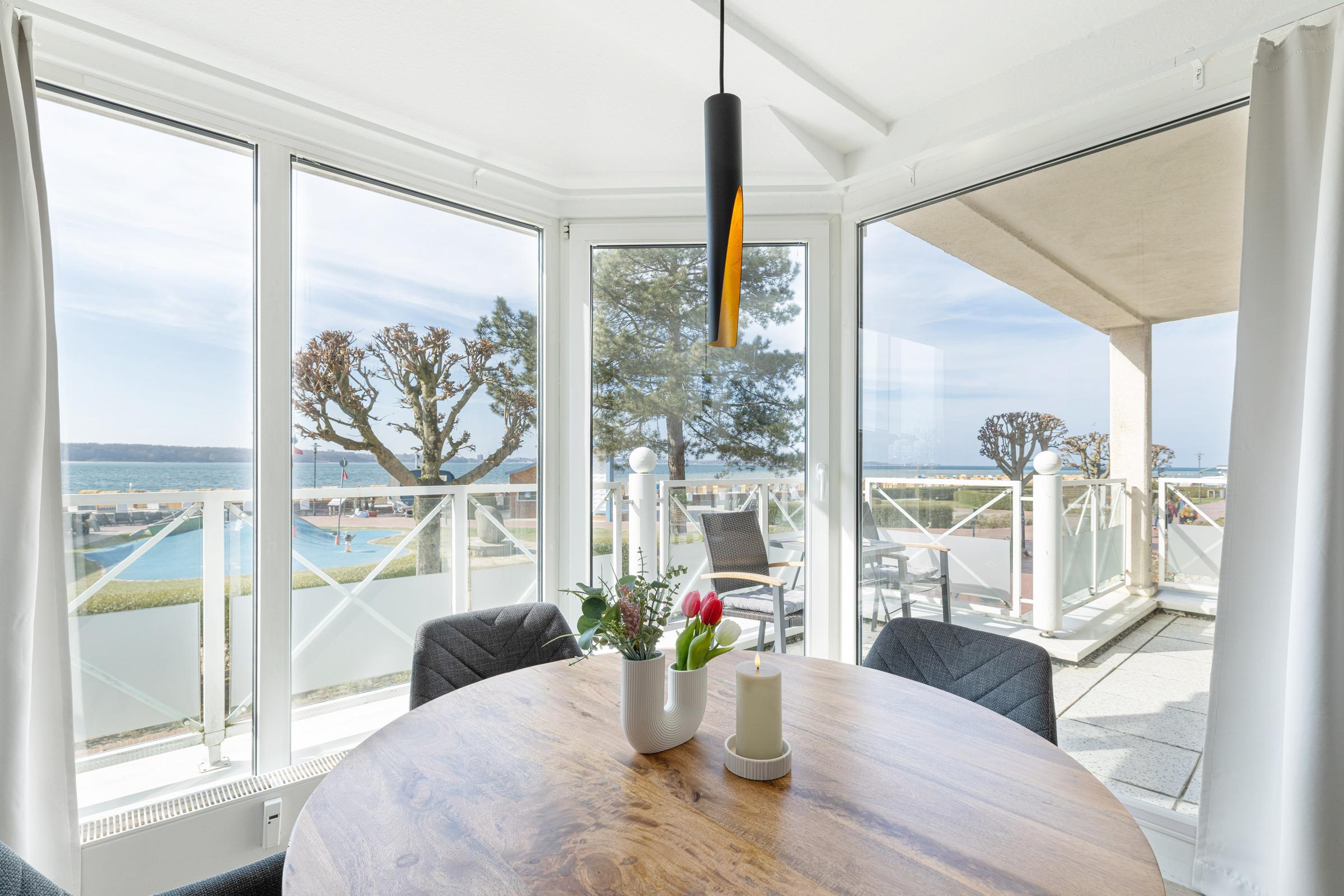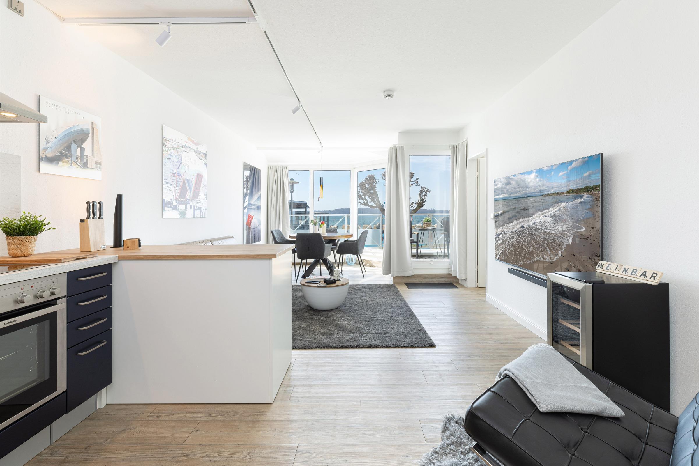 Herzlich Willkommen in der modern eingerichteten 2-Zimmer-Ferienwohnung für bis zu 2 Personen im Hochparterre des Appartementhauses Panorama direkt an der Strandpromenade von Laboe mit großzügigem Blick auf Kieler Förde und Ostsee.