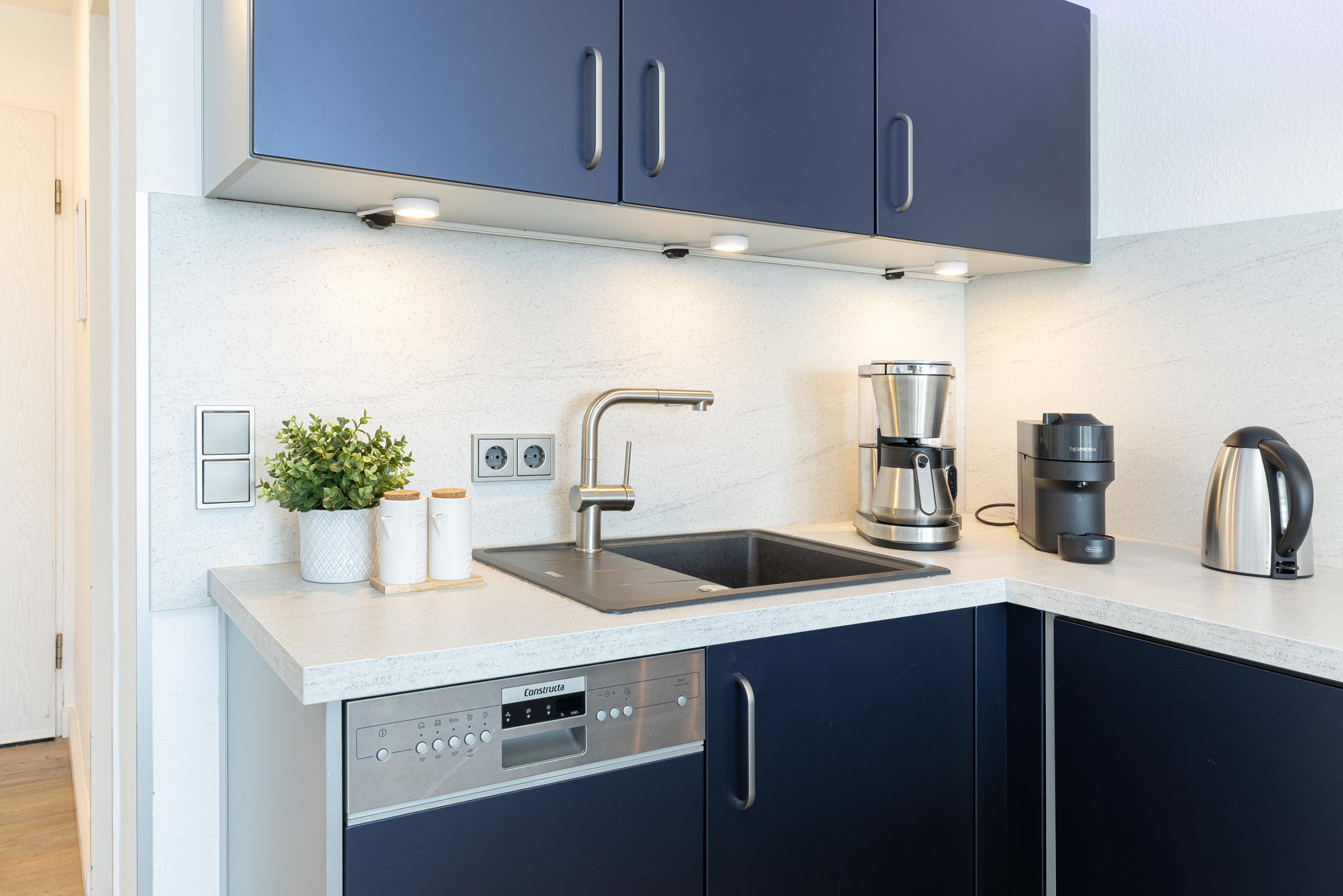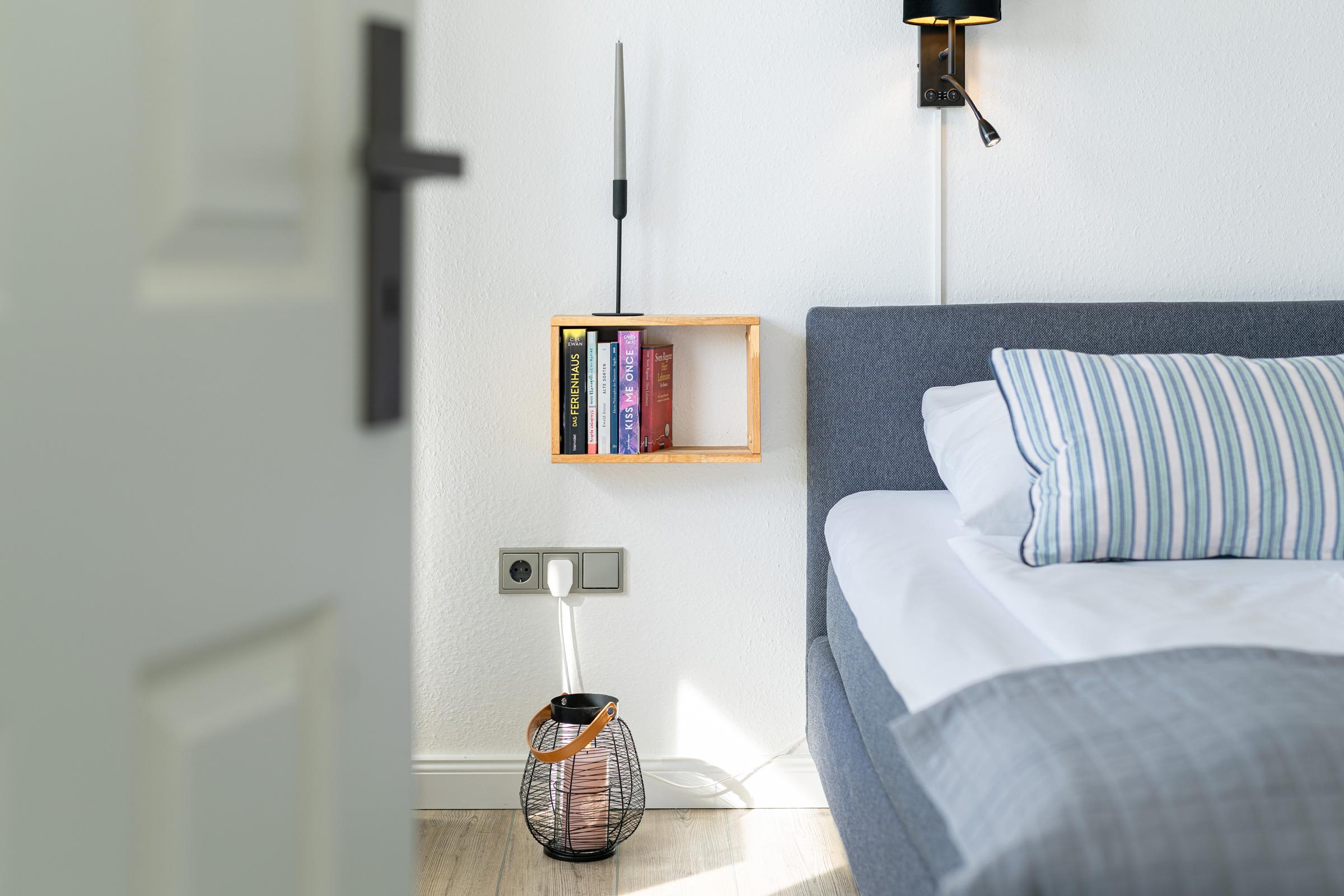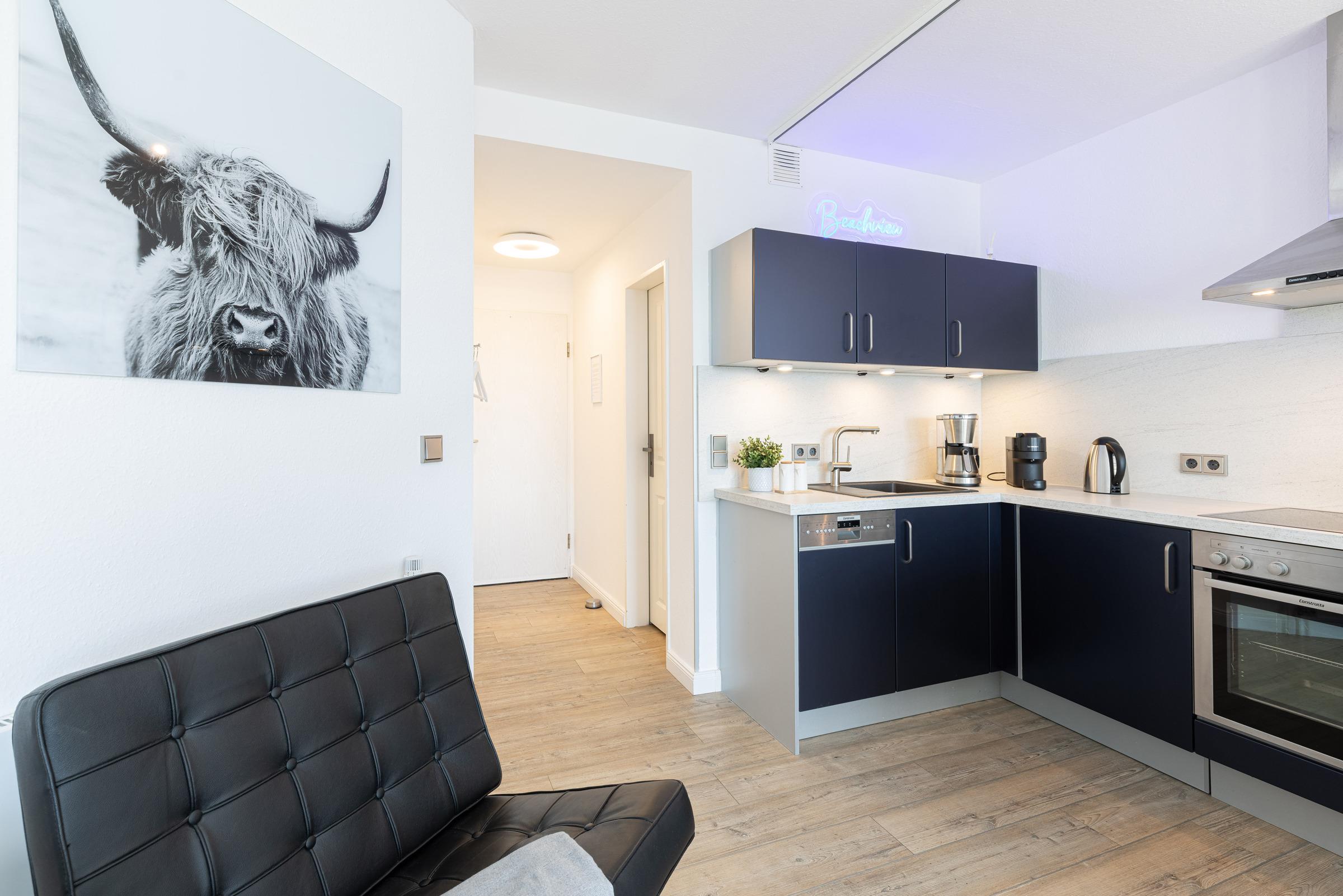 Für eine angenehme Nachtruhe stehen Ihnen ein geschlossener Schlafraum mit Boxspringbett (180 x 200 cm) zur Verfügung. In der offenen Küche fehlt es Ihnen an Nichts! Eine Nespresso VERTUO Kapselmaschine versüßt Ihnen mit leckerem Kaffee die Morgenstunden. Vom Wohnzimmer aus, beim Essen, aus dem Schlafzimmer und vom Balkon aus genießen Sie einen schönen Blick über die Promenade und können vorbeiziehende Schiffe auf der Kieler Förde beobachten. Als Ausweichschlafmöglichkeit kann das hochwertige Ledersofa zu einer praktischen Schlafcouch (140 x 200 cm) ausgeklappt werden. Auch das helle Duschbad lässt keine Wünsche offen.