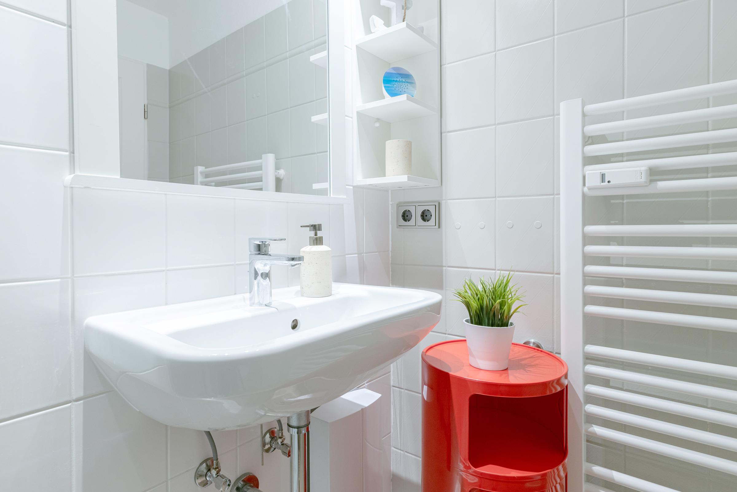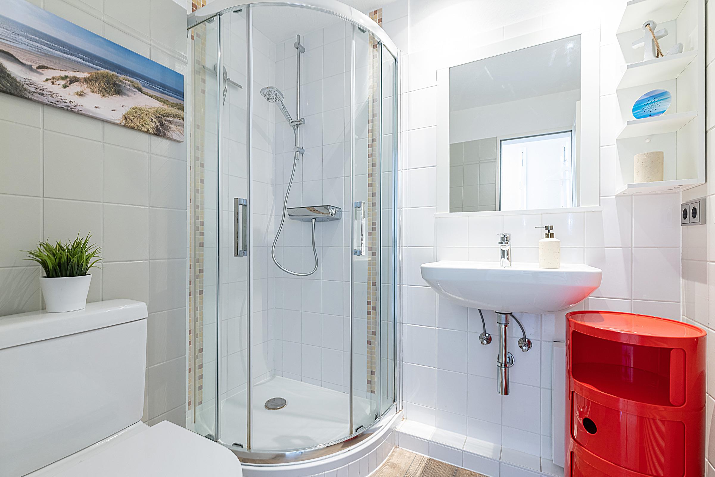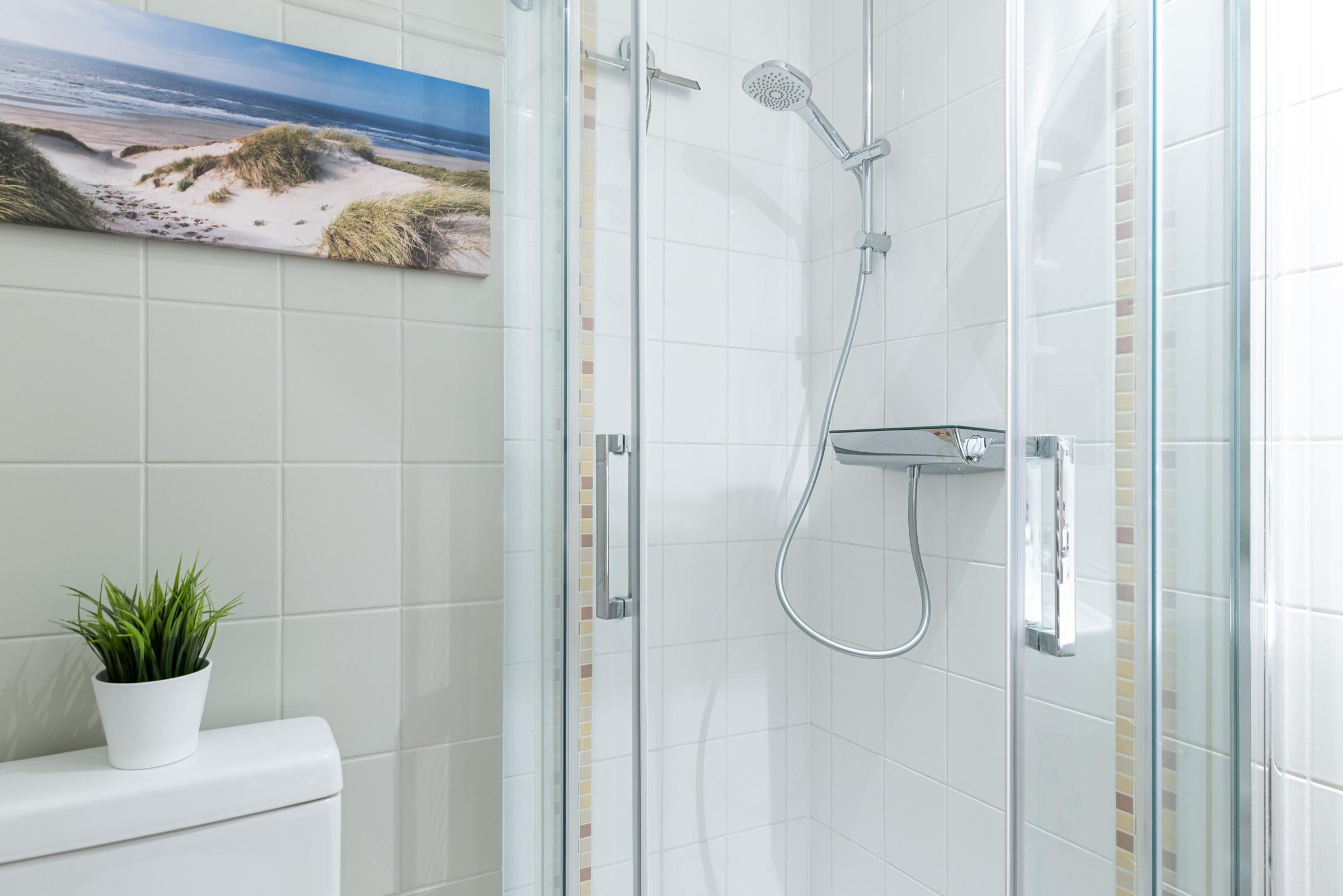 Für eine angenehme Nachtruhe stehen Ihnen ein geschlossener Schlafraum mit Boxspringbett (180 x 200 cm) zur Verfügung. In der offenen Küche fehlt es Ihnen an Nichts! Eine Nespresso VERTUO Kapselmaschine versüßt Ihnen mit leckerem Kaffee die Morgenstunden. Vom Wohnzimmer aus, beim Essen, aus dem Schlafzimmer und vom Balkon aus genießen Sie einen schönen Blick über die Promenade und können vorbeiziehende Schiffe auf der Kieler Förde beobachten. Als Ausweichschlafmöglichkeit kann das hochwertige Ledersofa zu einer praktischen Schlafcouch (140 x 200 cm) ausgeklappt werden. Auch das helle Duschbad lässt keine Wünsche offen.