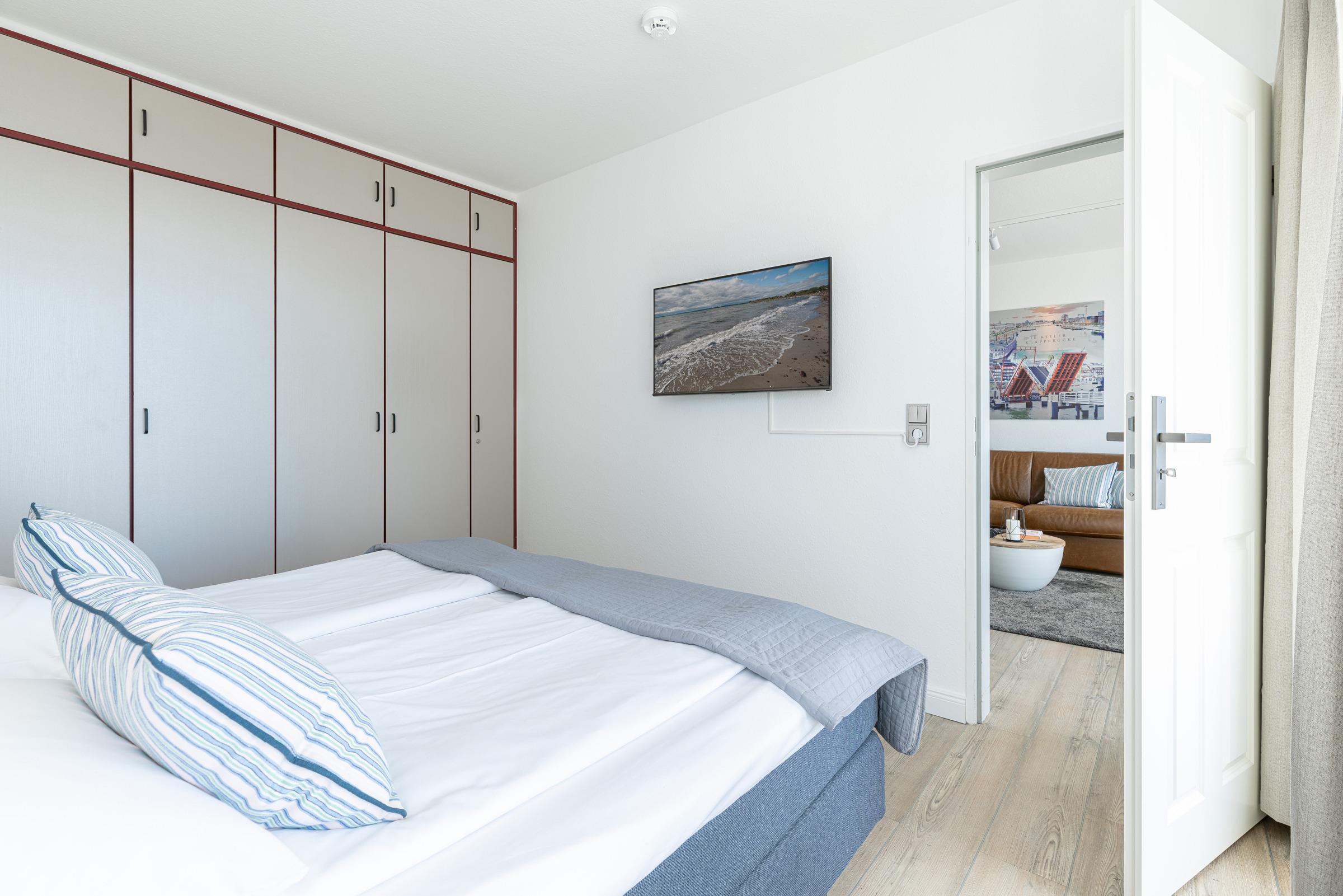 Schlafzimmer: Doppelbett (ca. 180 x 200 cm), Kleiderschrank, TV