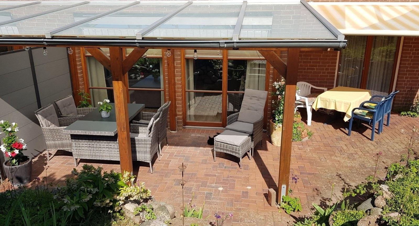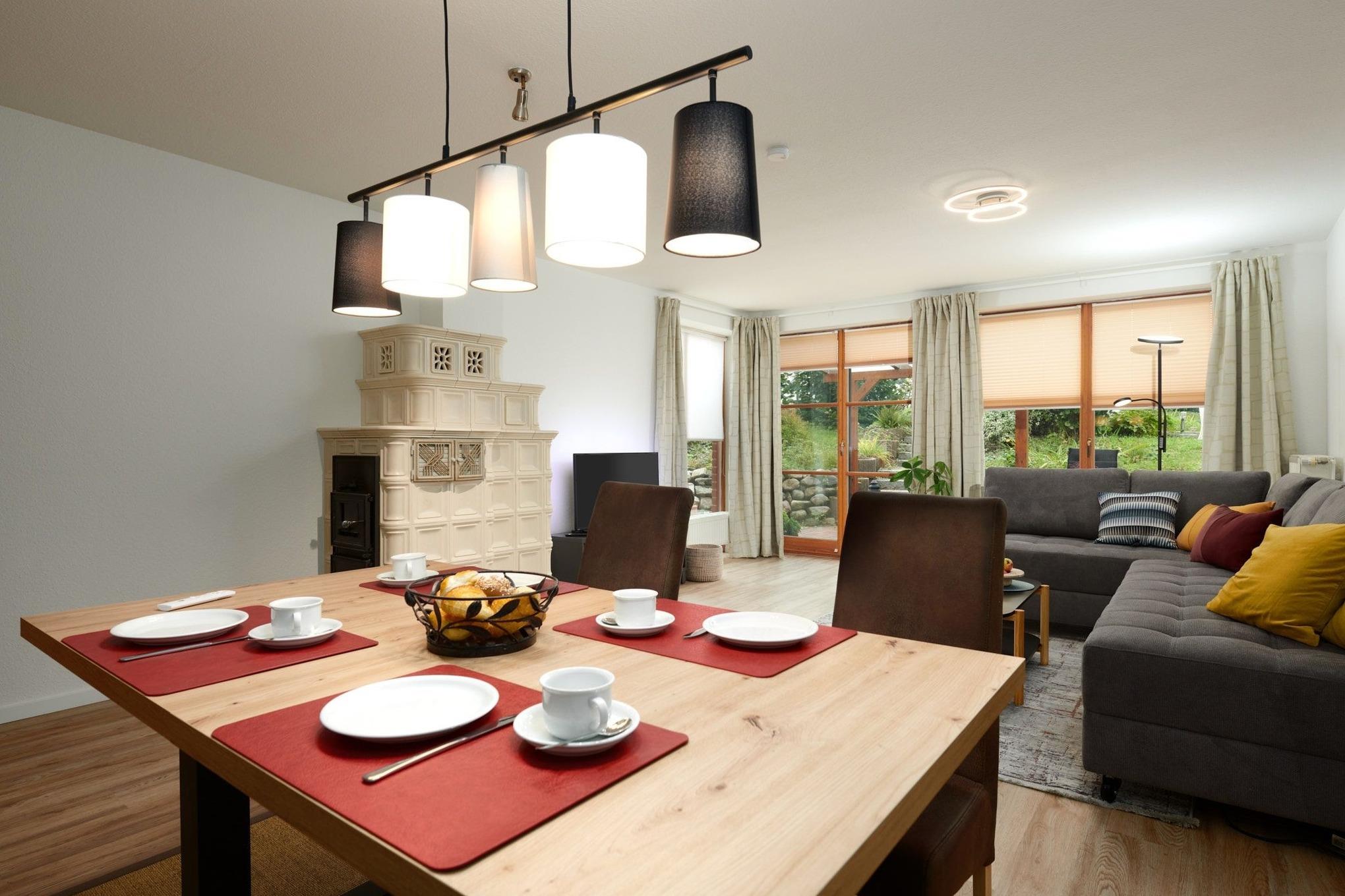 Das große gemütliche Wohnzimmer ist mit einer Schlafcouch für 2 Personen ausgestattet und der angrenzende Essbereich bietet Platz für 4 Erwachsene und zwei Kinder. Die angrenzende Terrasse ist mit einer festen Überdachung versehen, hier kann man auch mal bei leichten Regentagen verweilen. Grillen ist erlaubt, ein Grill muss aber selbst mitgebracht werden.