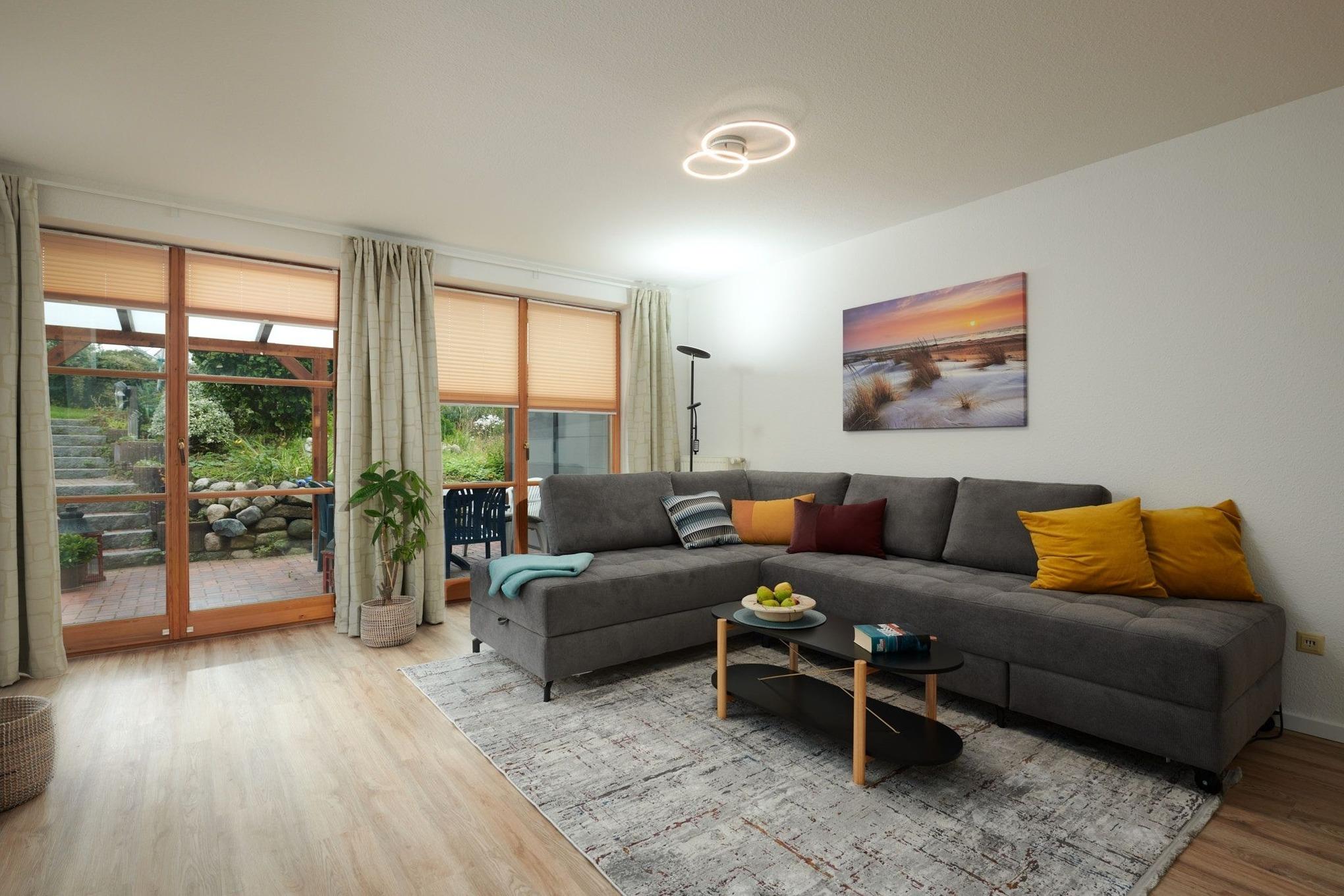 In dieser nordisch modernen Ferienwohnung im EG eines Einfamilienhauses fühlt man sich sofort wie zu Hause. Ein großer Flur führt nicht nur in alle Zimmer, er sorgt für Ordnung Ihrer Jacken und Gummistiefel in der Winterzeit und den Zehlatschen im Sommer. Auch der Kinderwagen findet hier seinen Platz.