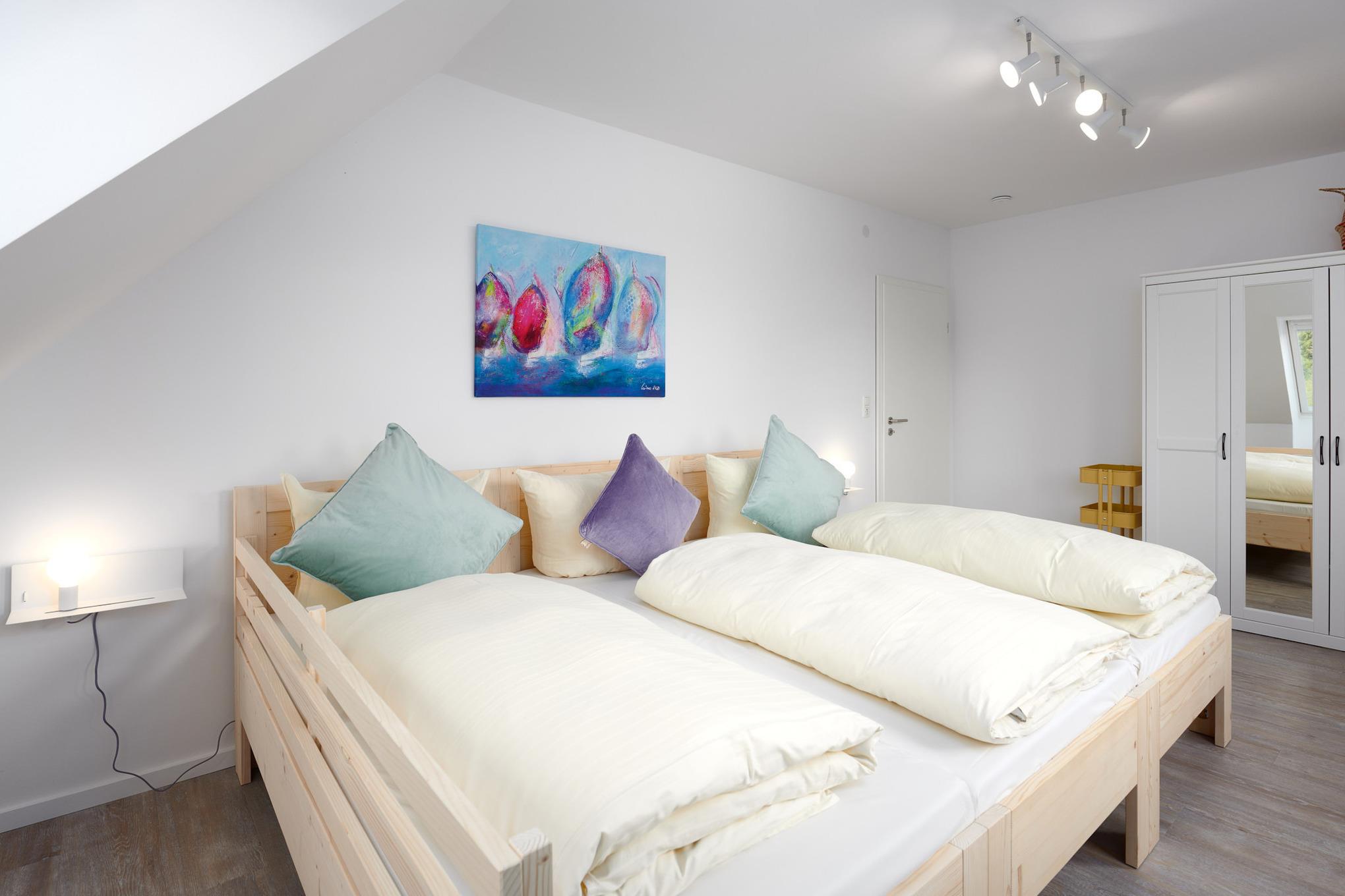 Schlafzimmer 2 (2. OG): 1 Doppelbett (2x 90x200 cm), Kleiderschrank, TV, Verdunkelung: Plissee und Gardinen, Platz für ein Babybett vorhanden