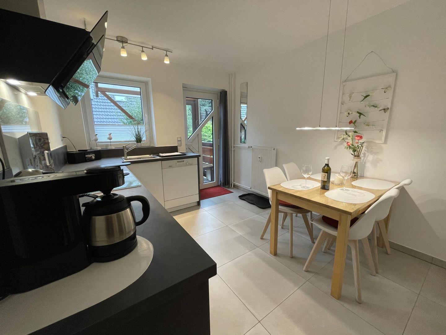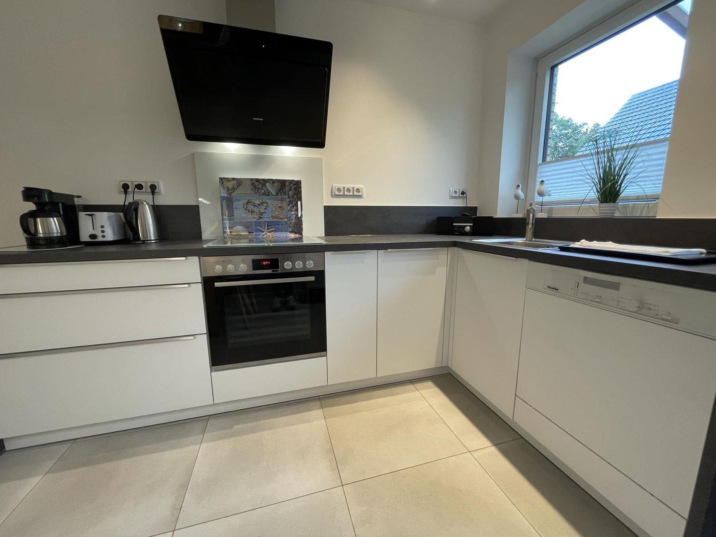In der separaten Küche lässt sich der Alltag wunderbar vergessen: Spülmaschine, Ceranfeld, Backofen, Kaffeemaschine, Toaster – alles da, damit du nicht lange nach dem Korkenzieher suchen musst. Der angrenzende Essplatz ist hell und gemütlich und lädt zum Frühstück mit Blick in den Himmel über Laboe ein.