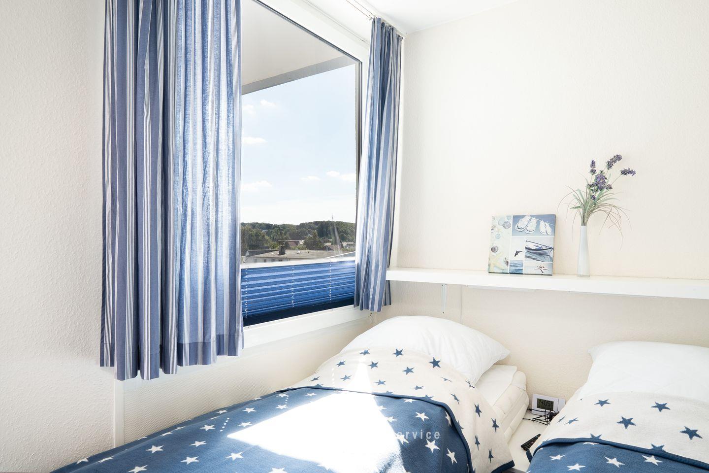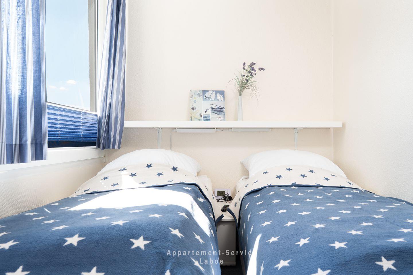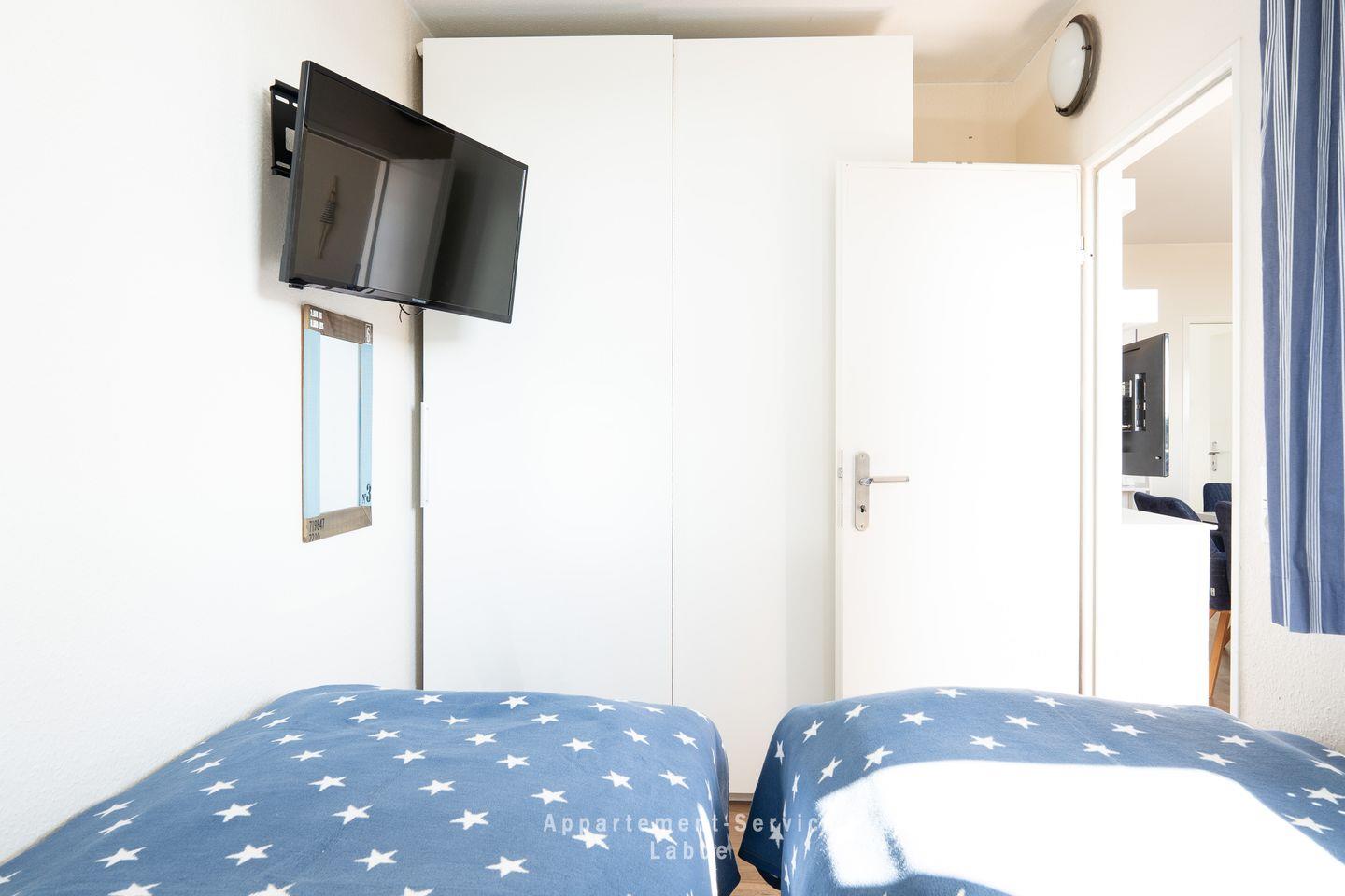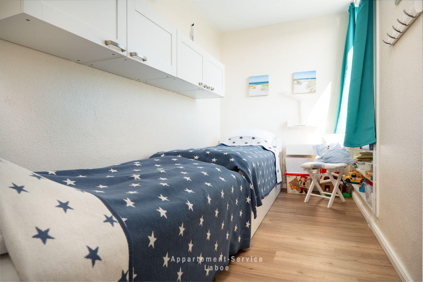 Die beiden Schlafzimmer sind so gestaltet, dass jeder seinen Platz findet. Im ersten Raum stehen zwei komfortable Boxspringbetten, die erholsamen Schlaf versprechen. Das zweite Schlafzimmer ist besonders flexibel und ideal für Familien. Hier befinden sich zwei gemütliche Einzelbetten sowie ein zusätzliches Unterbett, das clever in einer Bettkassette verborgen ist. Dieses eignet sich ausschließlich für Kinder und macht den Raum zum perfekten Rückzugsort für kleine Gäste.