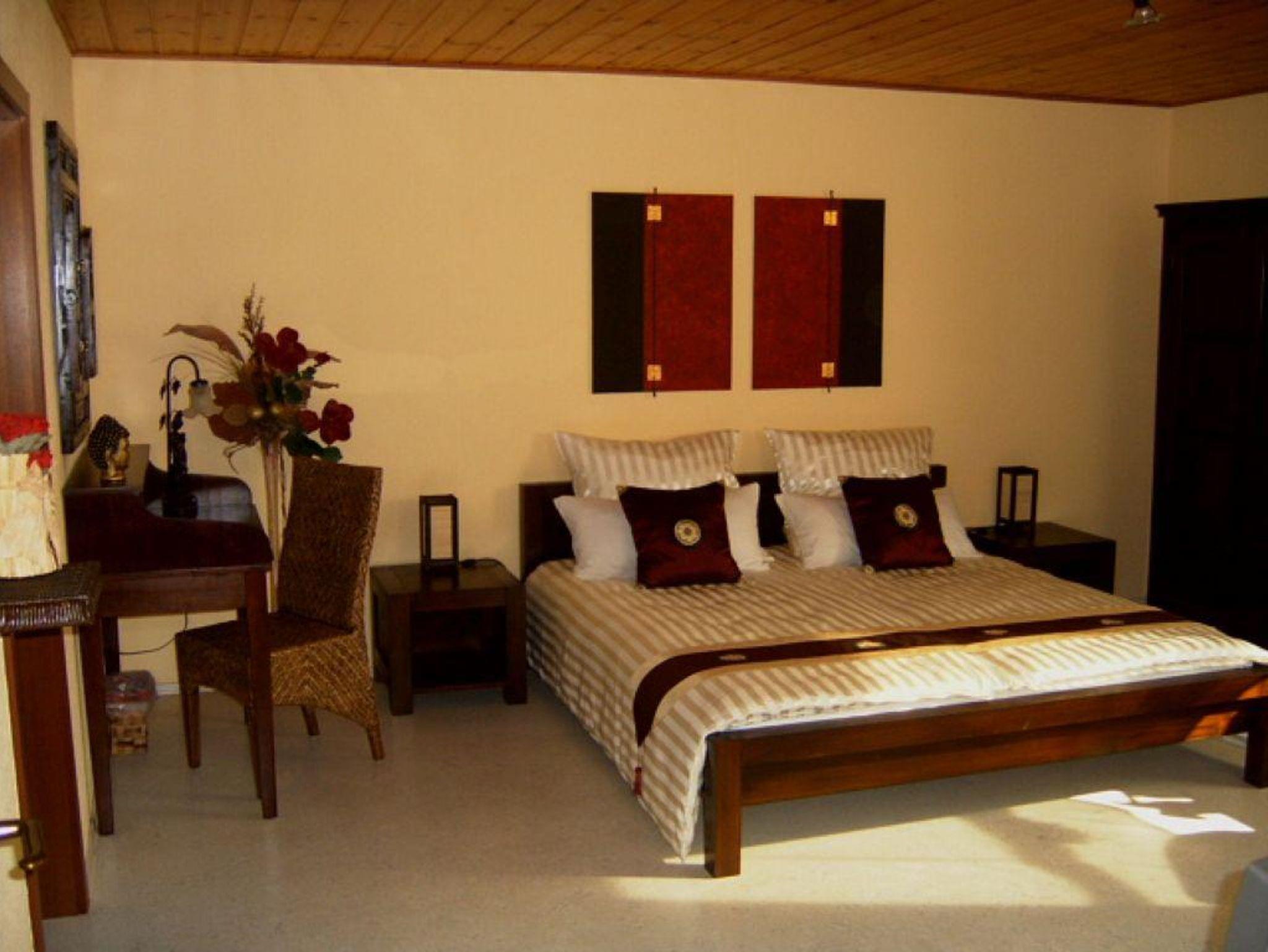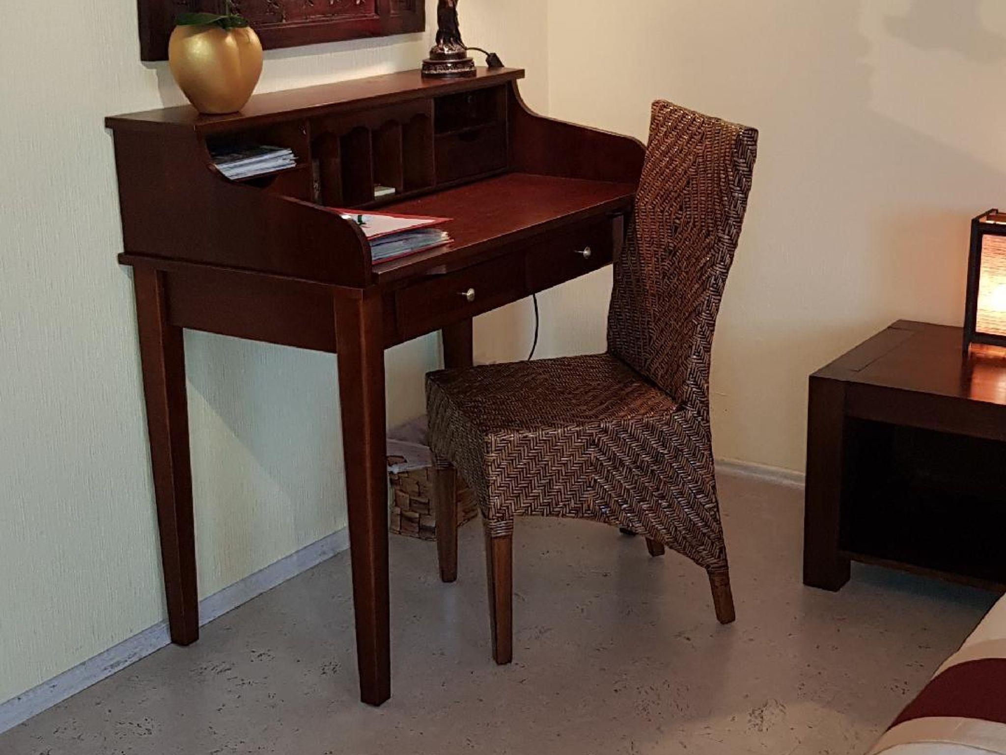 Mit dunklen Massivholzmöbeln und hellem Korkfußboden eingerichteter Wohnschlafraum.