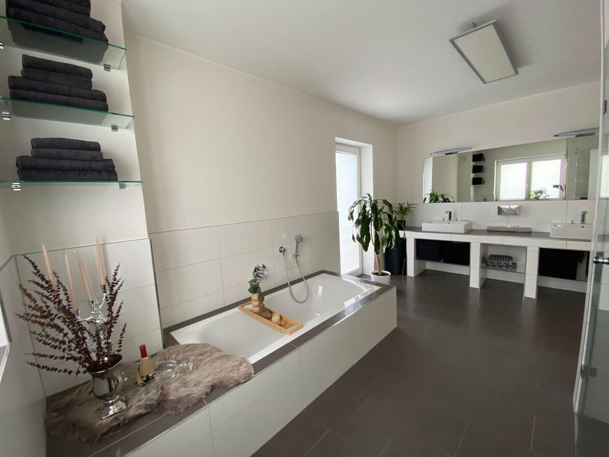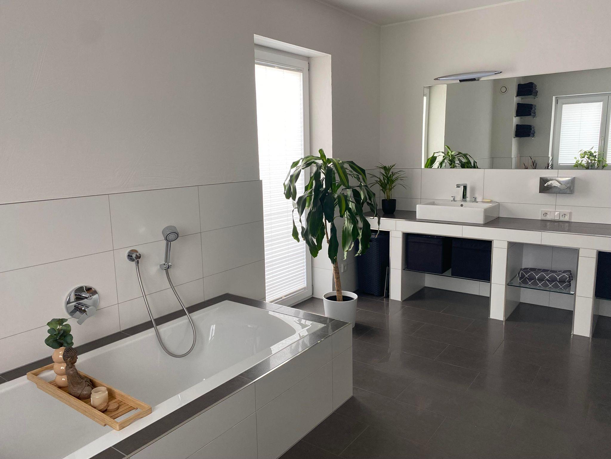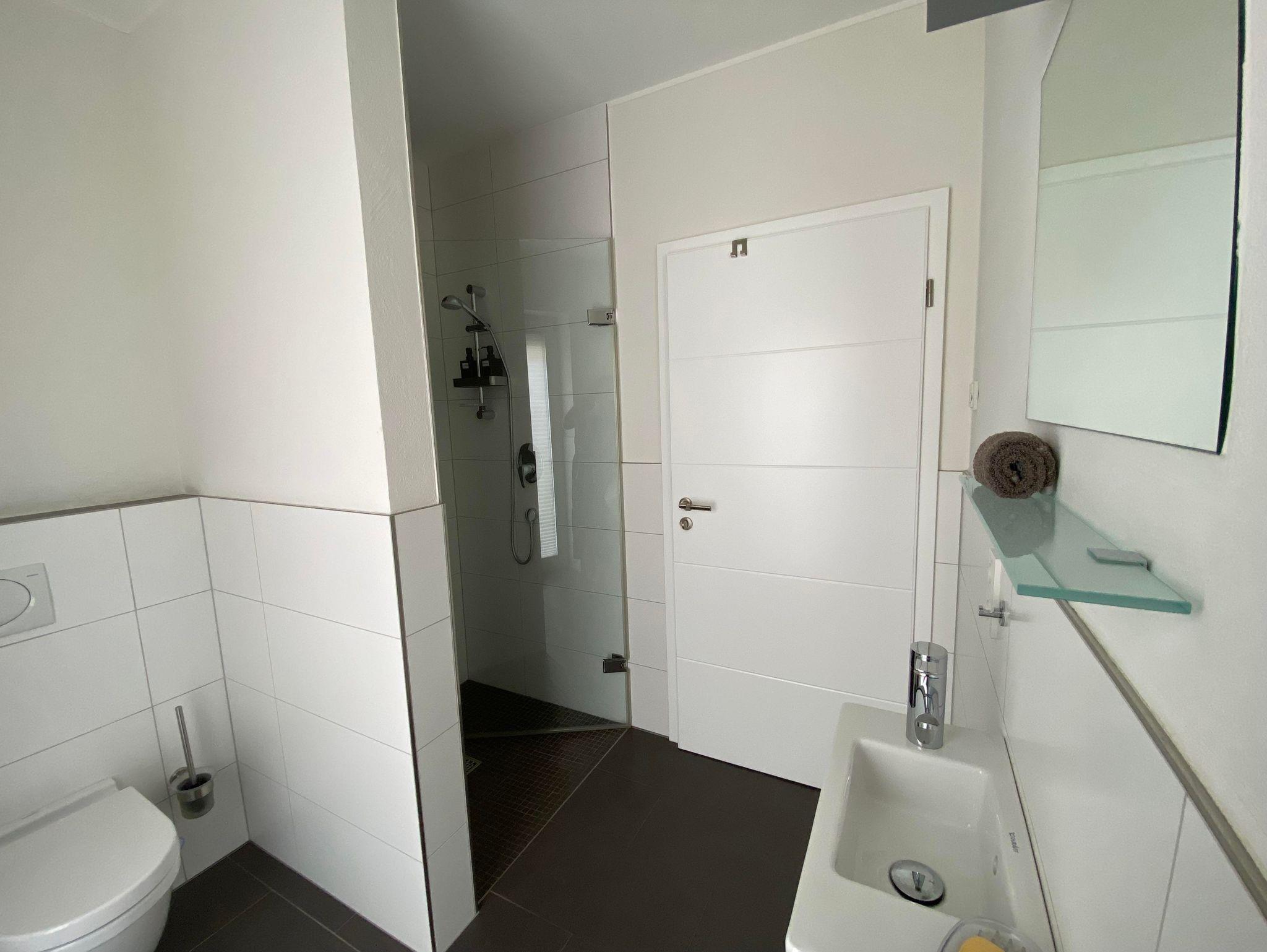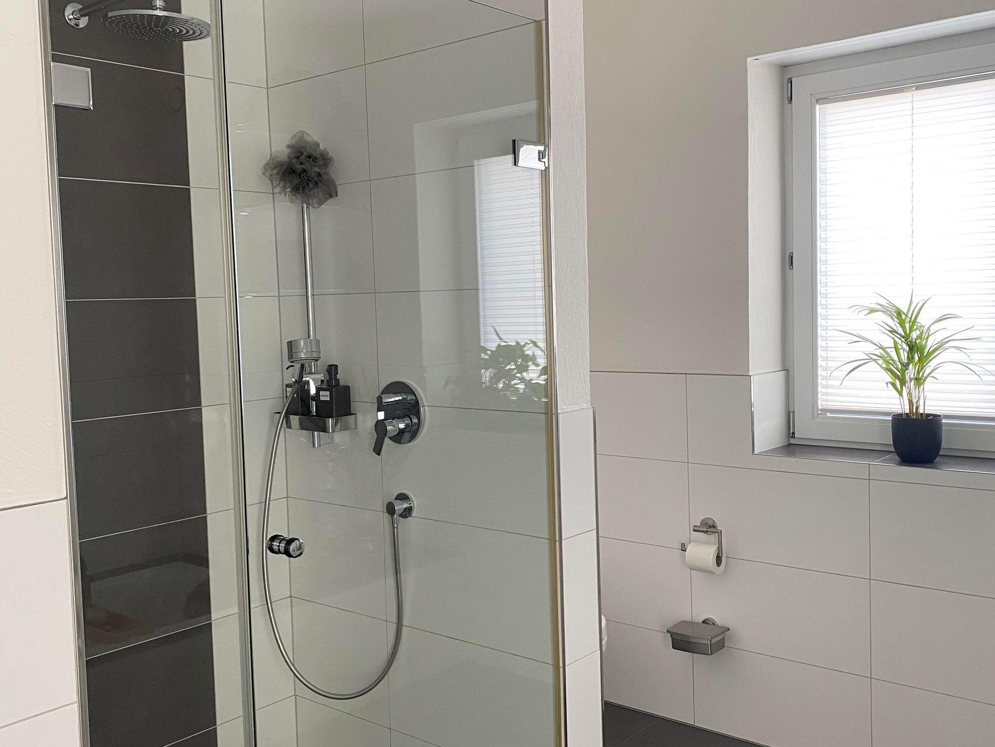 Das Bad der oberen Etage ist mit einer Regenwalddusche und einer Badewanne ausgestattet. Ebenso enthält das Bad im EG eine große Dusche. Von hier kann man üer die Terrasse zur Sauna gelangen.