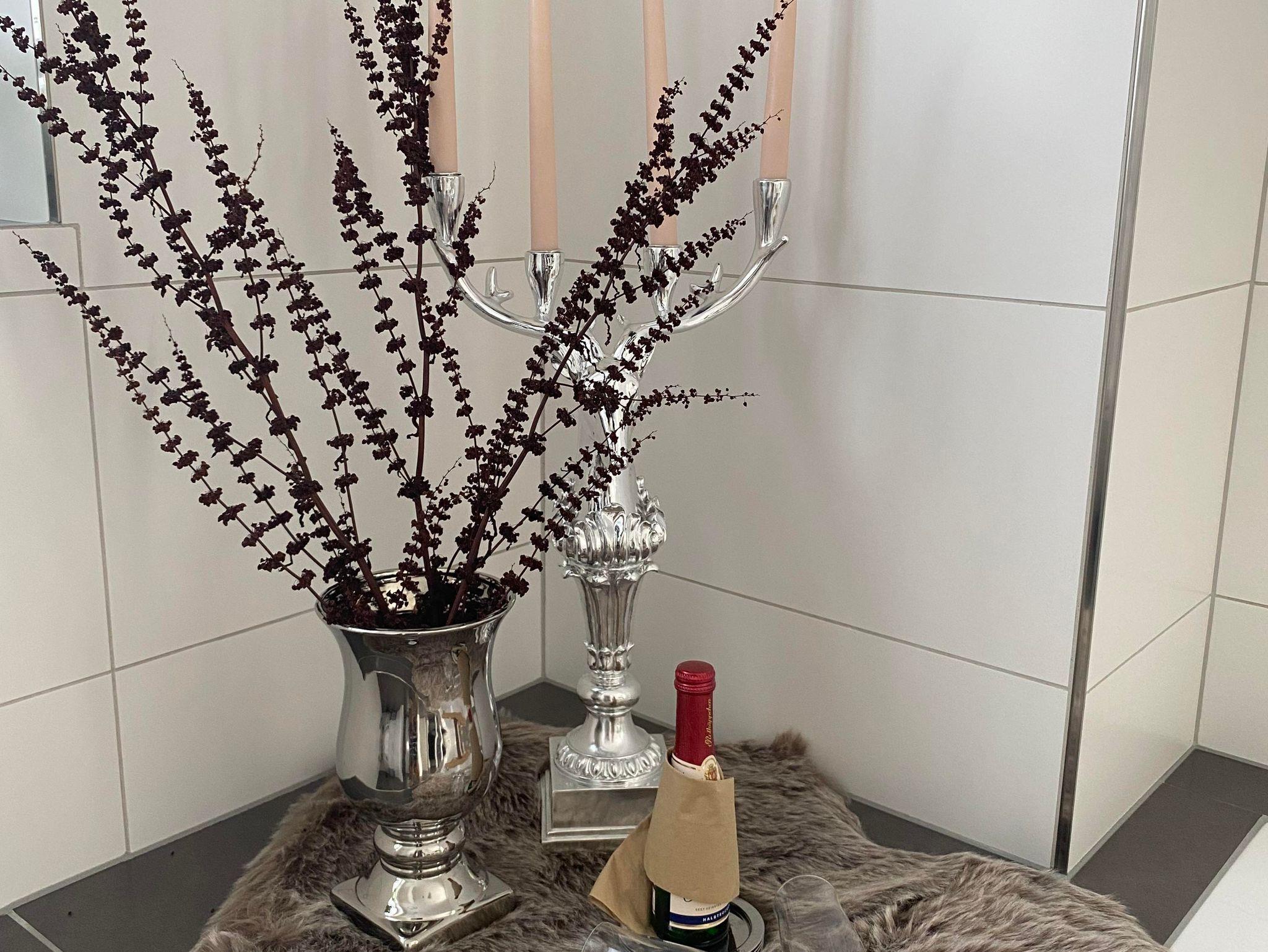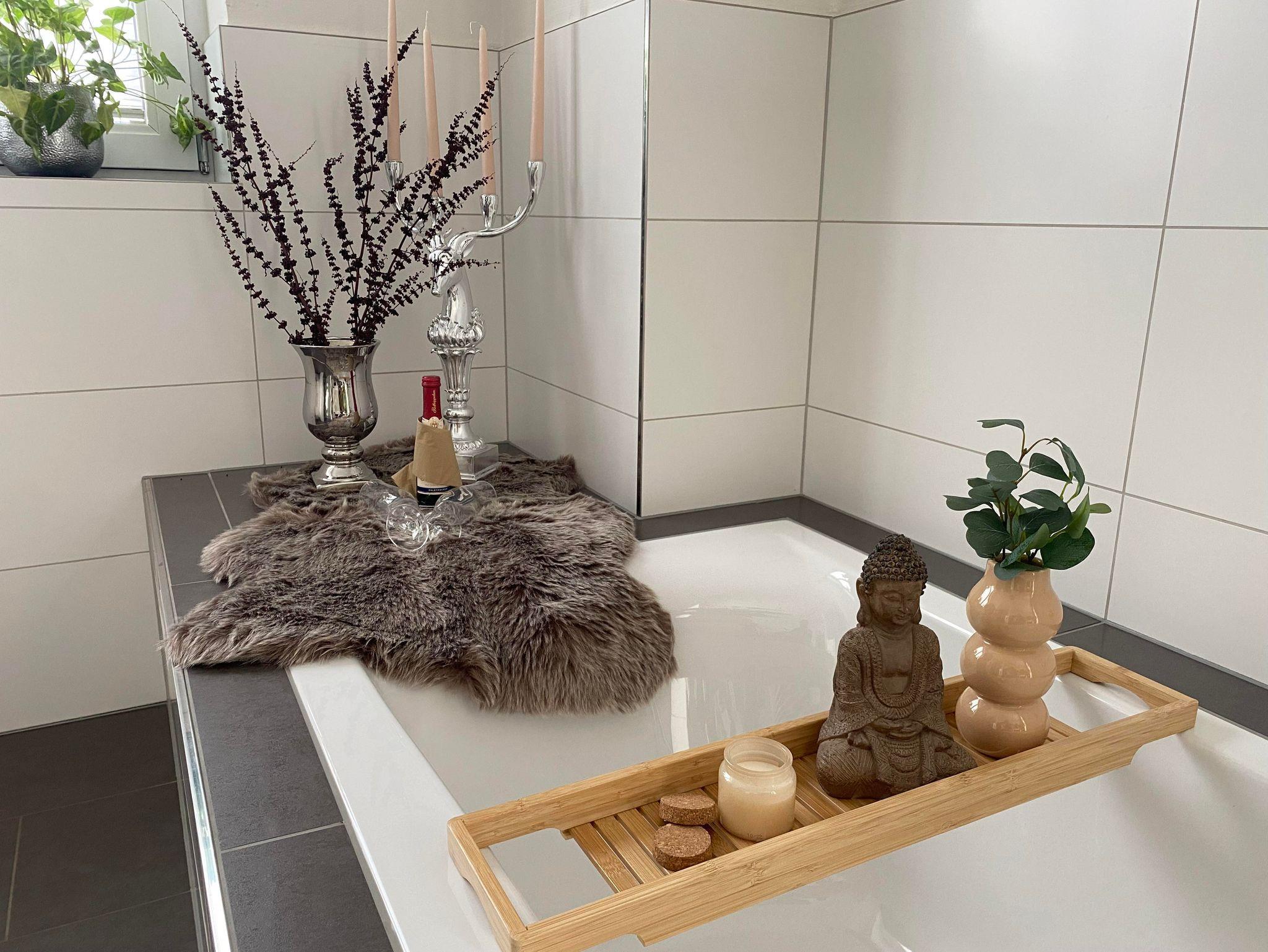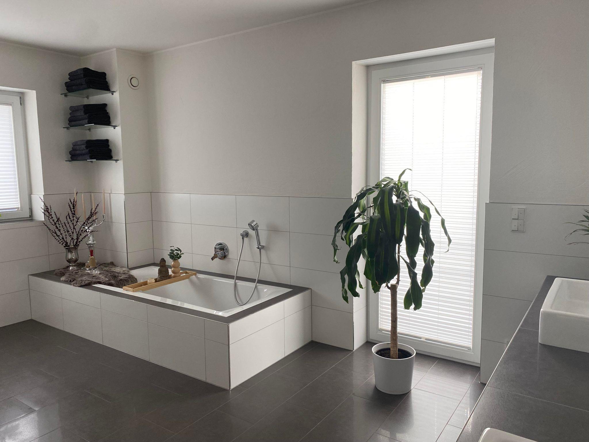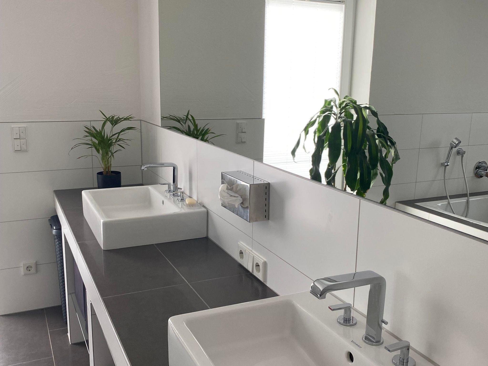 Das Bad der oberen Etage ist mit einer Regenwalddusche und einer Badewanne ausgestattet. Ebenso enthält das Bad im EG eine große Dusche. Von hier kann man üer die Terrasse zur Sauna gelangen.