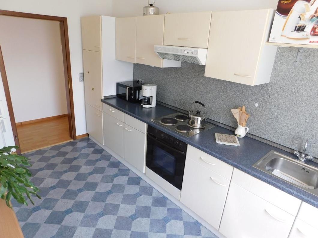 Ferienwohnung mit 1 DZ, Wohn-/Esszimmer, Küche und Bad mit Dusche und Badewanne.