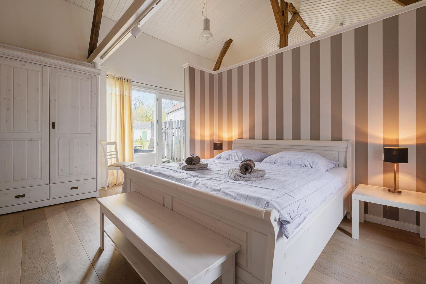 Im hinteren Bereich des Wohnraumes wurde durch eine Trennwand ein Schlafbereich mit Doppelbett (180 x 200 cm) und Kleiderschrank geschaffen. Hier geht es auch zur ungestörten Terrasse am idyllischen Wassergraben, der den Gutshof umgibt. Hier schwimmen Enten vorbei und auch ein Fischreiher lässt sich immer wieder mal blicken.