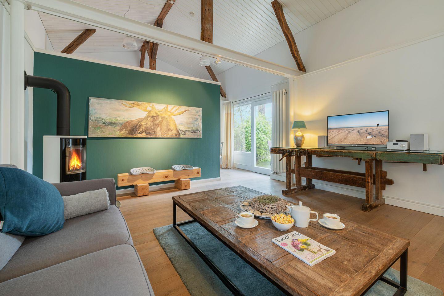 Die großzügige Raumaufteilung und das individuelle Mobiliar begeistern schon bei der Ankunft. Im Wohn-Essbereich steht u. a. die alte „Klüterbank“, aus der ein einzigartiger Ablagetisch gebaut wurde und Oma´s restaurierter, alter Küchenschrank. Zwei gemütliche Sofas, ein TV und der Ofen laden zum Entspannen ein. Der große Esstisch bietet viel Platz für gemeinsame Malzeiten oder Spieleabende.
