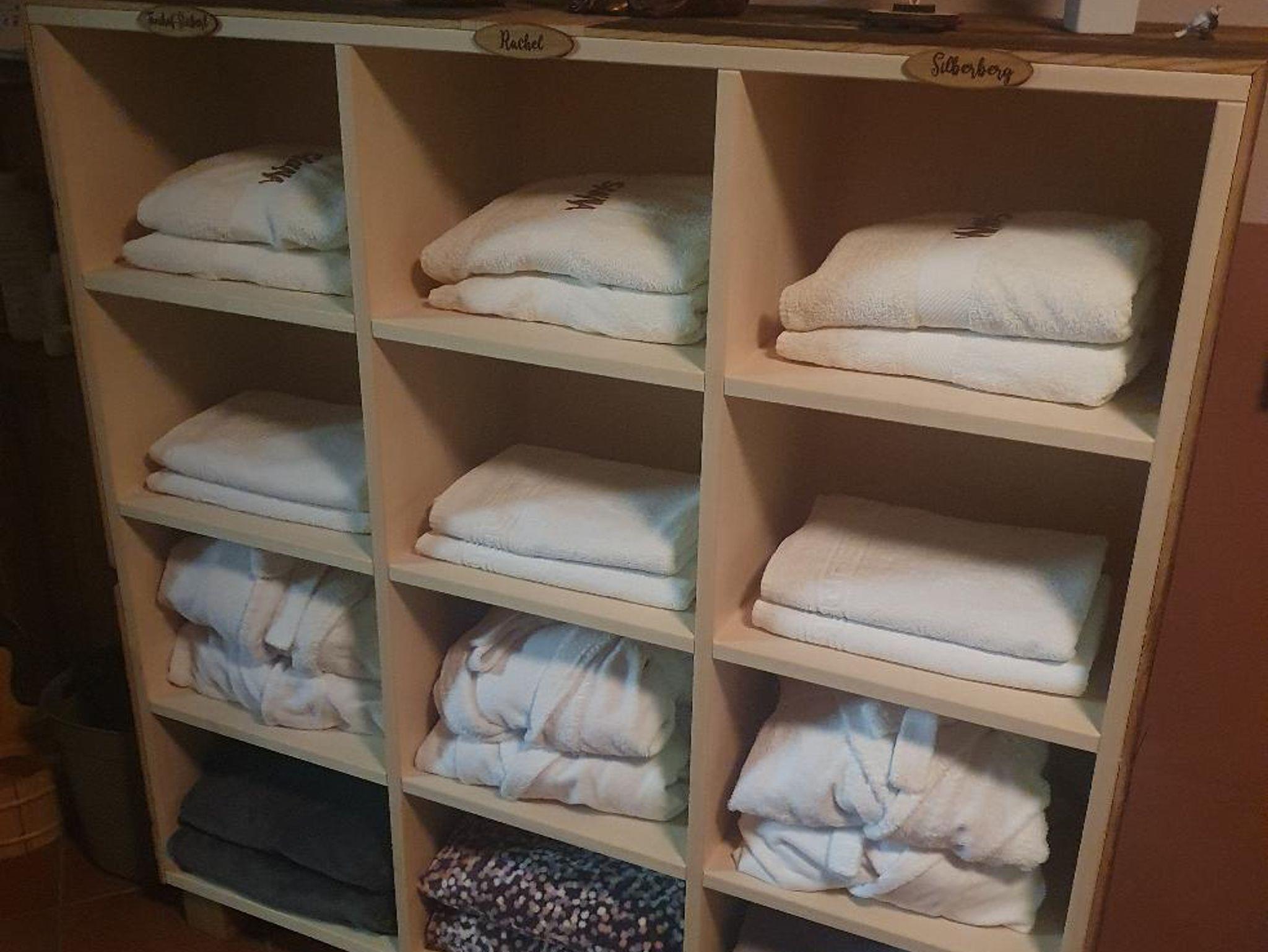 Handtücher und Bettwäsche stehen unseren Gästen zur Verfügung. Für den Saunabereich liegen pro erwachsene Person je ein Sauna- und Duschtuch, ein Bademantel und eine Kuscheldecke bereit.