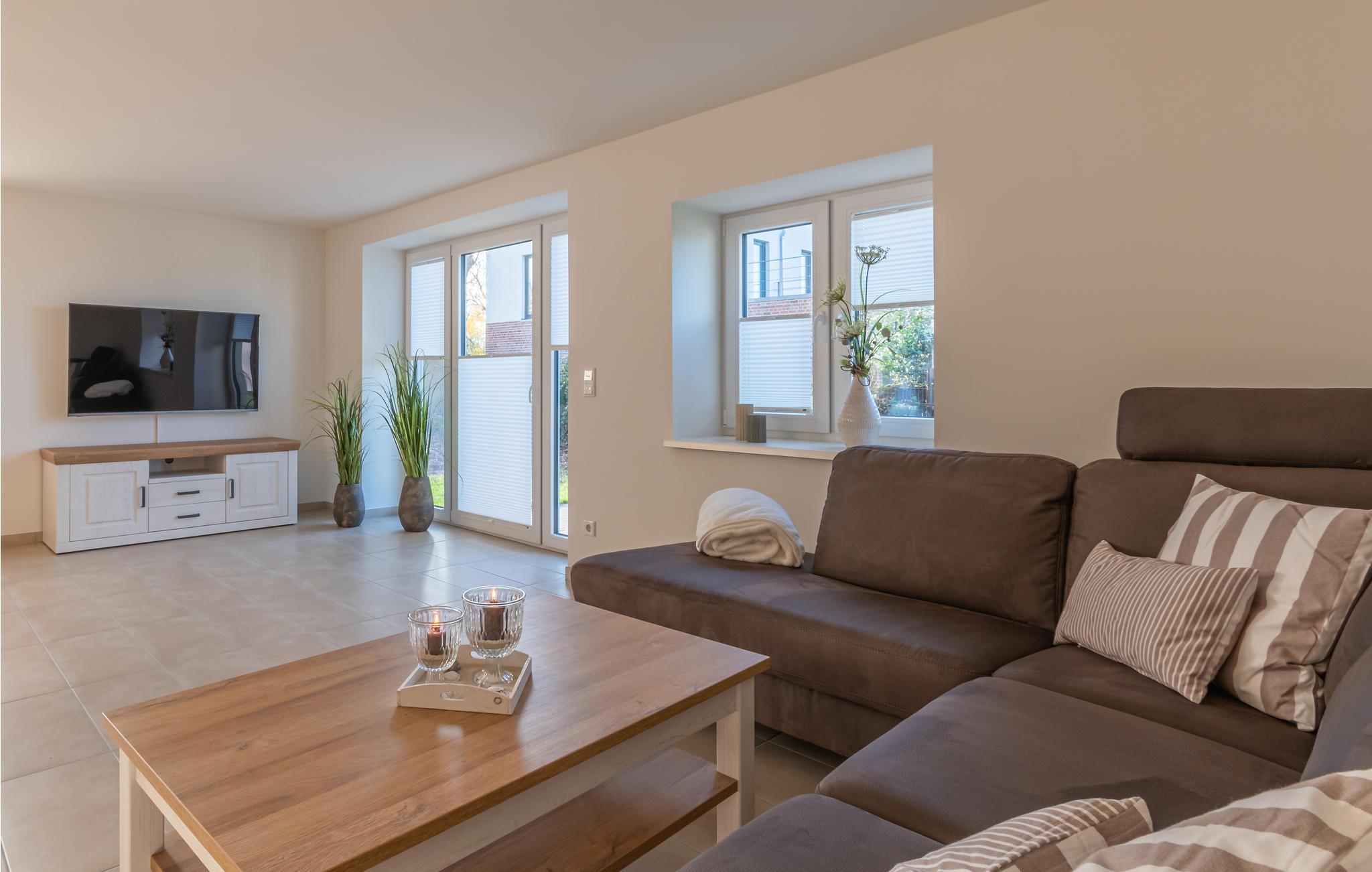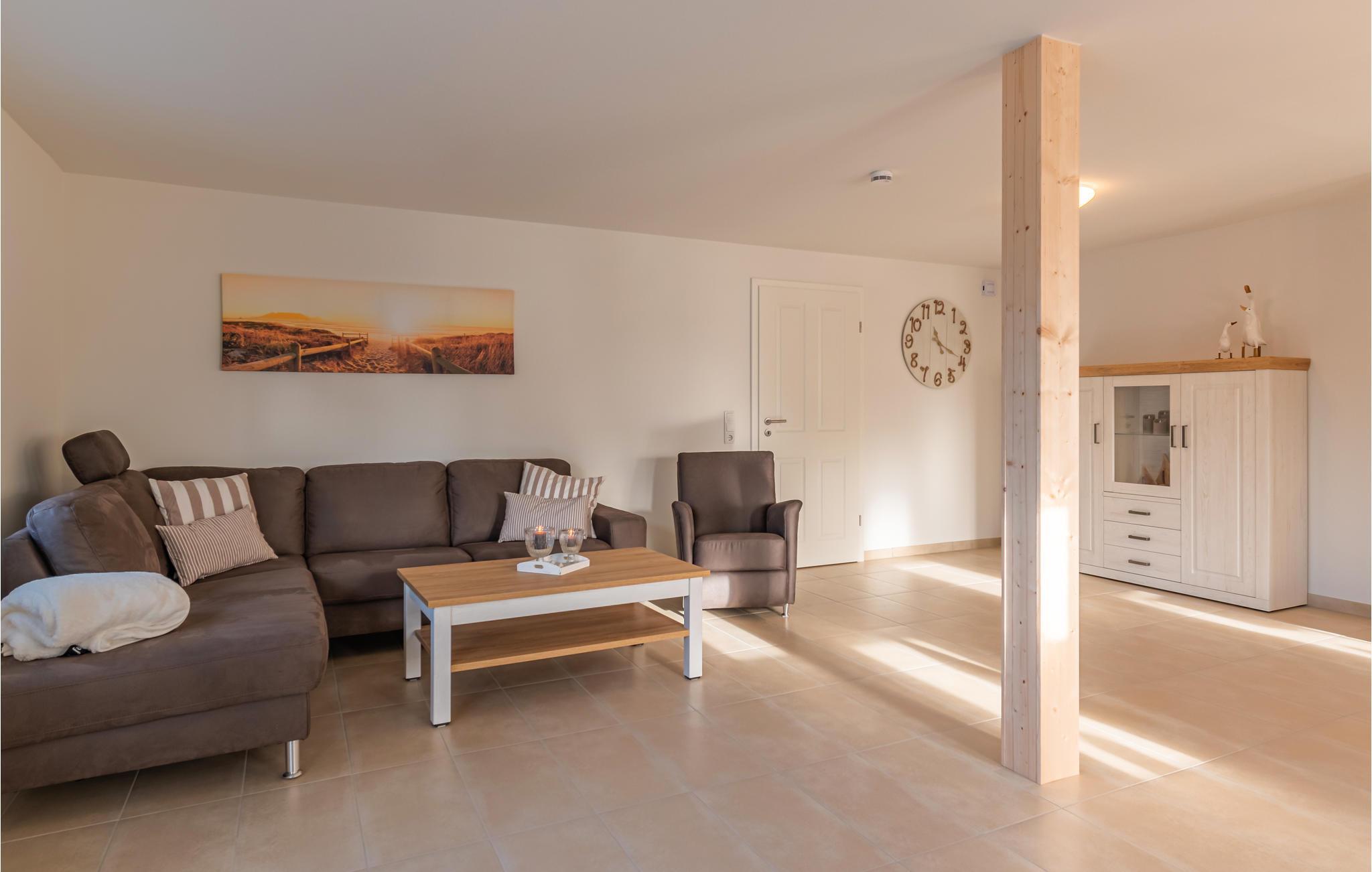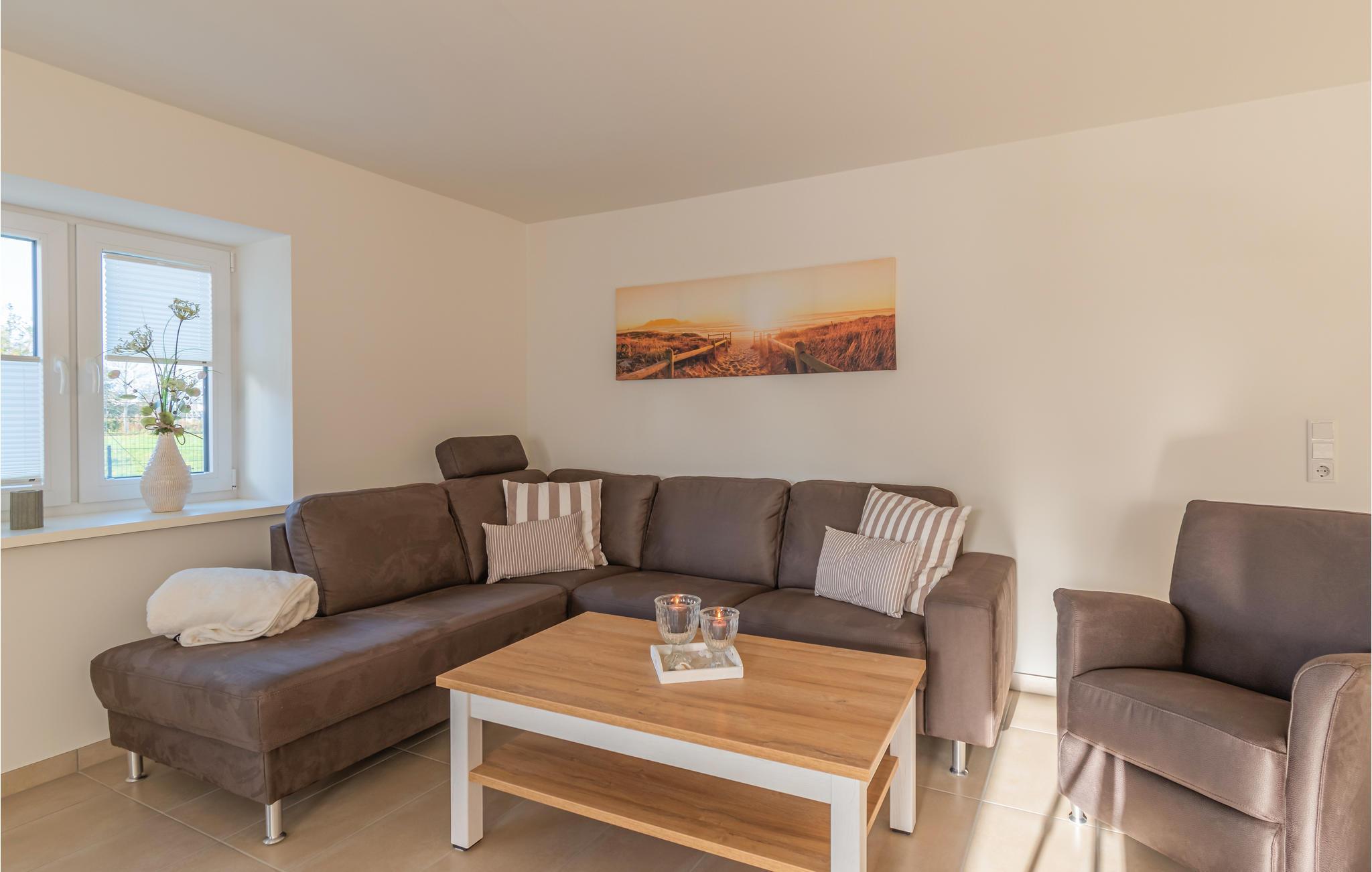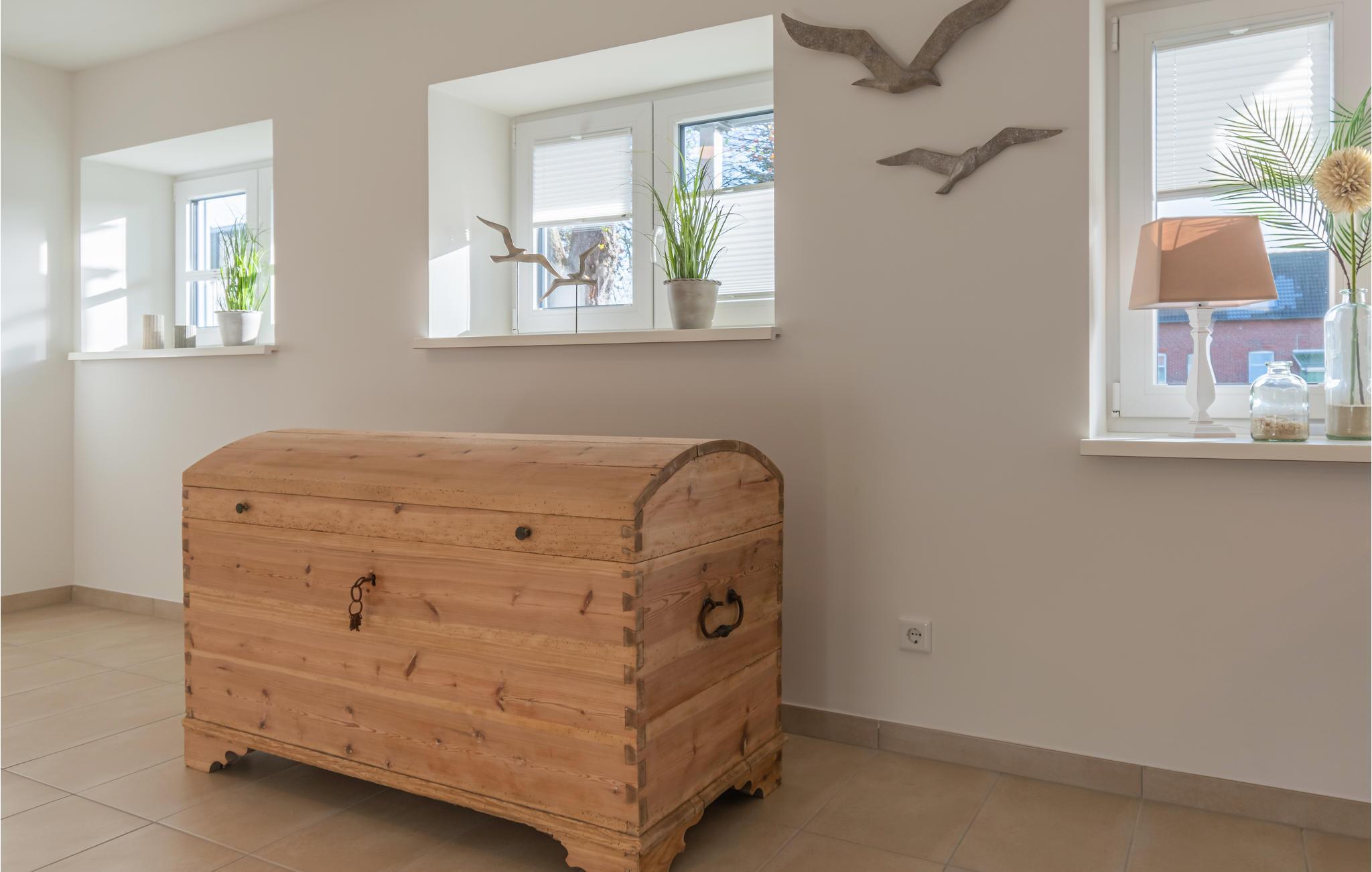 På terrassen kan du grille i solen og nyte Nordsjø-luften. Det store badet mangler ikke noe, og det er også gulvvarme i hele leiligheten. Nyt utsikten over det vidstrakte nordfrisiske landskapet med en bok eller et glass vin, og la hverdagen bli hjemme.