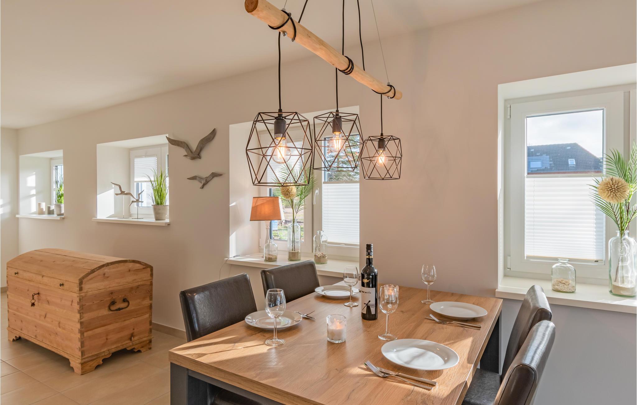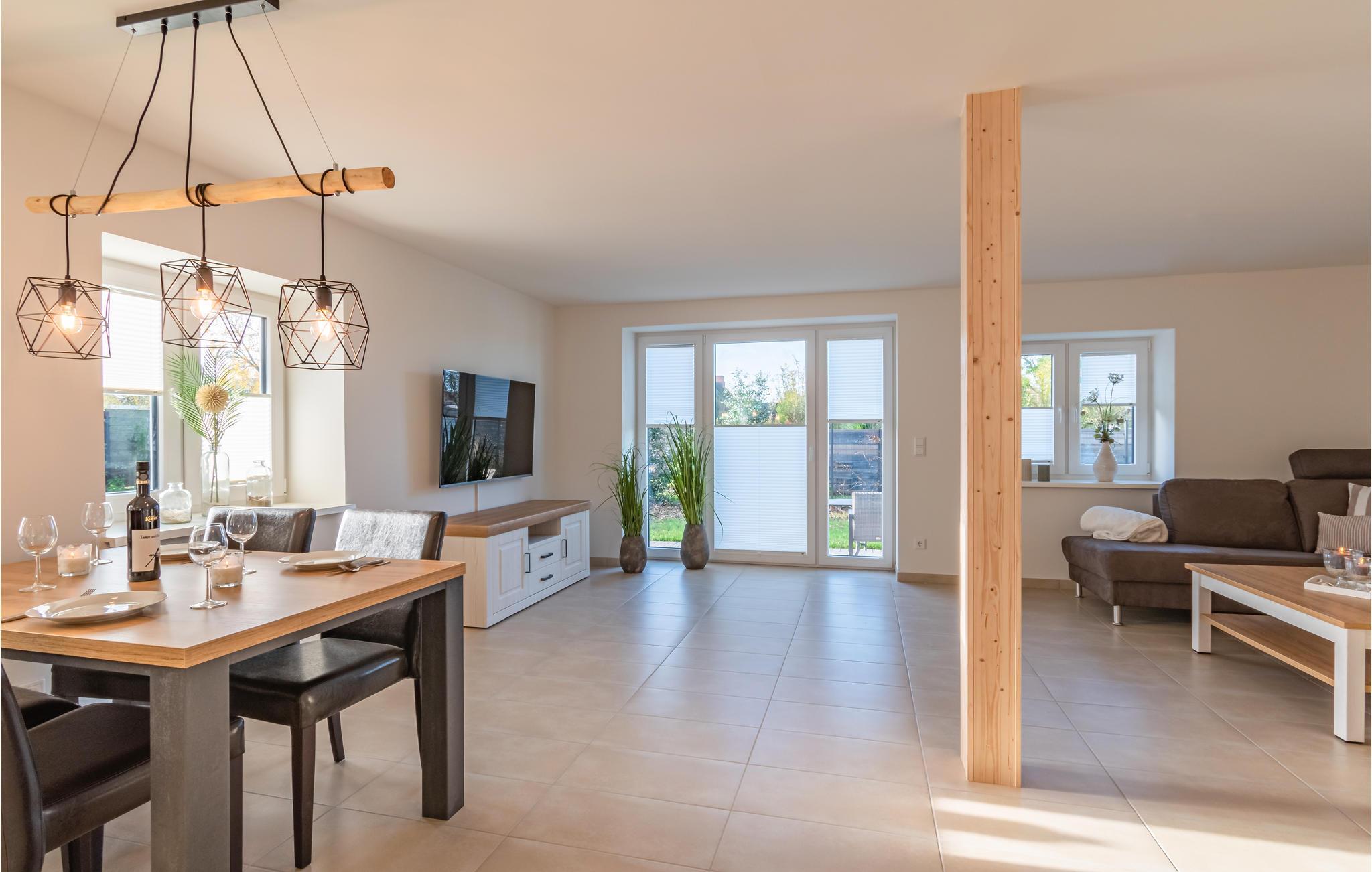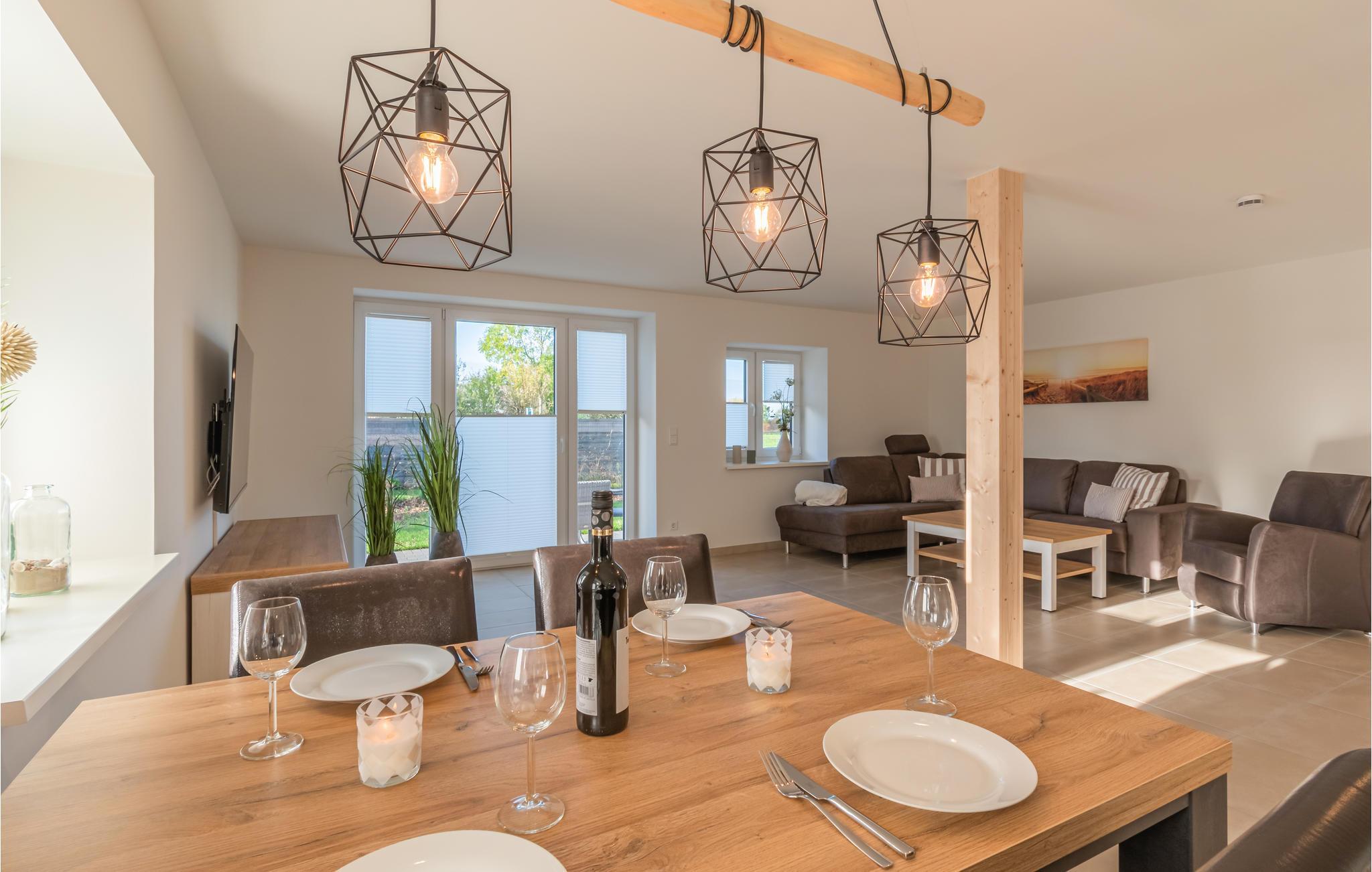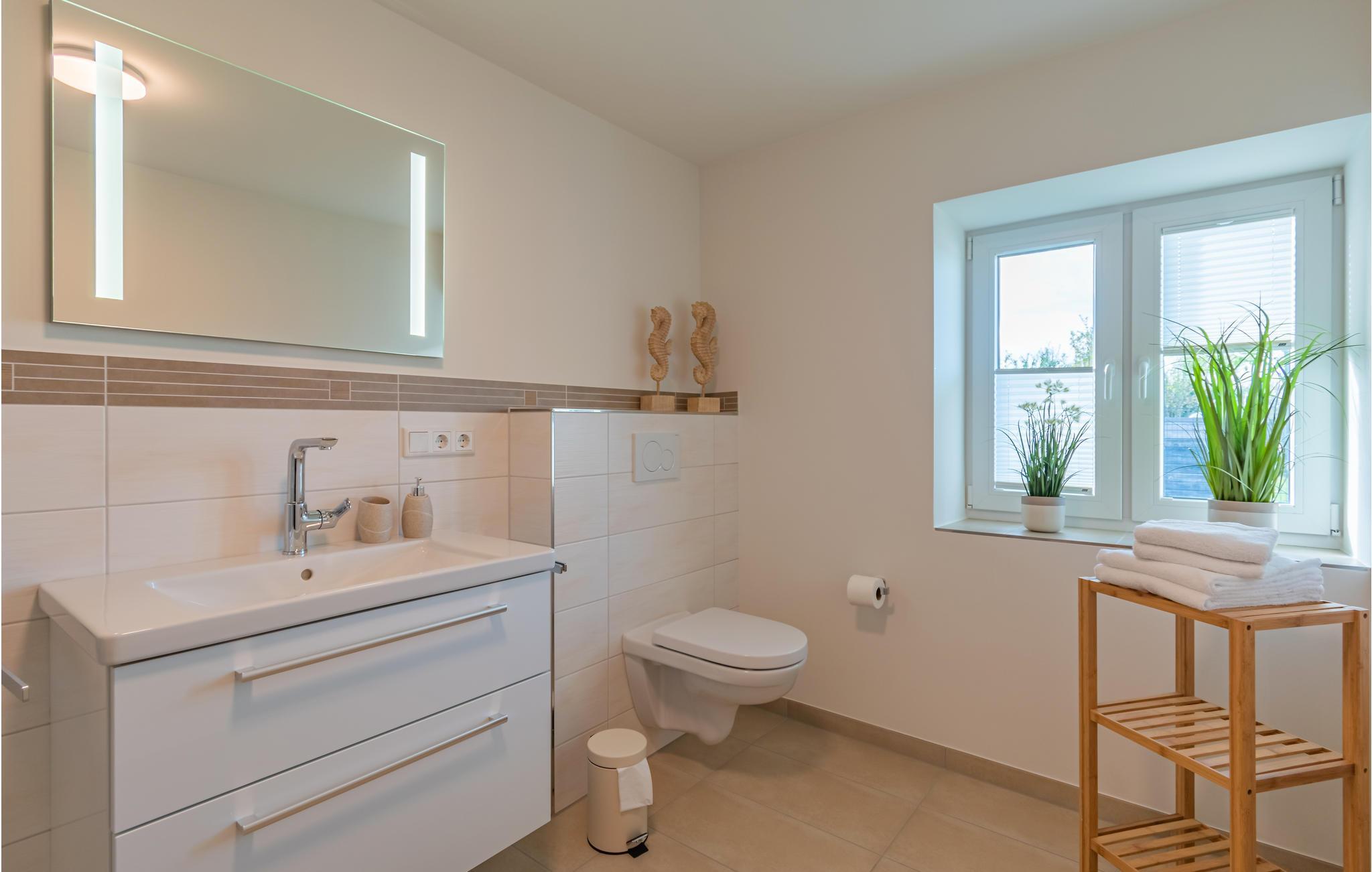 På terrassen kan du grille i solen og nyte Nordsjø-luften. Det store badet mangler ikke noe, og det er også gulvvarme i hele leiligheten. Nyt utsikten over det vidstrakte nordfrisiske landskapet med en bok eller et glass vin, og la hverdagen bli hjemme.